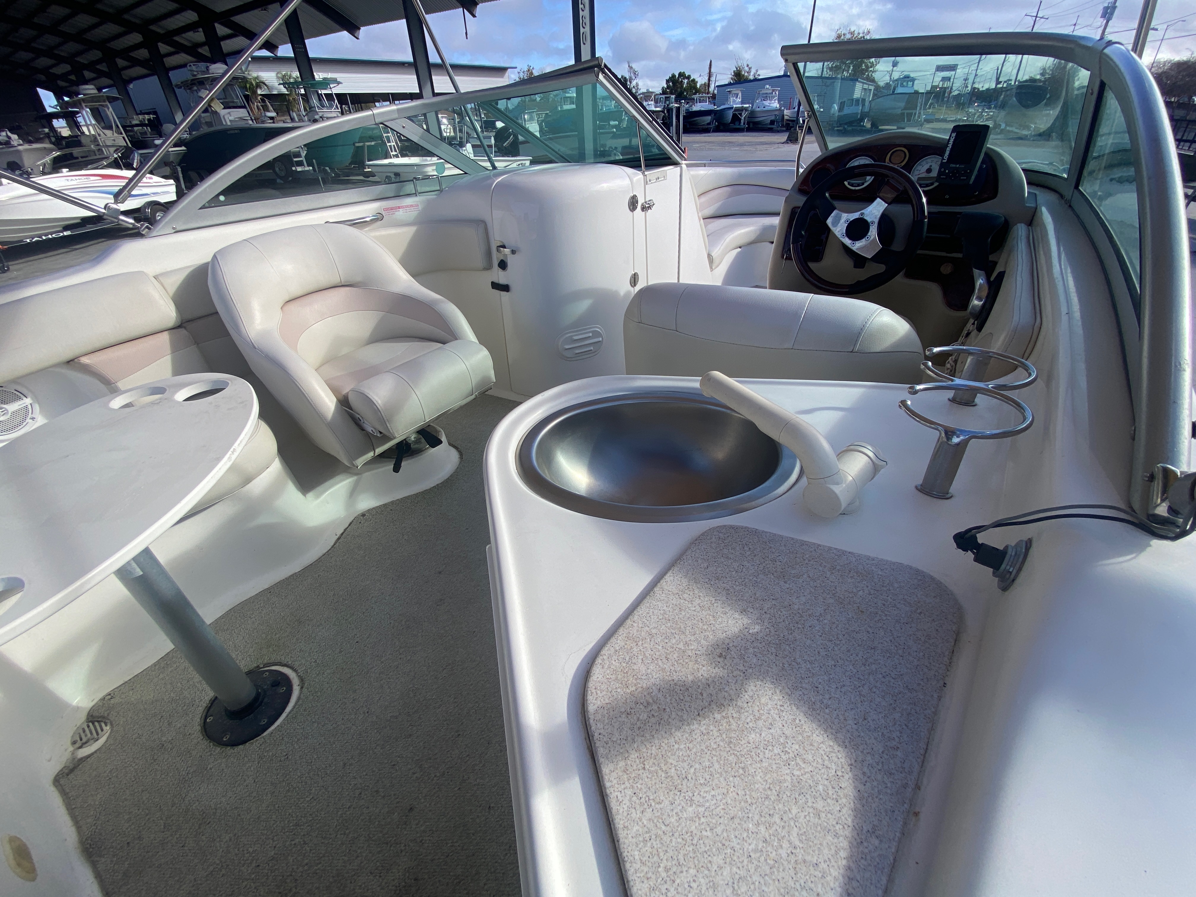 The boat comes on a tandem-axle trailer, making transport and storage easy. Upholstery is in great condition, reflecting the care this boat has received. A Bimini top provides shade on sunny days, and a brand-new Sony stereo system with a Bazooka subwoofer delivers excellent sound on the water.