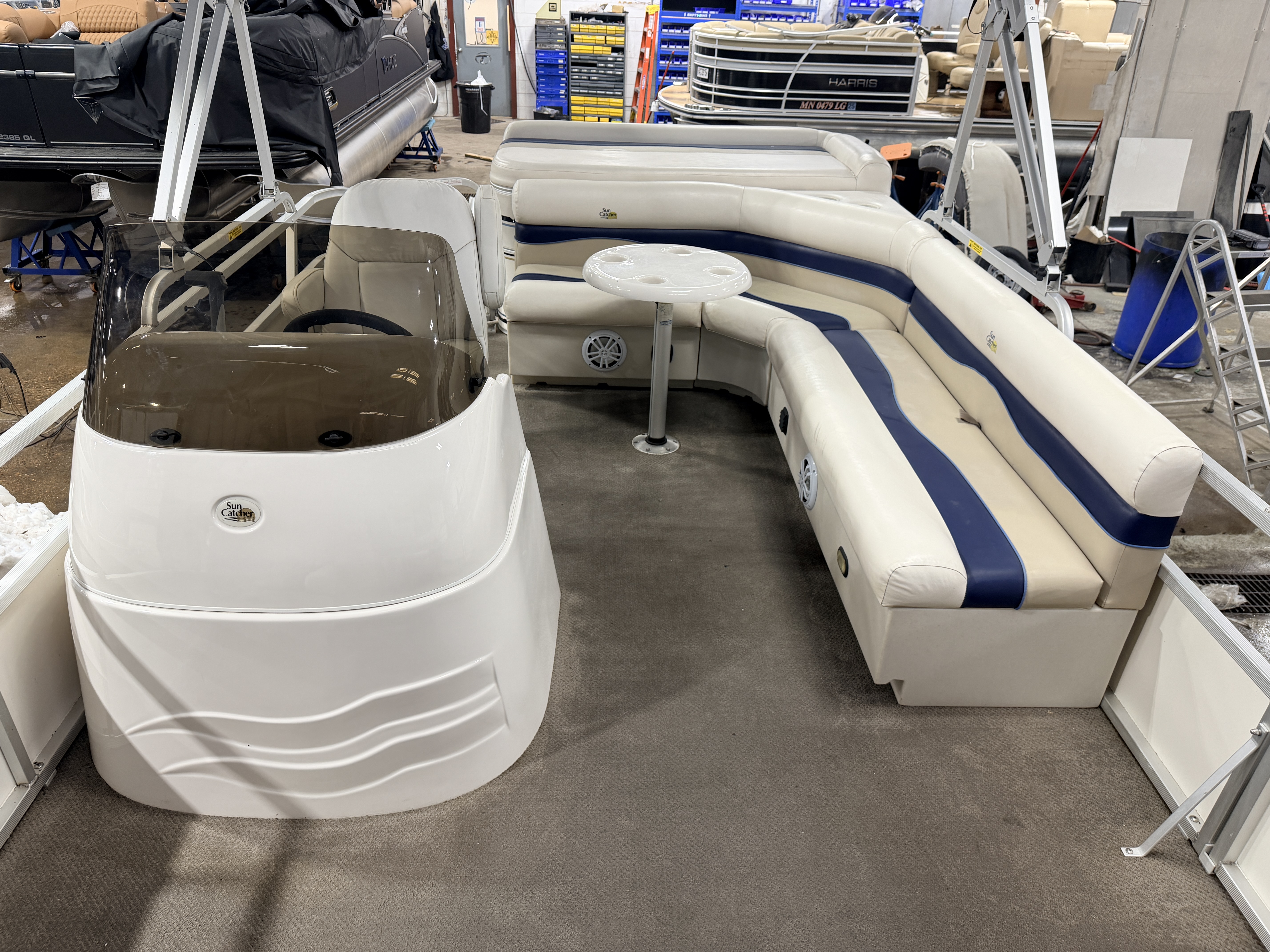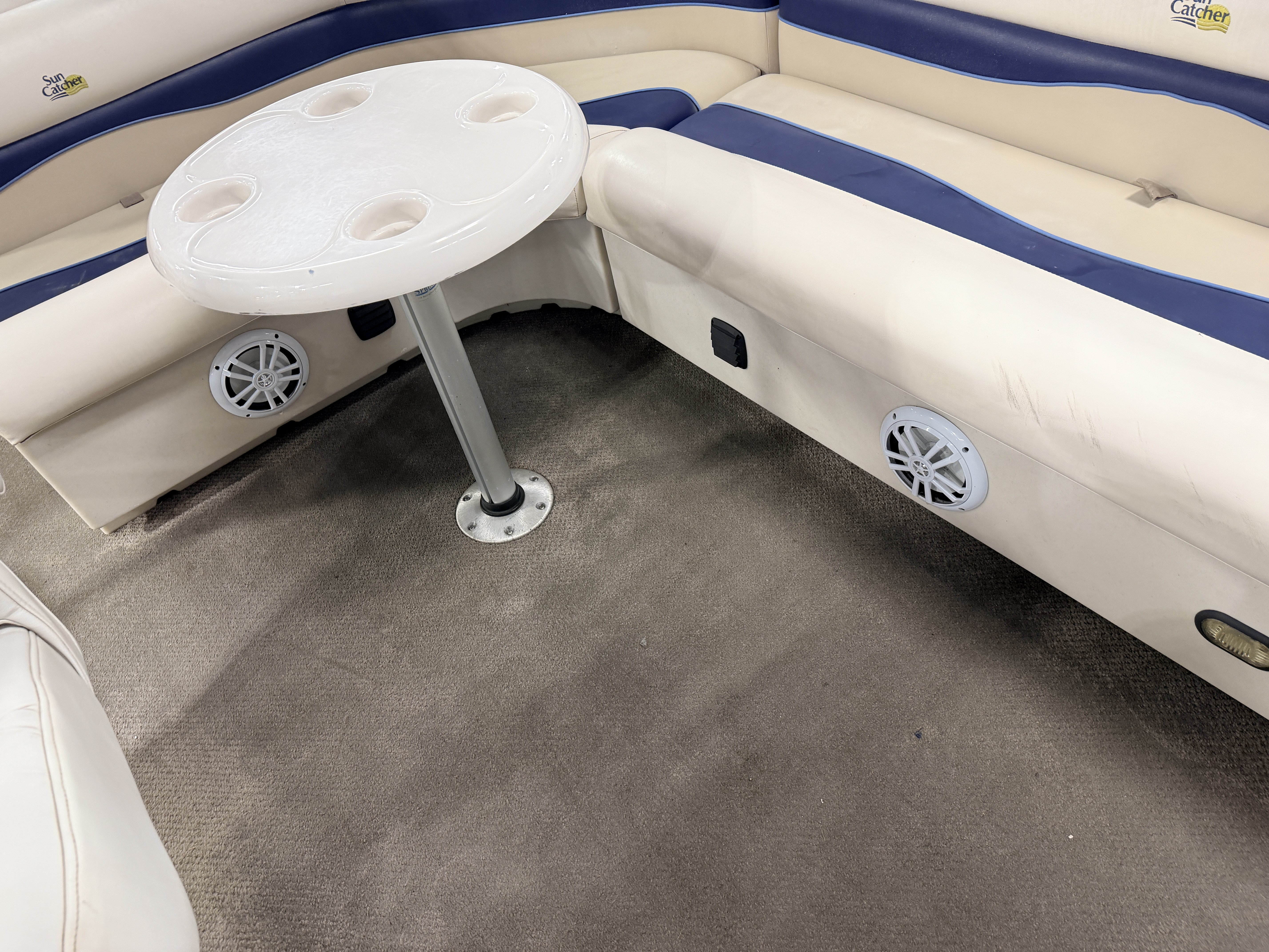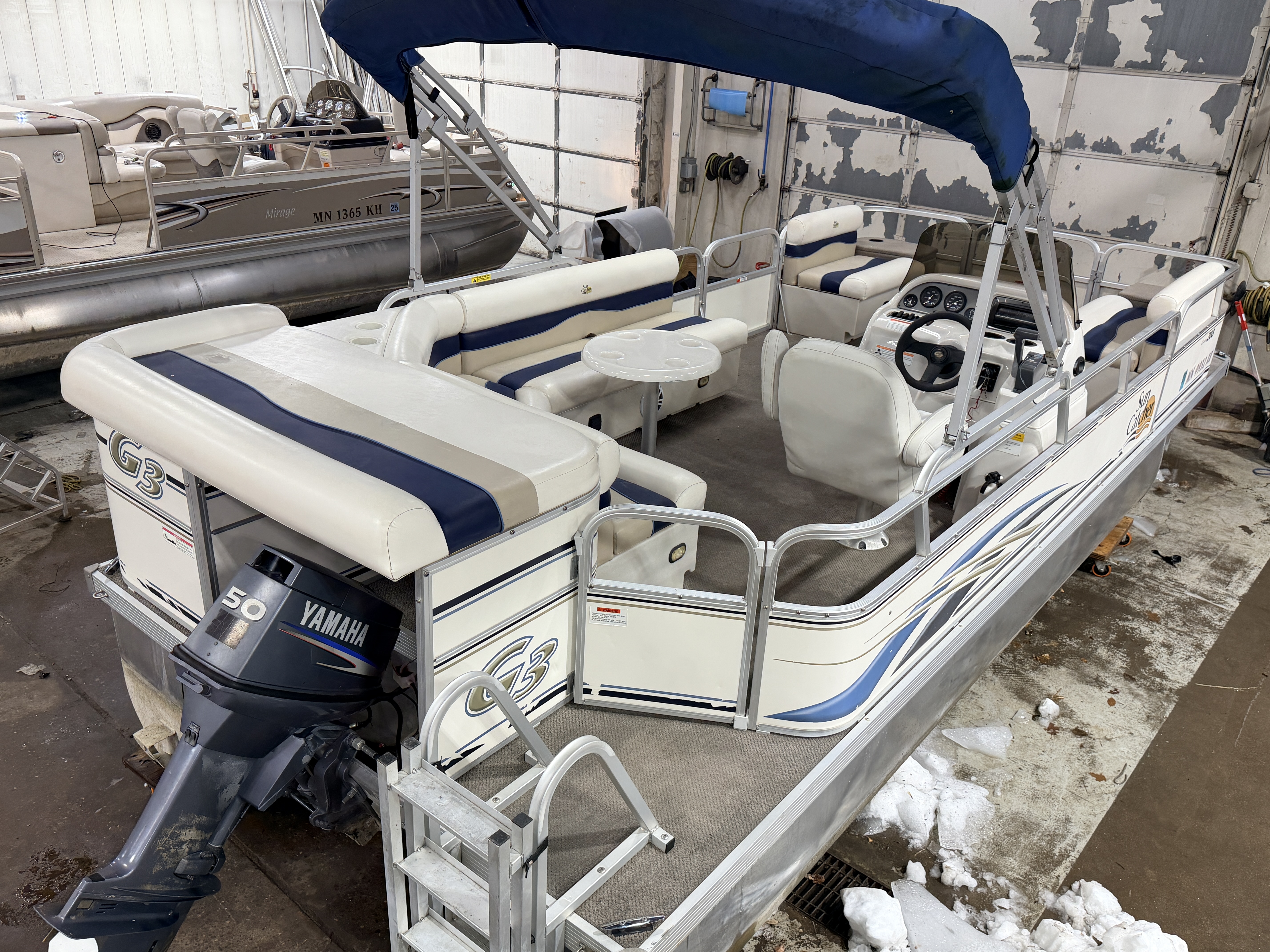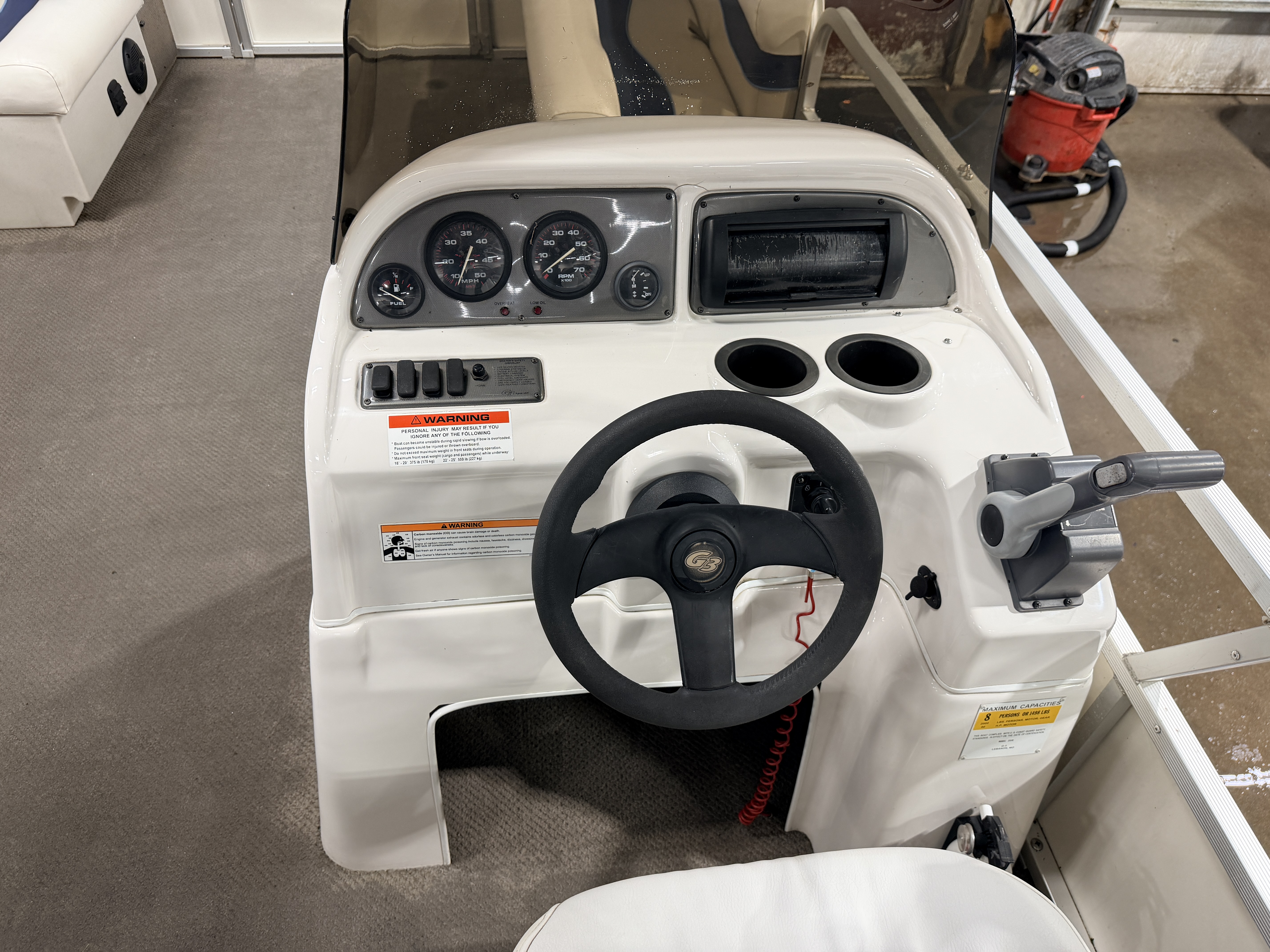 2007 G3 SunCatcher 20 Cruise Pontoon with 50HP Yamaha Outboard. This cruise model pontoon features 2 couches in the bow with a mini console in each corner with a cup holder and storage compartment. The helm features a Speedometer, Tachometer, Fuel and Trim gauge. There is a Sony Cd player stereo system with additional auxiliary input. The captain's chair is a low back sport seat with swivel, slide and recline functions as well as fold up arm rests. There is a L shaped couch on the port side with table. Behind the L couch is a sun deck. There is a swim platform on the bow along with another at the stern with a fold down swim ladder.