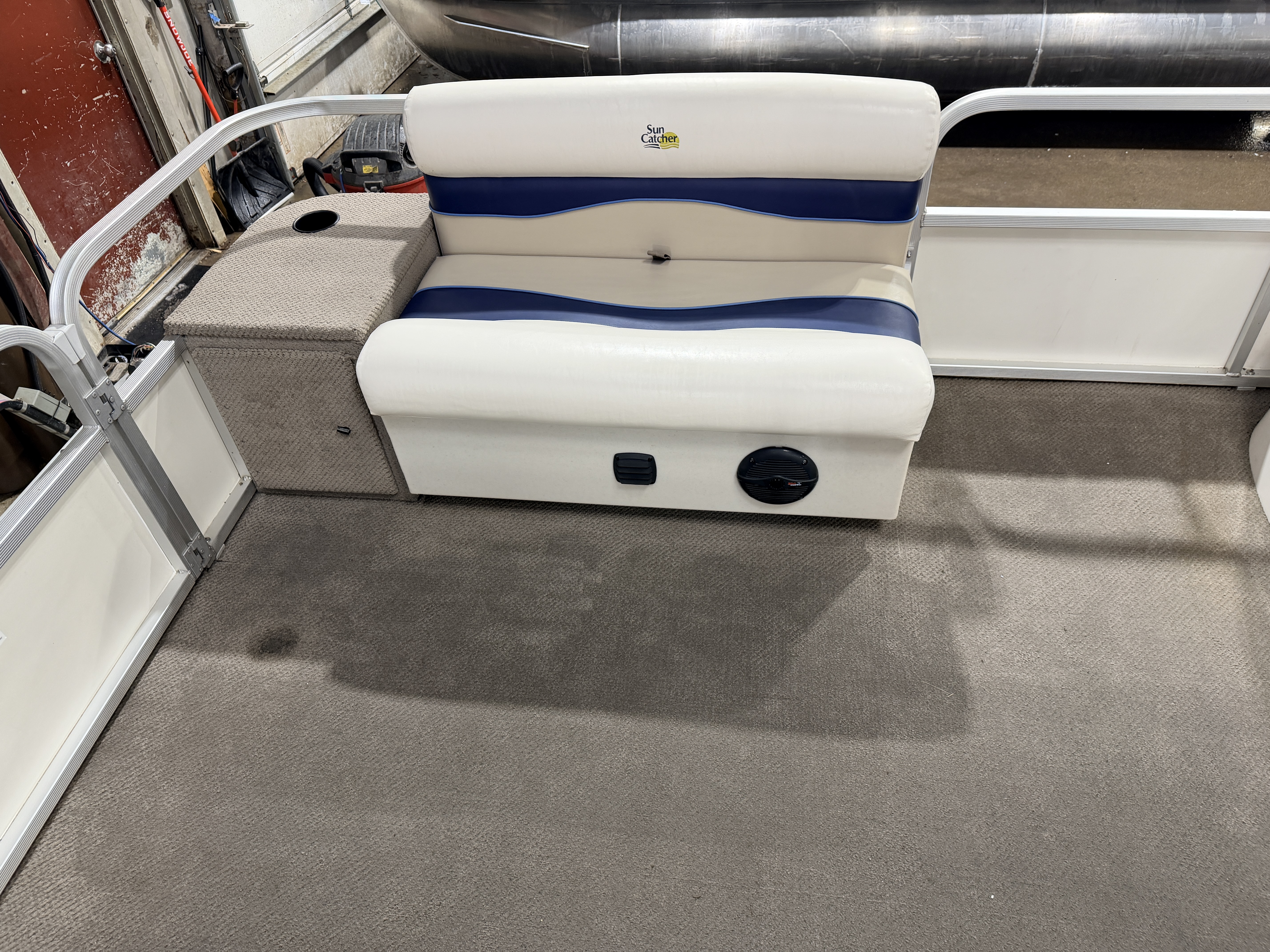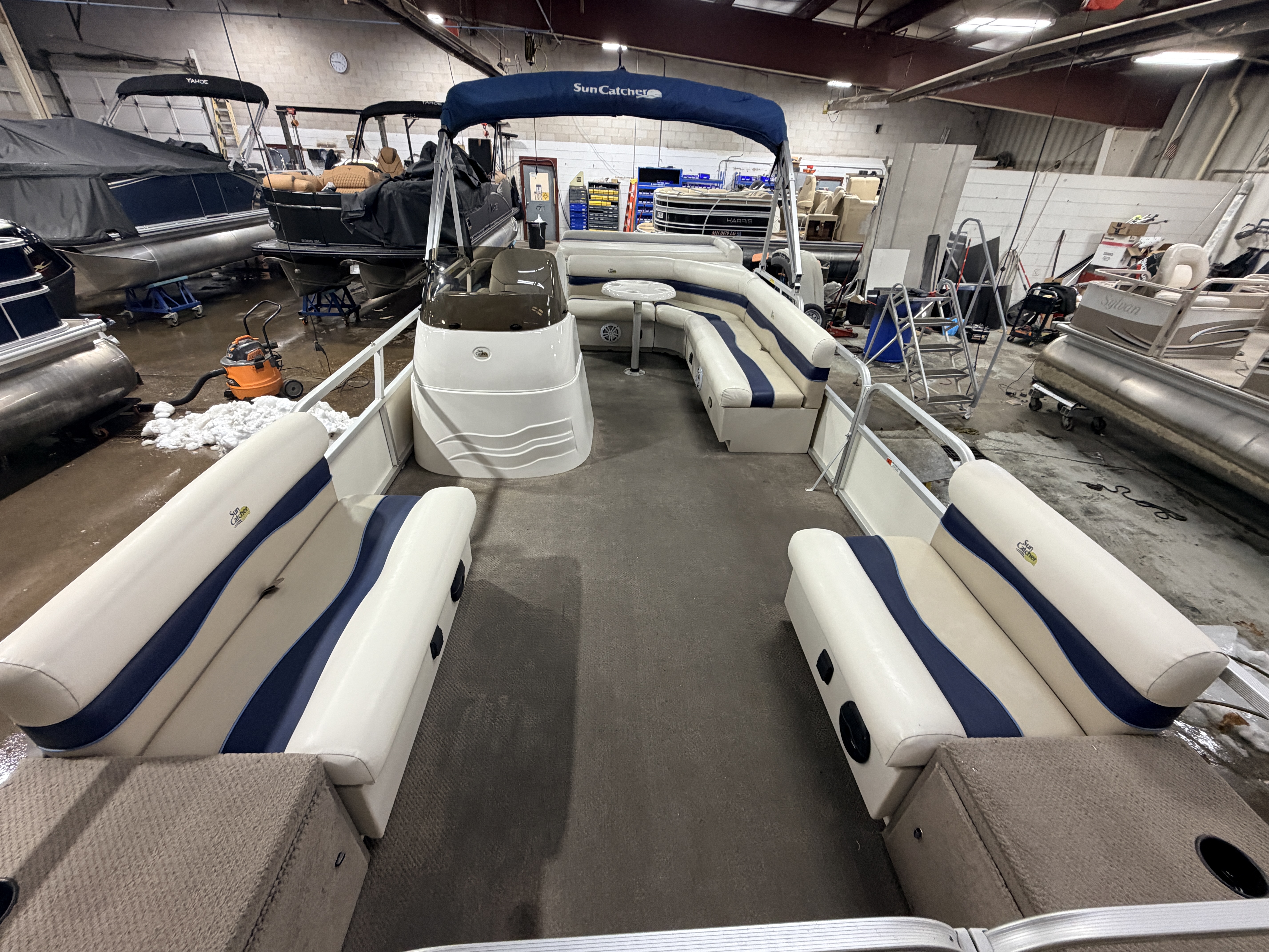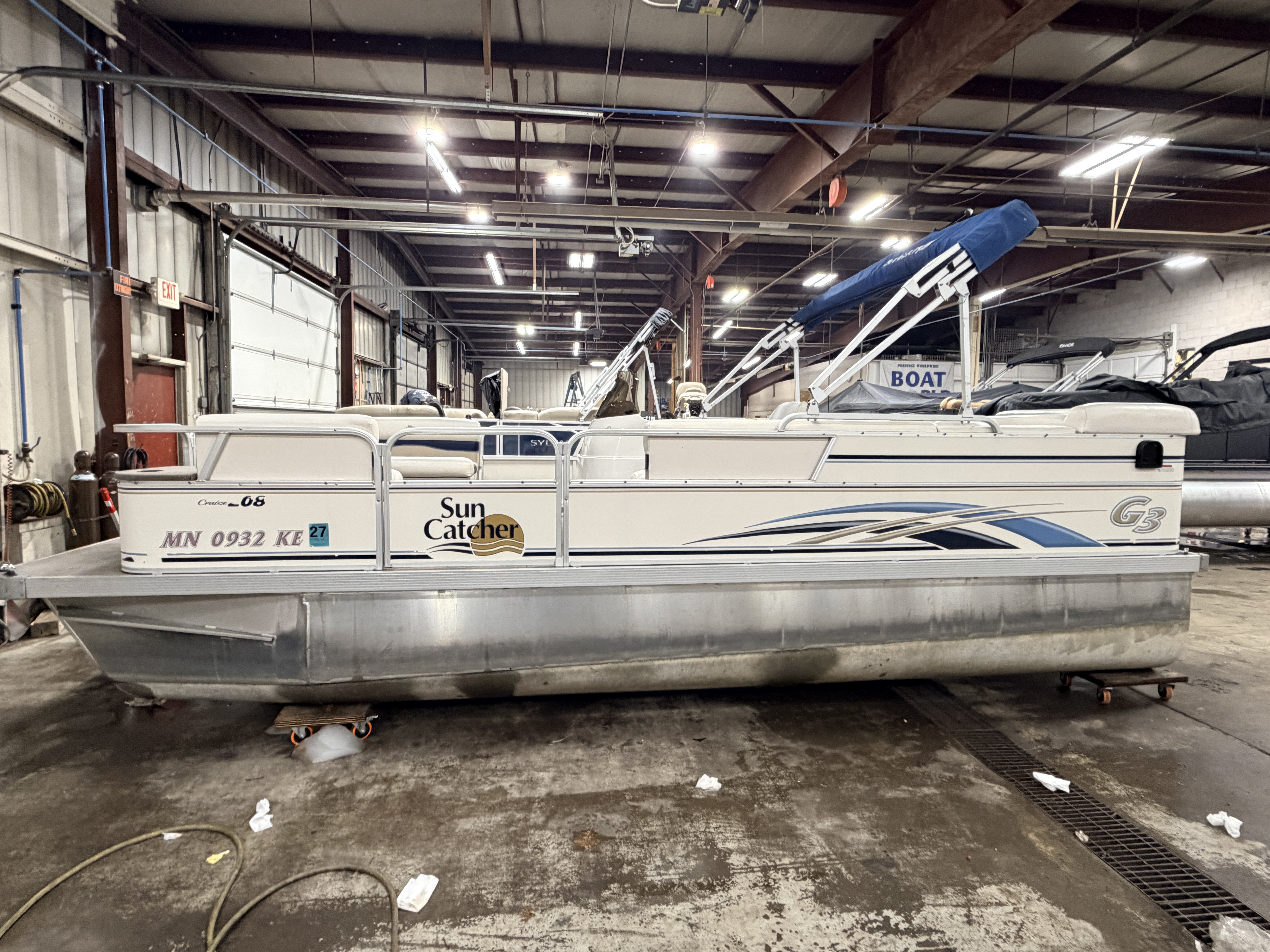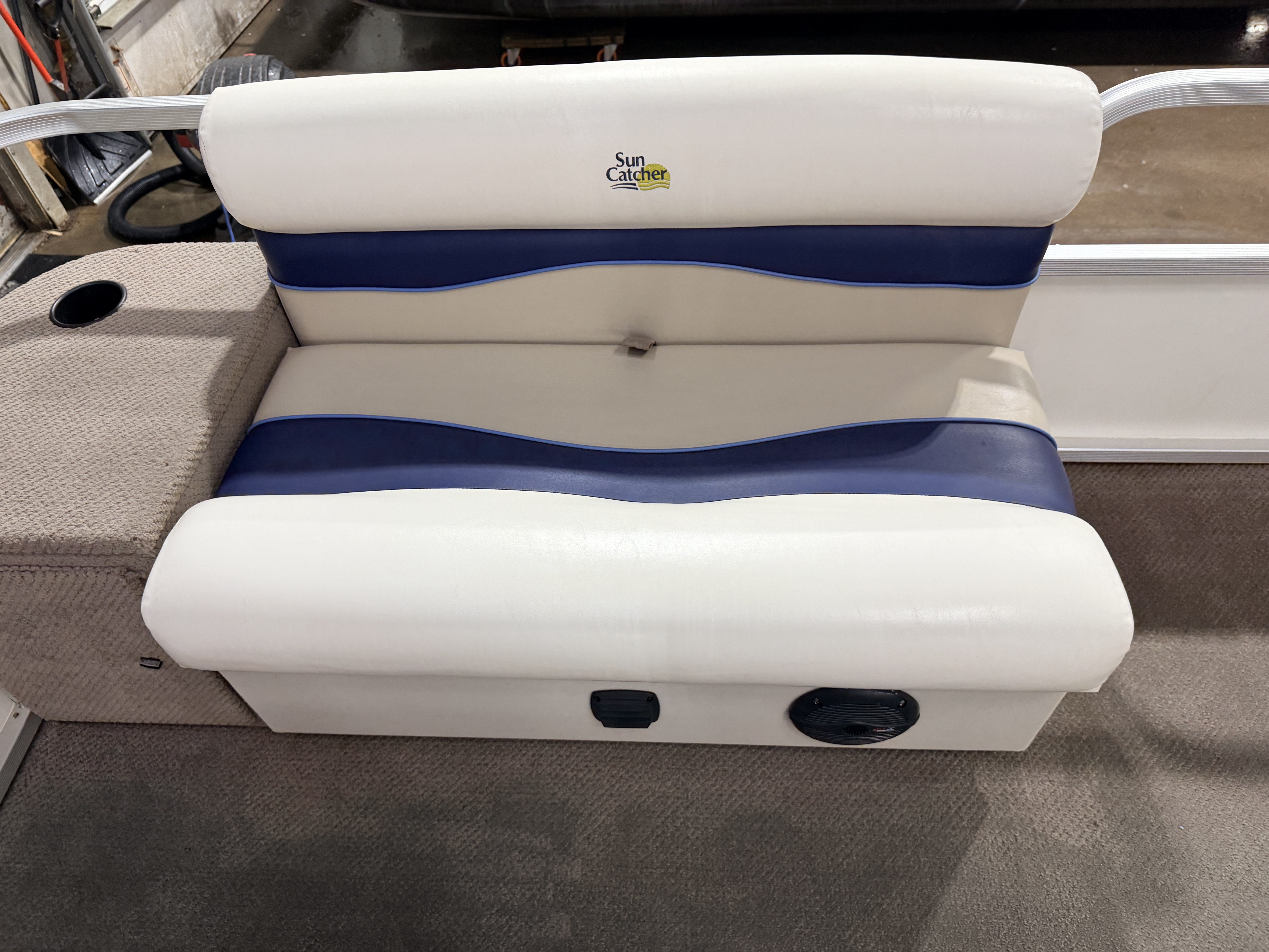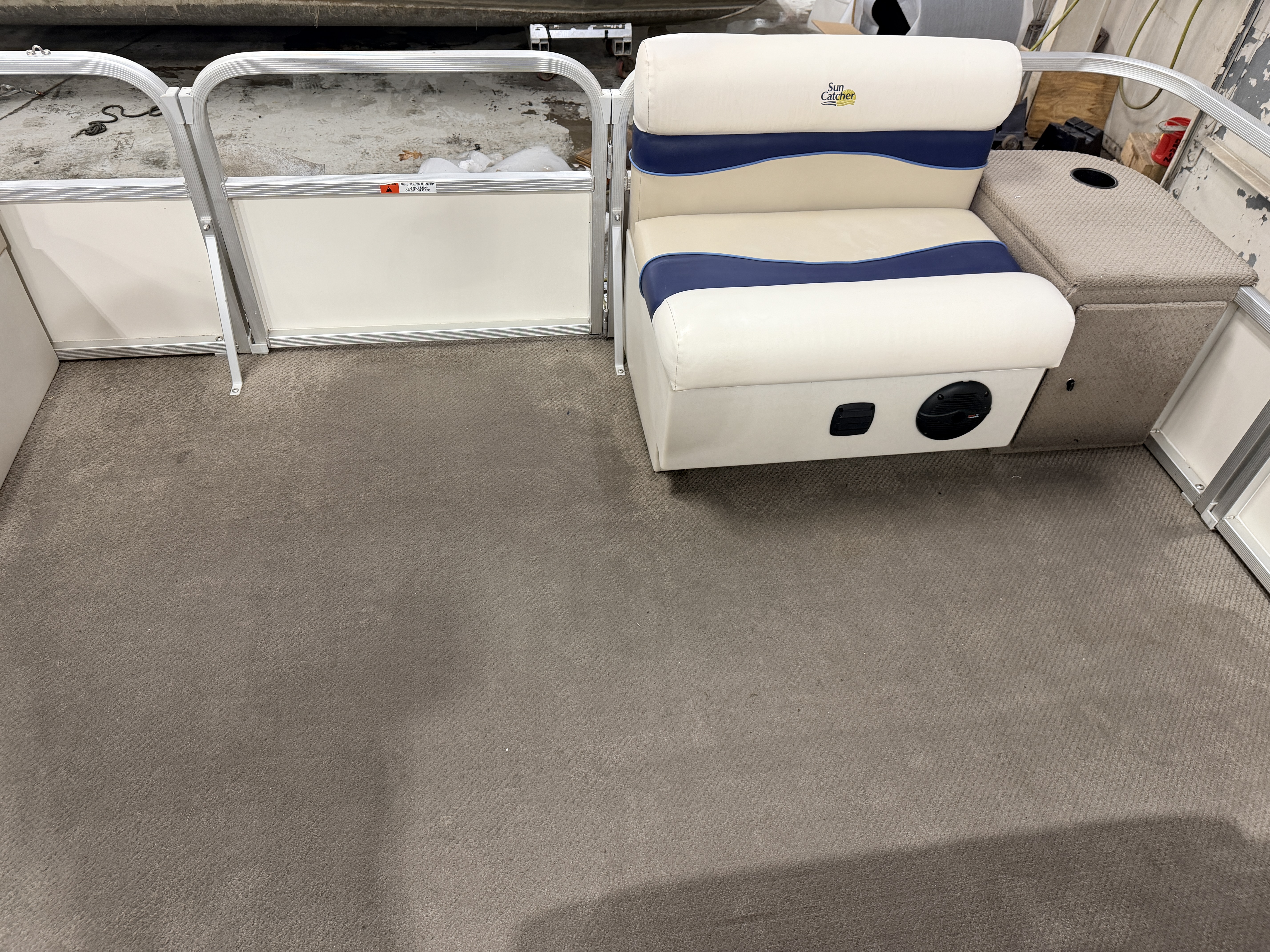 2007 G3 SunCatcher 20 Cruise Pontoon with 50HP Yamaha Outboard. This cruise model pontoon features 2 couches in the bow with a mini console in each corner with a cup holder and storage compartment. The helm features a Speedometer, Tachometer, Fuel and Trim gauge. There is a Sony Cd player stereo system with additional auxiliary input. The captain's chair is a low back sport seat with swivel, slide and recline functions as well as fold up arm rests. There is a L shaped couch on the port side with table. Behind the L couch is a sun deck. There is a swim platform on the bow along with another at the stern with a fold down swim ladder.