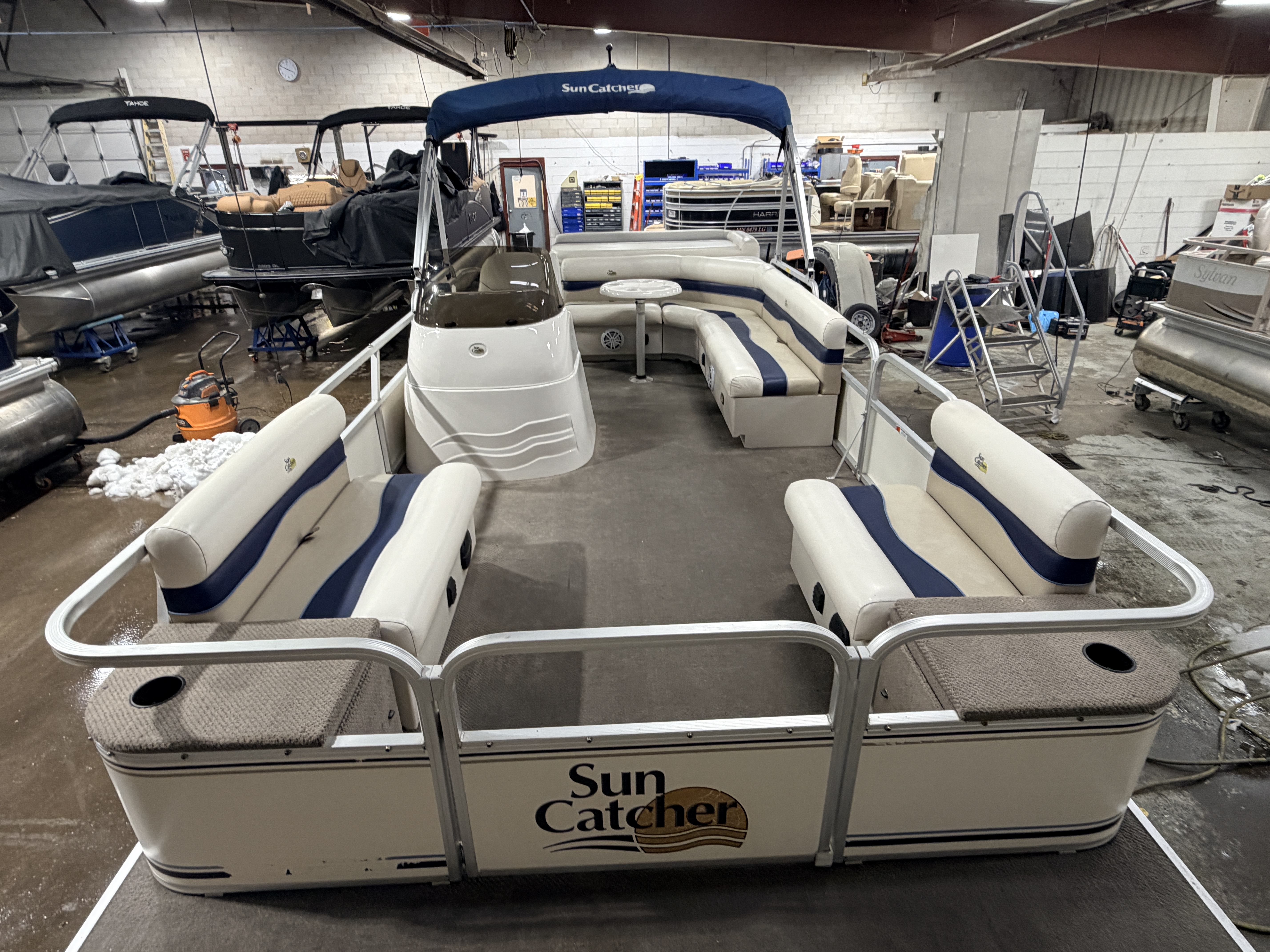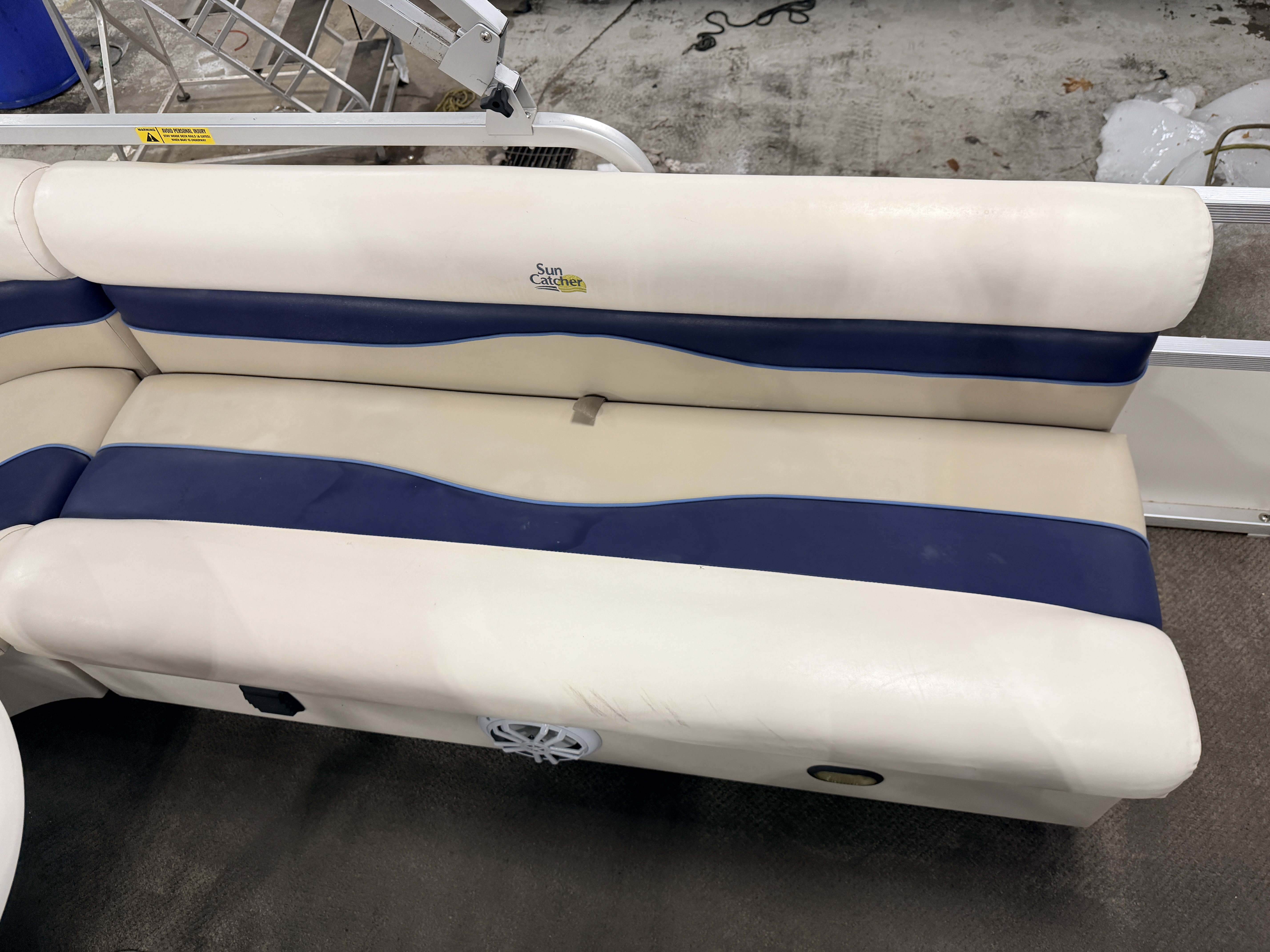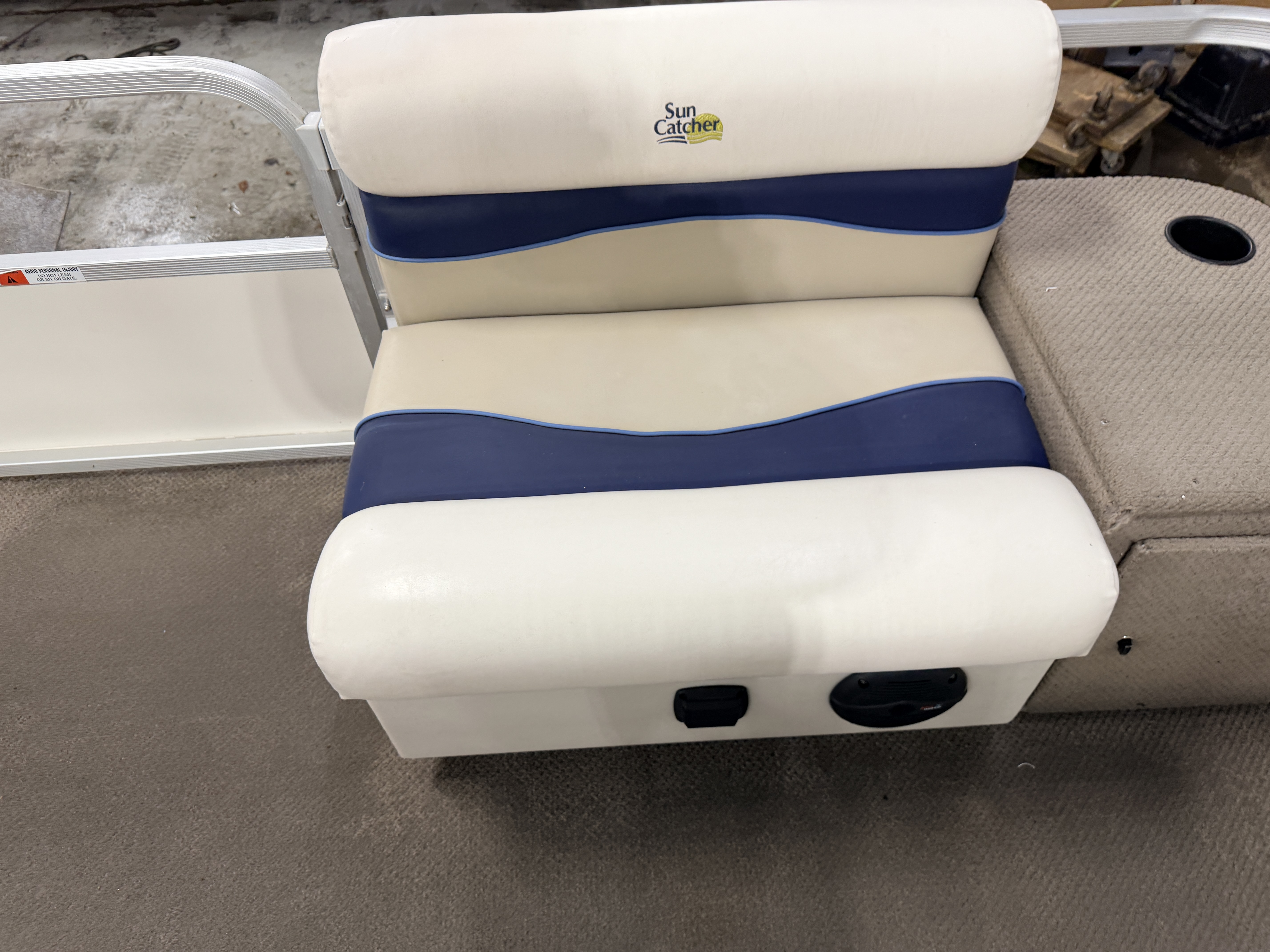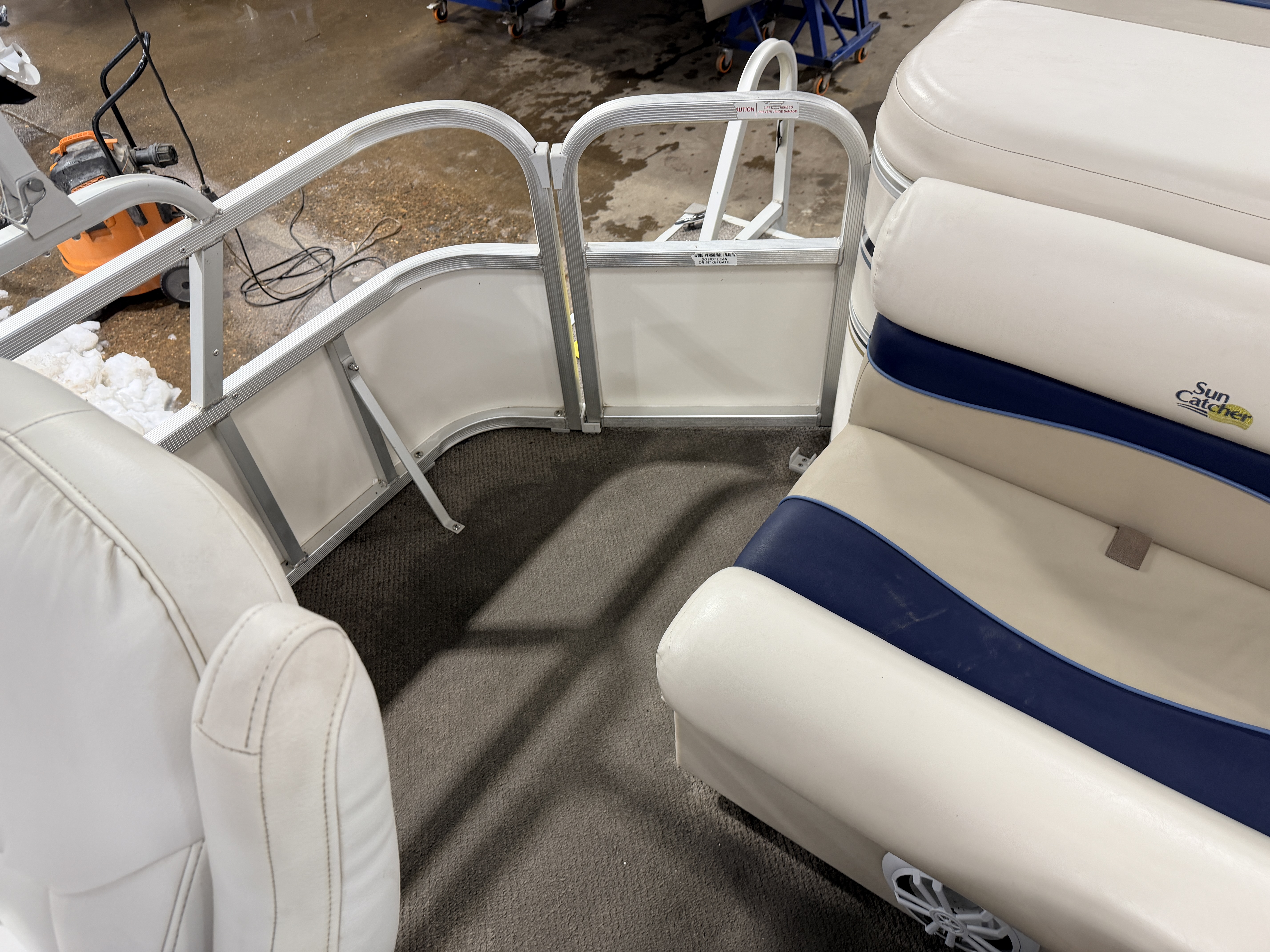 2007 G3 SunCatcher 20 Cruise Pontoon with 50HP Yamaha Outboard. This cruise model pontoon features 2 couches in the bow with a mini console in each corner with a cup holder and storage compartment. The helm features a Speedometer, Tachometer, Fuel and Trim gauge. There is a Sony Cd player stereo system with additional auxiliary input. The captain's chair is a low back sport seat with swivel, slide and recline functions as well as fold up arm rests. There is a L shaped couch on the port side with table. Behind the L couch is a sun deck. There is a swim platform on the bow along with another at the stern with a fold down swim ladder.