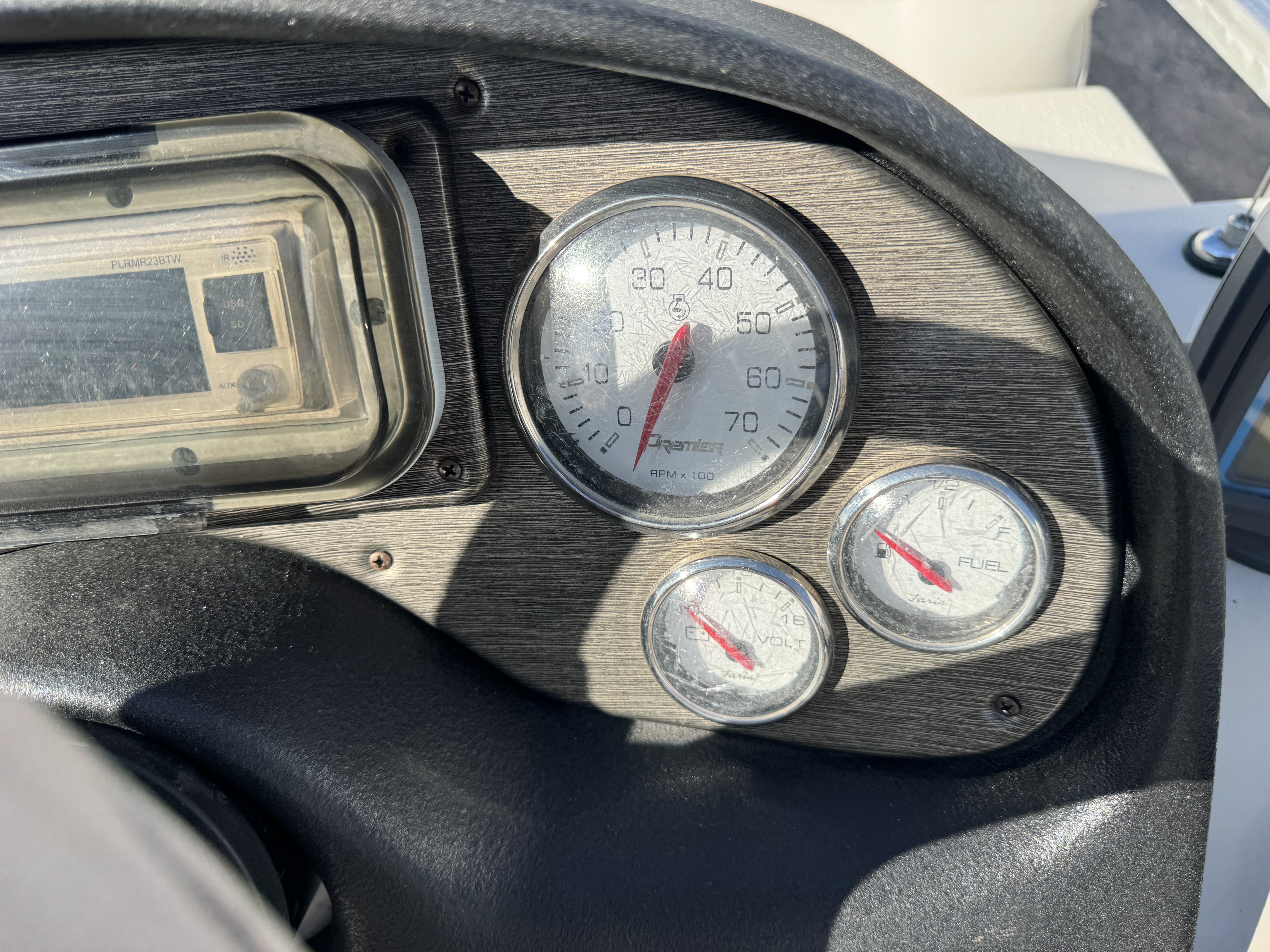 Tachometer, Fuel, Volt and Trim. There is a Pyle Bluetooth stereo system with