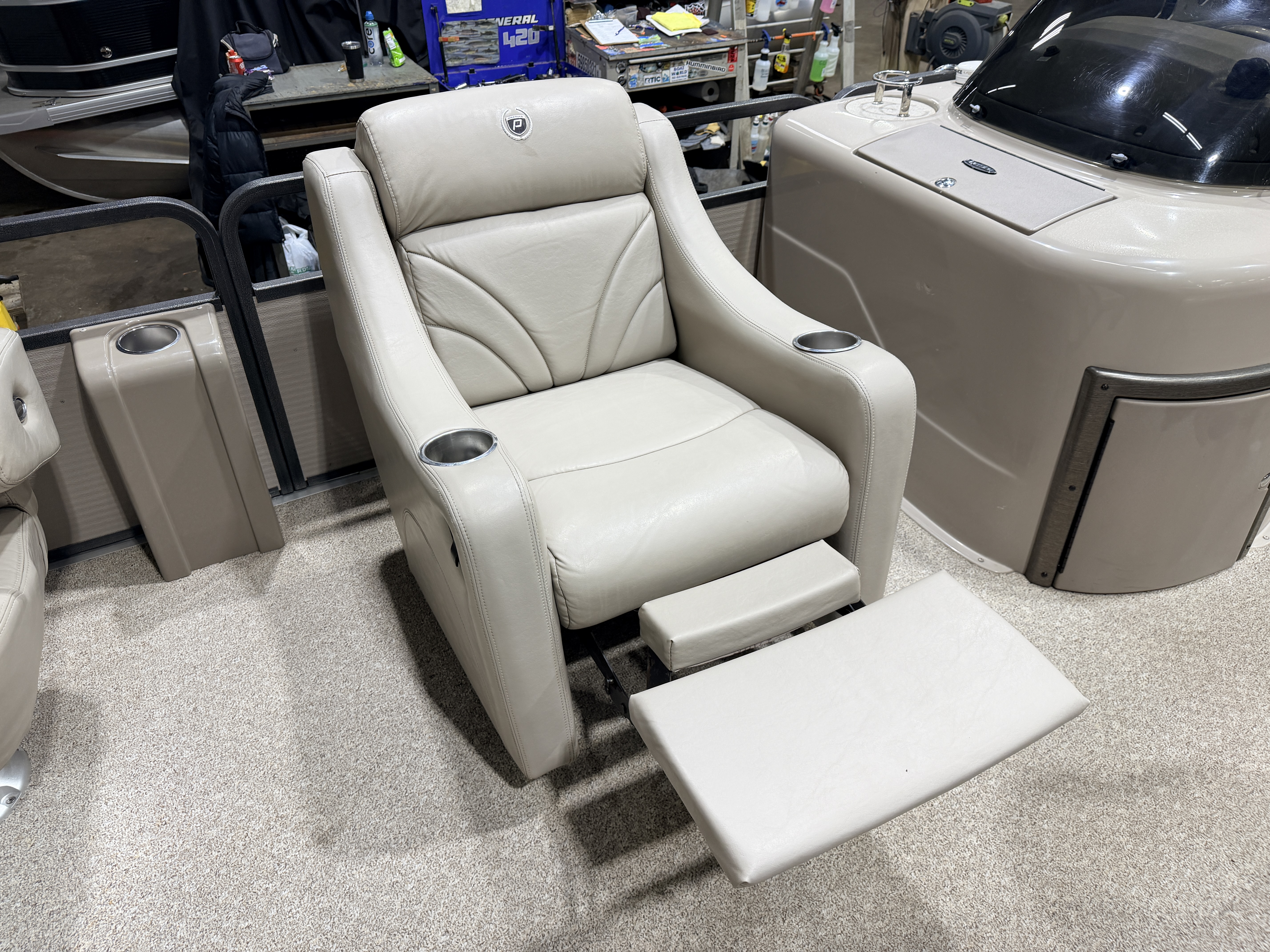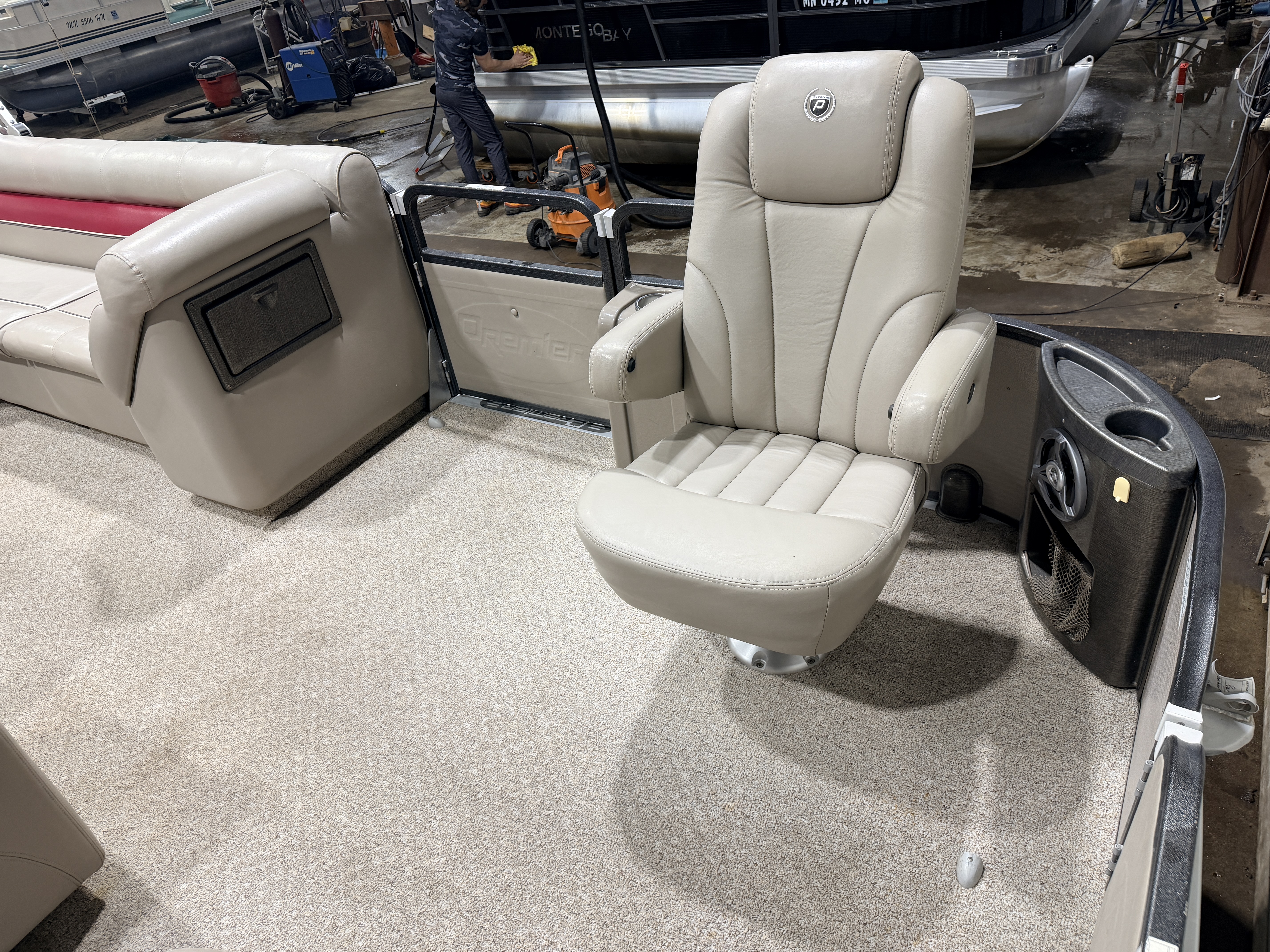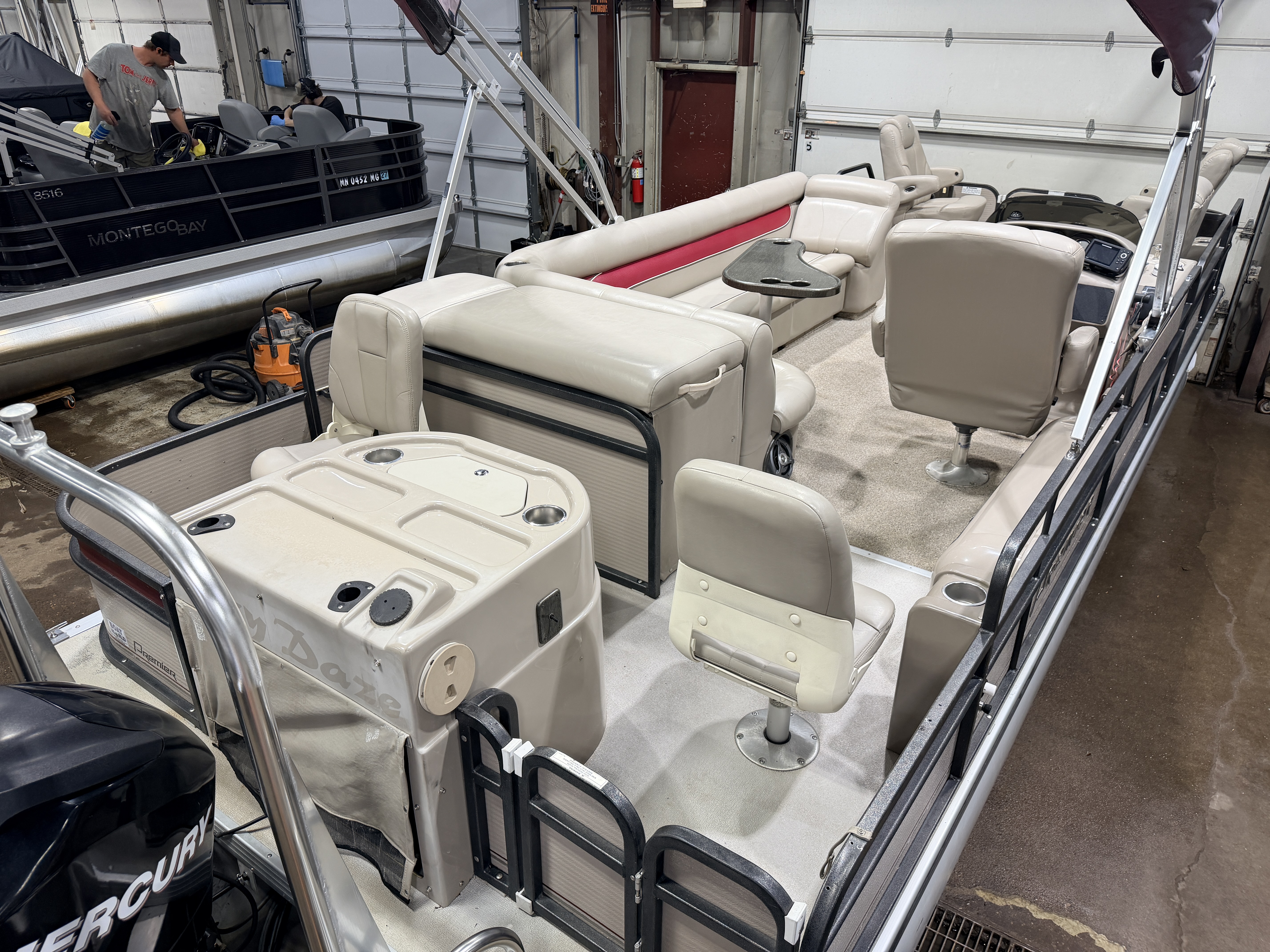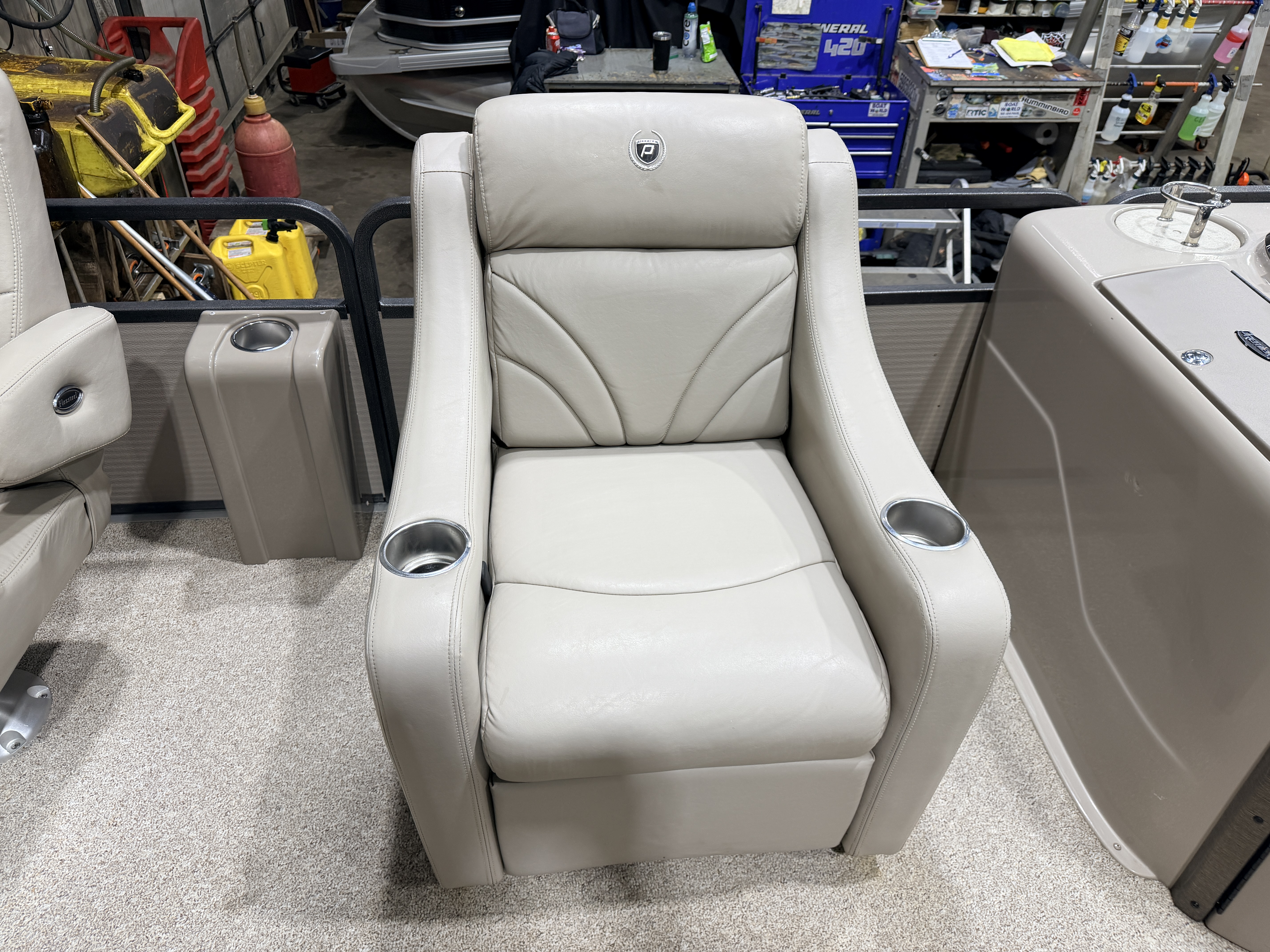 2007 Premier 251 Cast-a-way Pontoon with 115HP Mercury Fourstroke EFI. Interior Flexsteel seating includes oversized Captain's Chair, Dual Lounge Chairs, Recliner Lounge Chair, L-shaped Couch, Sun Deck and 2 fishing seats. Features include Power Bimini Top, Table, Speedometer, Tachometer, Fuel, Volt and Trim gauges, Humminbird Helix 5 GPS depth/fish finder, Pyle Bluetooth Stereo, Courtesy light, Privacy/Changing Station with mirror and Paper Towel & TP Holders, Livewell, Ski/Tow Bar, and vertical Rod Storage. Additional Features include washdown hose with electric pump, retractable mooring ropes built into the railings, cooler built into the helm, in seat storage on the L-shaped couch, storage pod behind captain's chair, storage pouch by the throttle controls, mini console in each corner of bow.