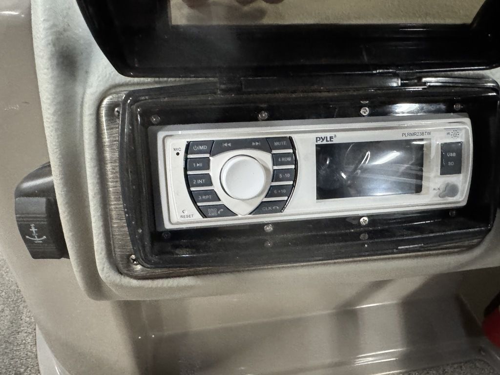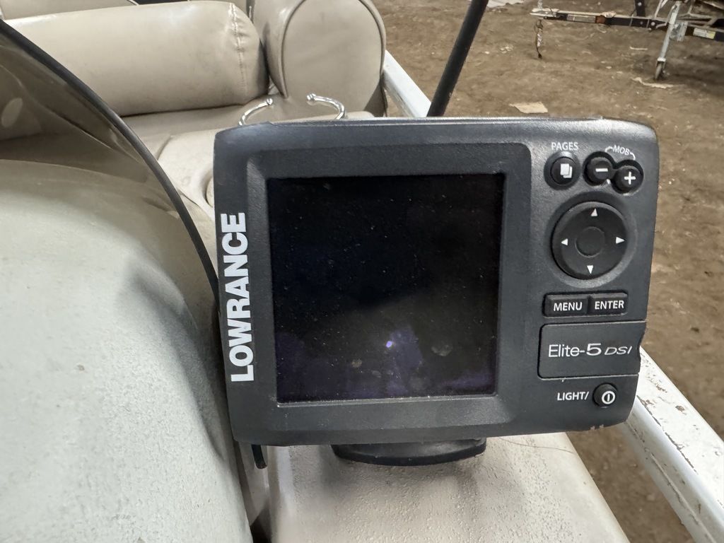 inputs. There is a Lowrance Elite-5 fish/depth finder mounted on the helm also.