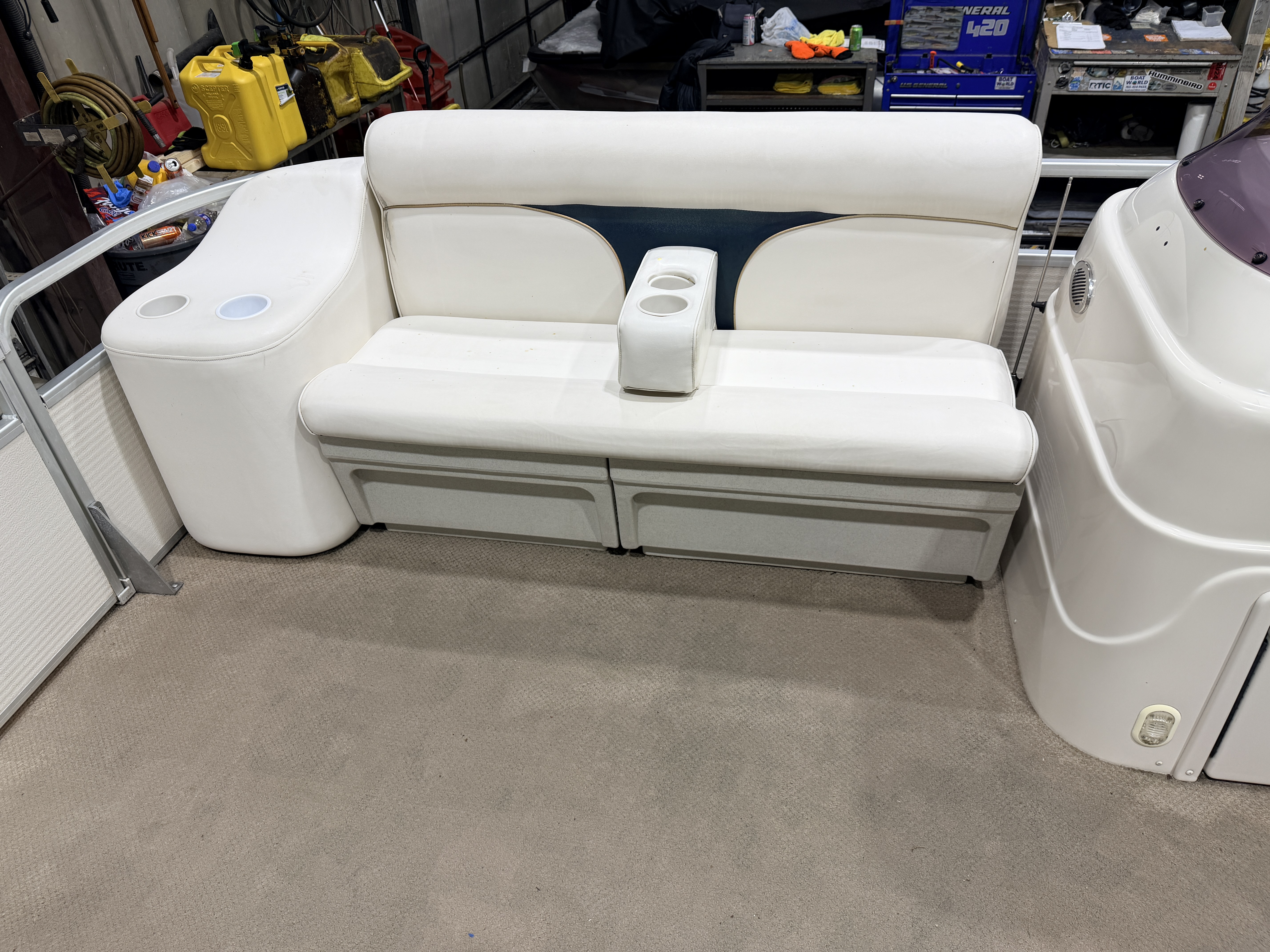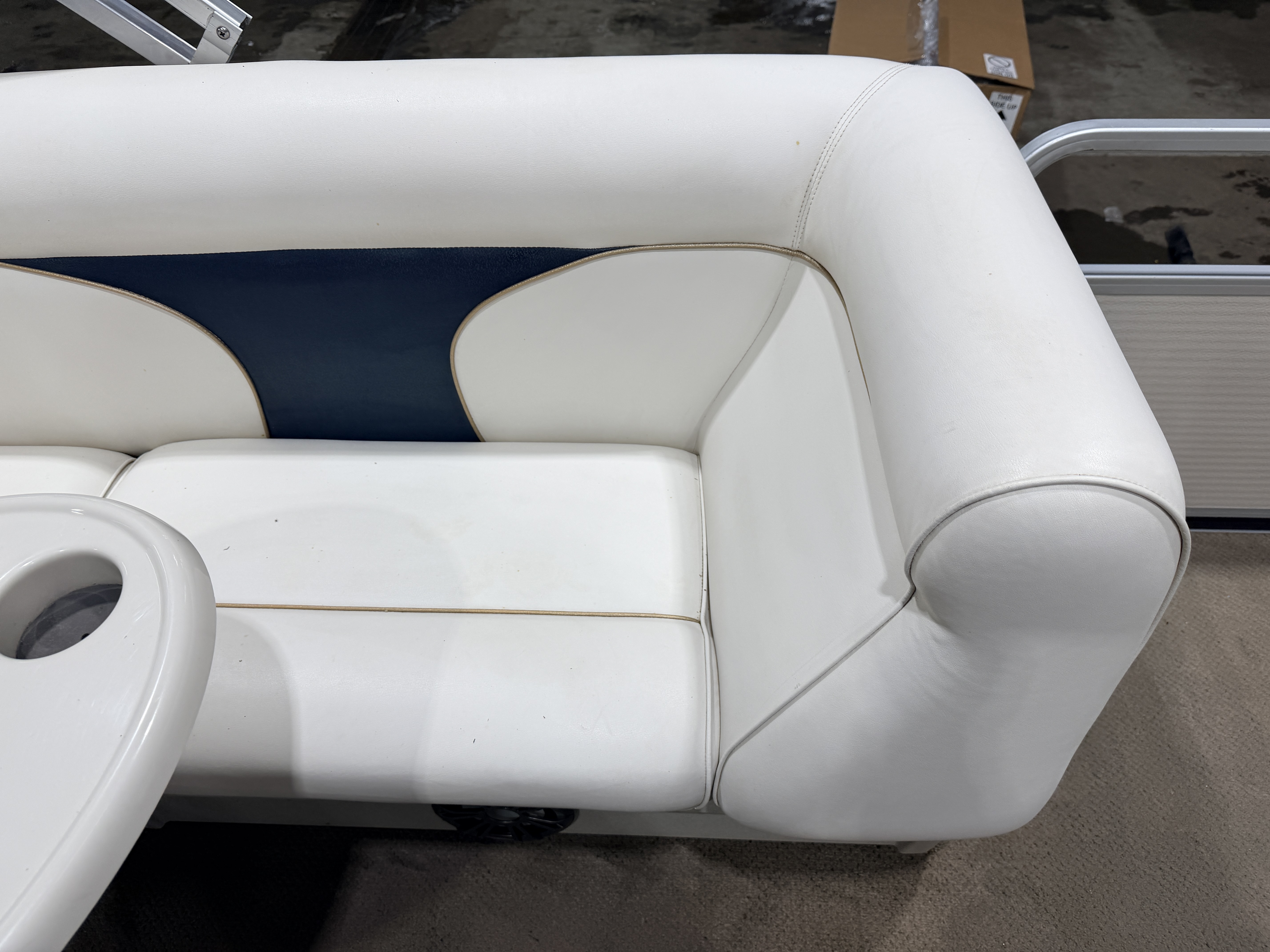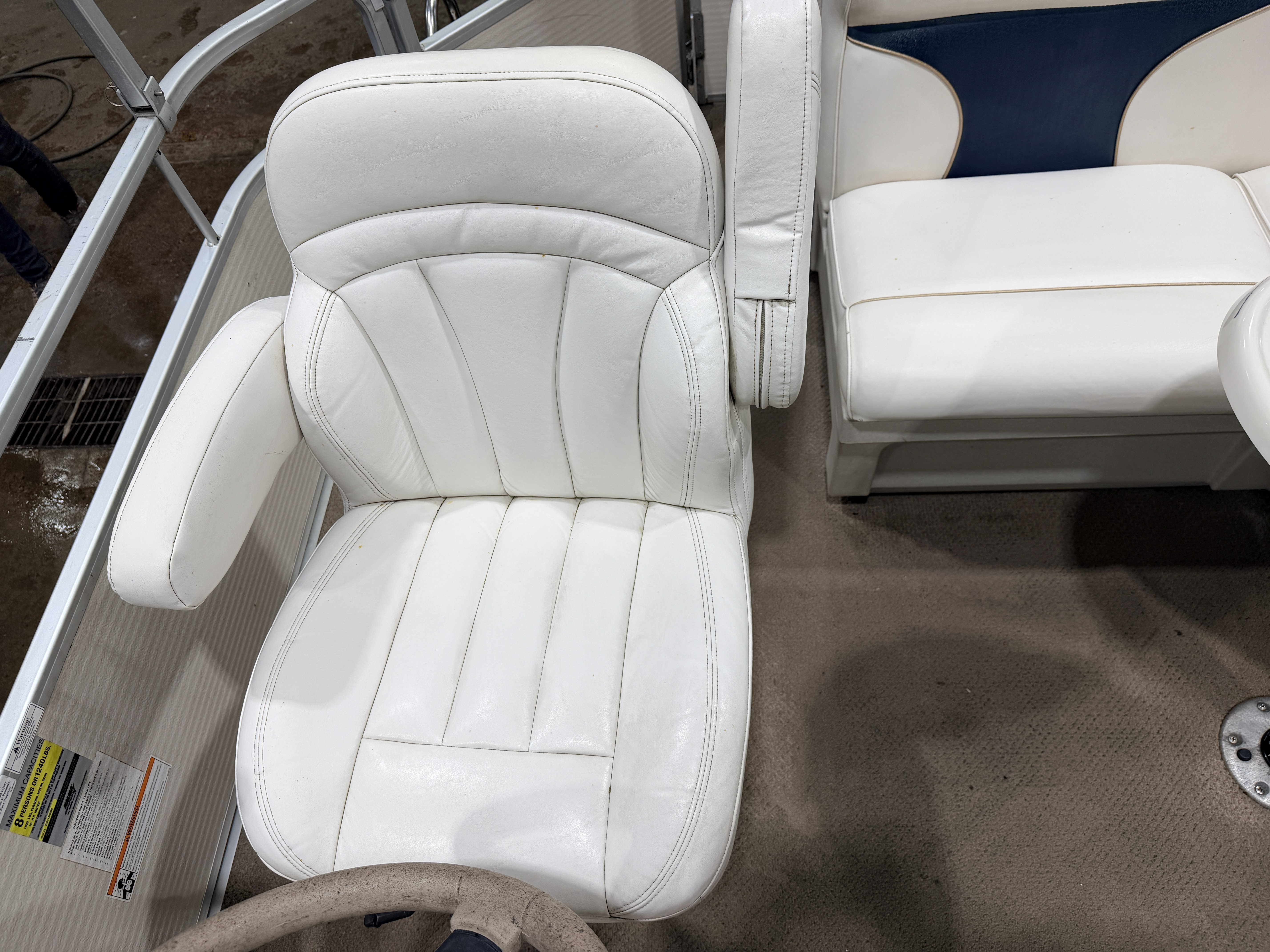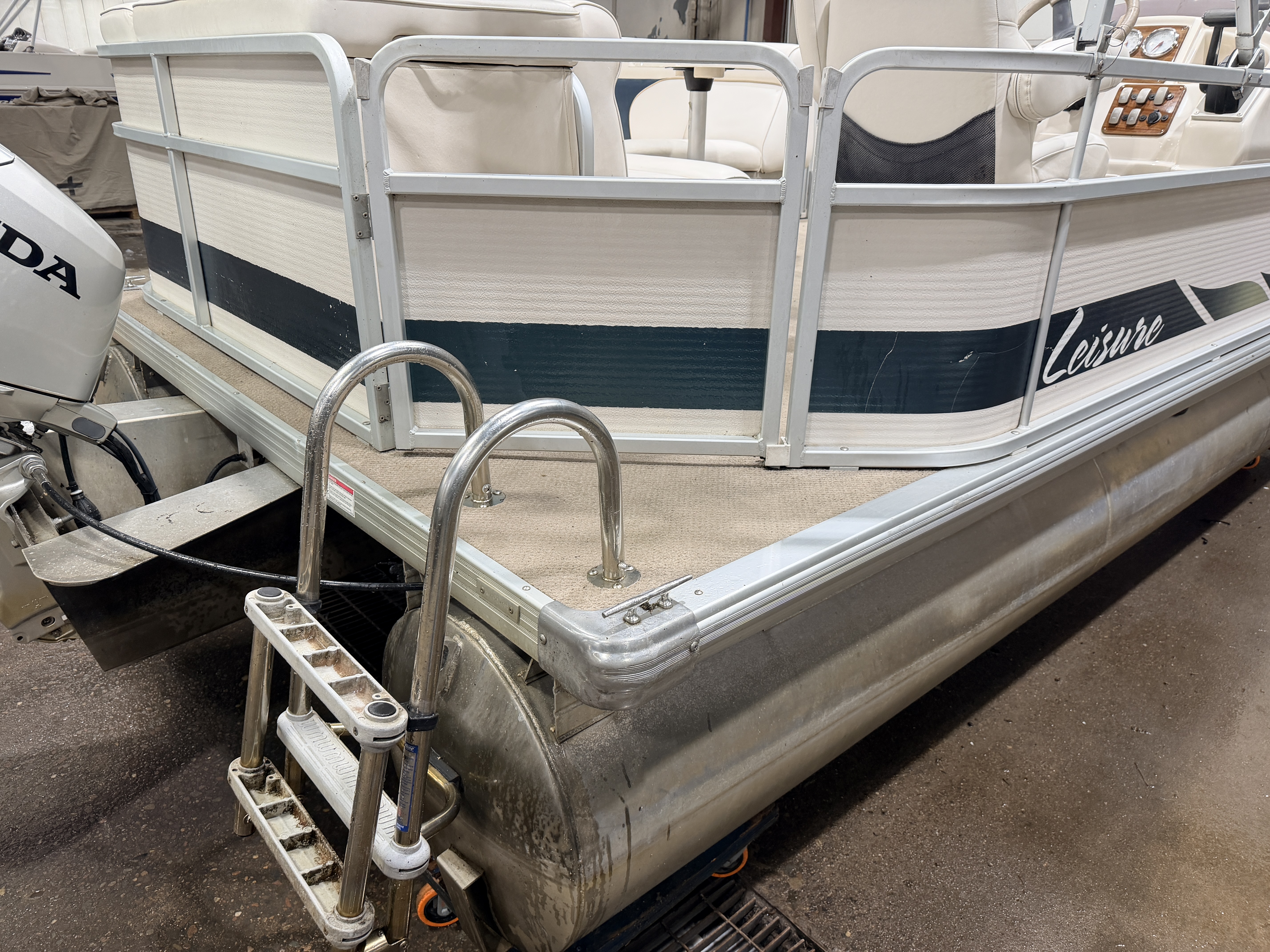 2007 Premier Leisure 2023 Meridian Pontoon with 40HP Honda Fourstroke Outboard. This cruise model pontoon features 2 couches in front along with an L couch amidships. There is a table mounted at the L couch. The captain's chair is a low back sport style seat with swivel and slide functions as well as fold up arm rests. The helm features a Speedometer, Tachometer, Fuel, Volt and Trim gauge. There is a Pyle Bluetooth audio stereo system with additional USB, SD card and auxiliary inputs. Behind the L couch is a sun deck with a pop up privacy/changing station. There is a fold down swim ladder at the rear just through the rear entry gate.