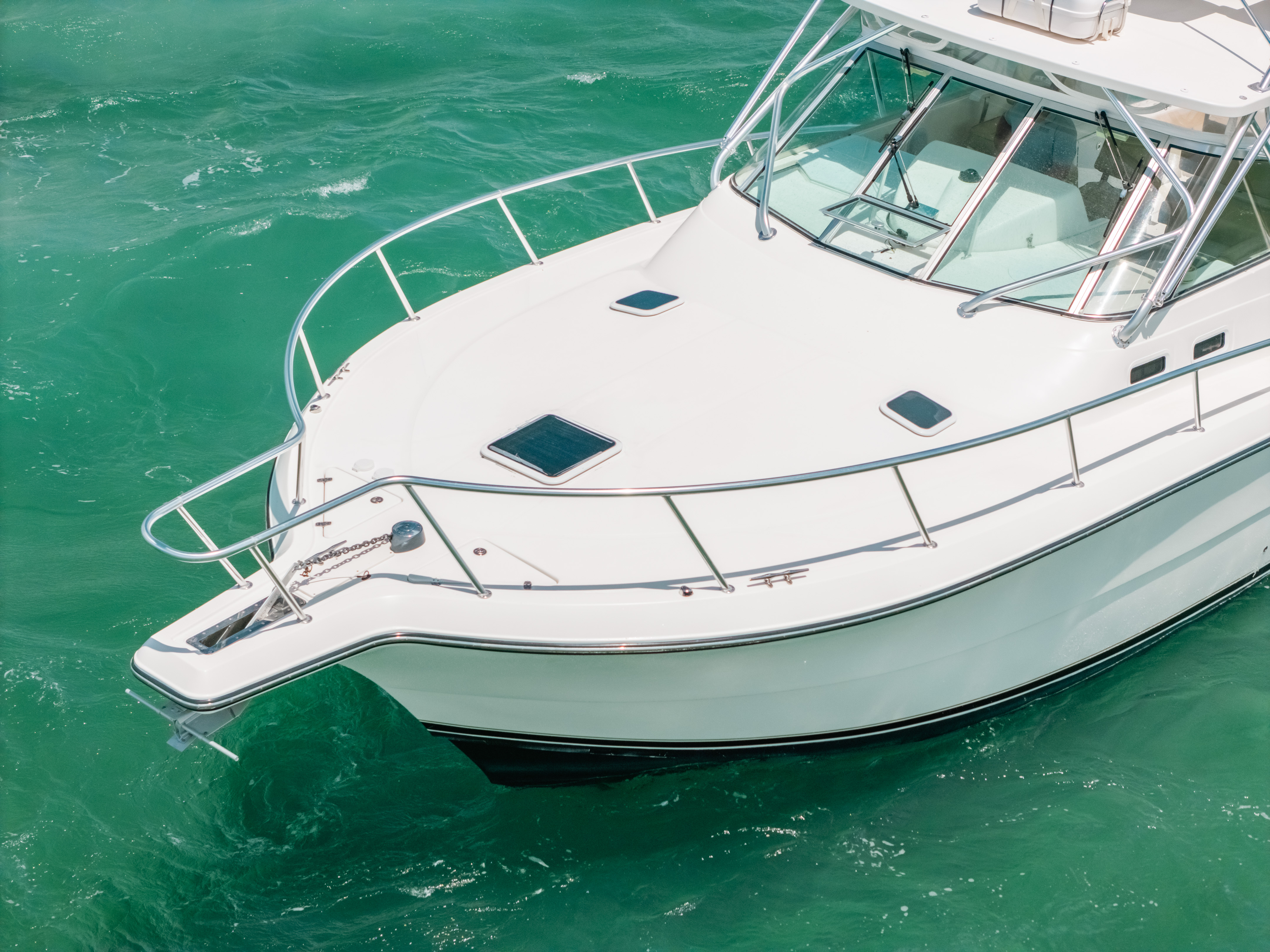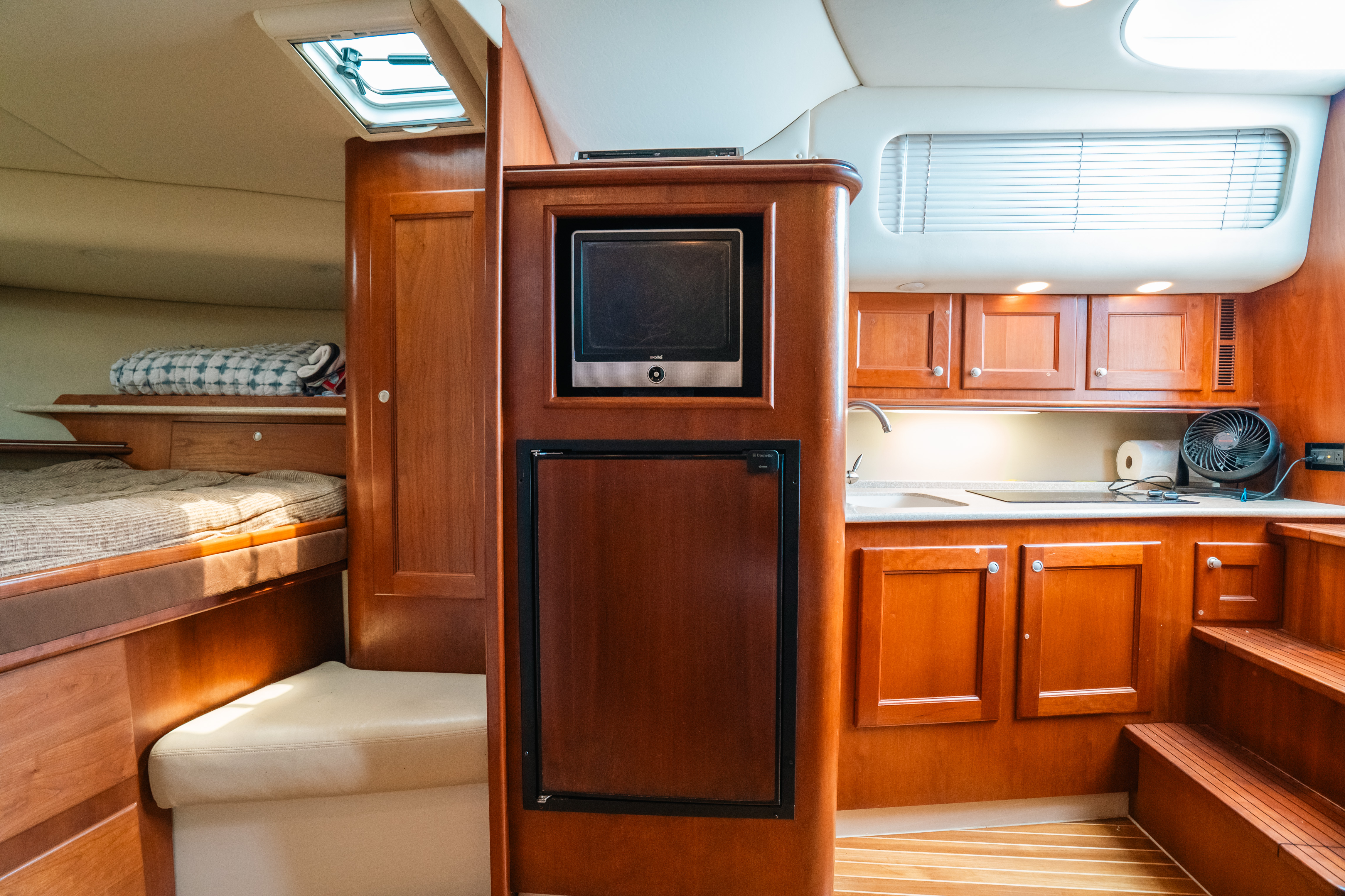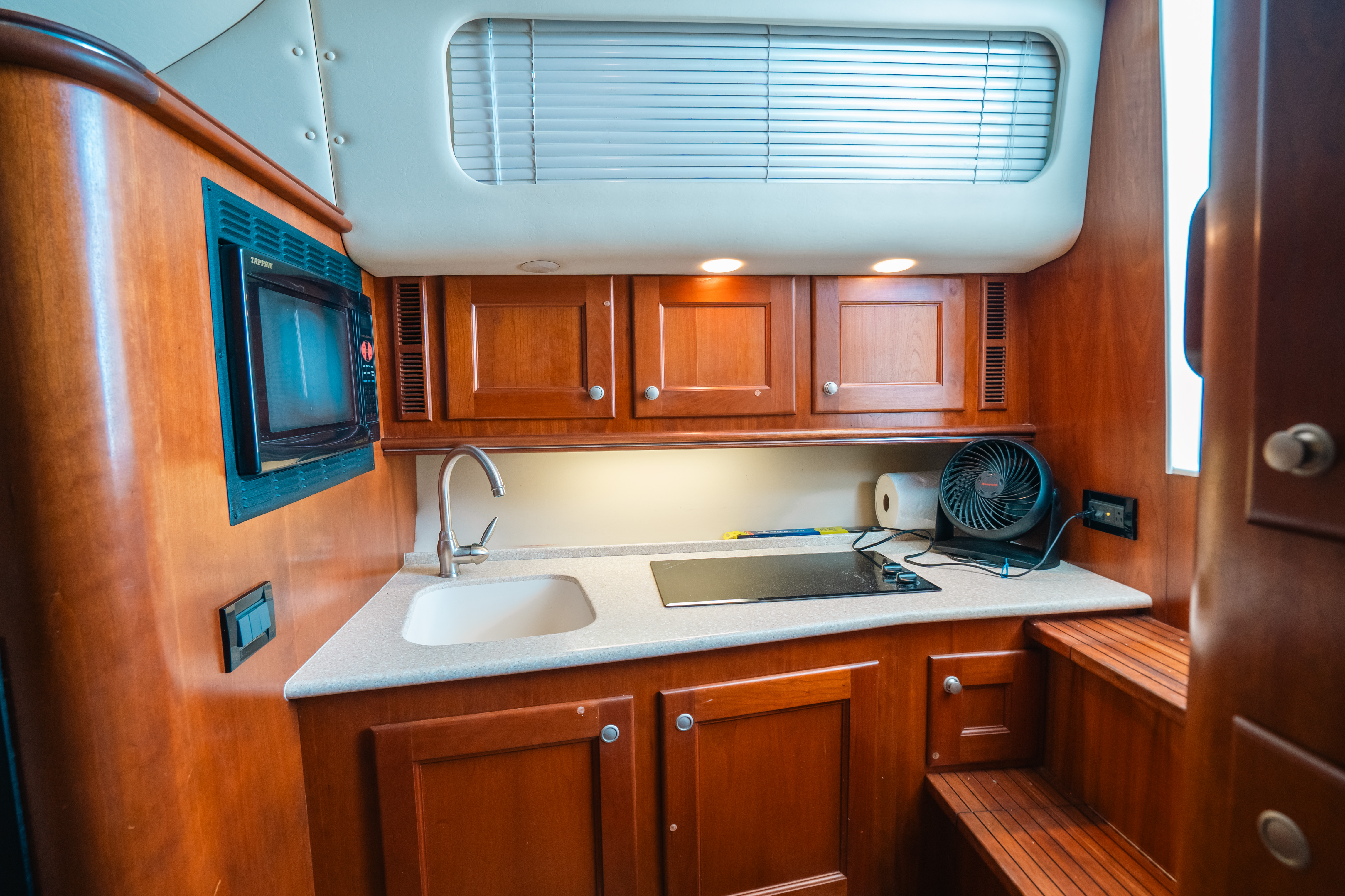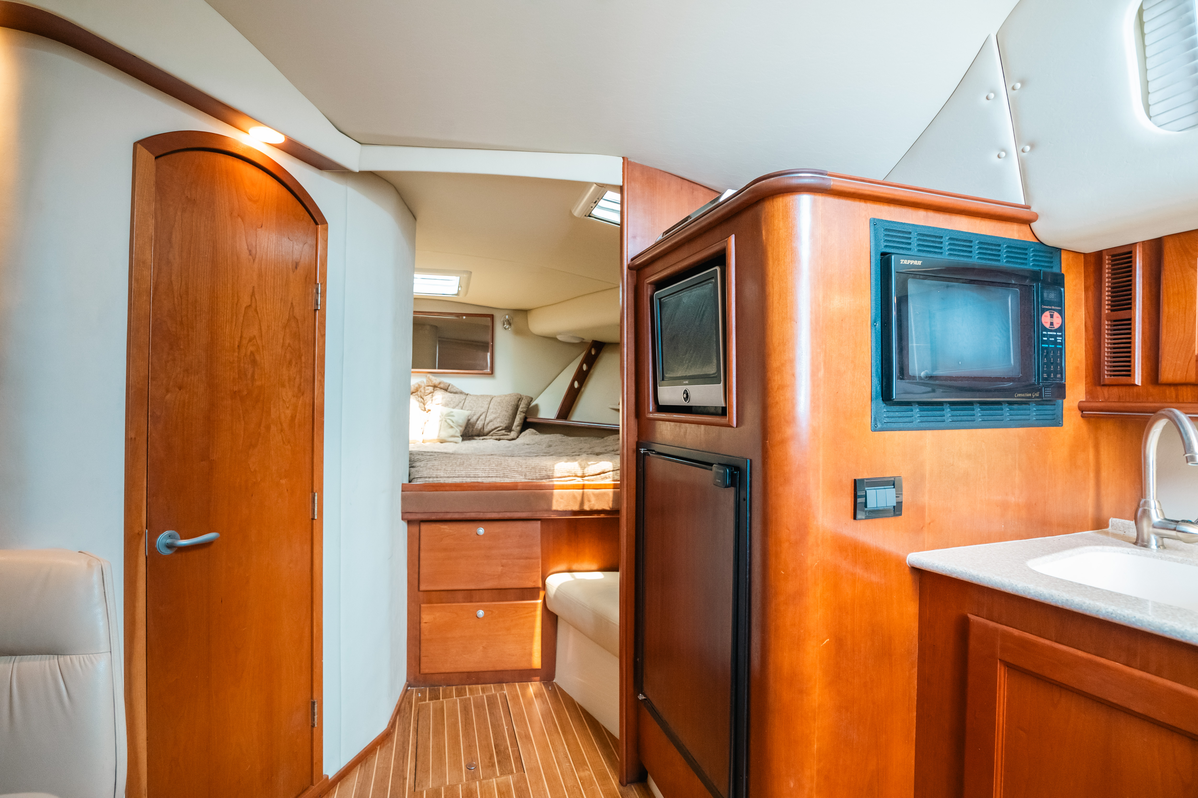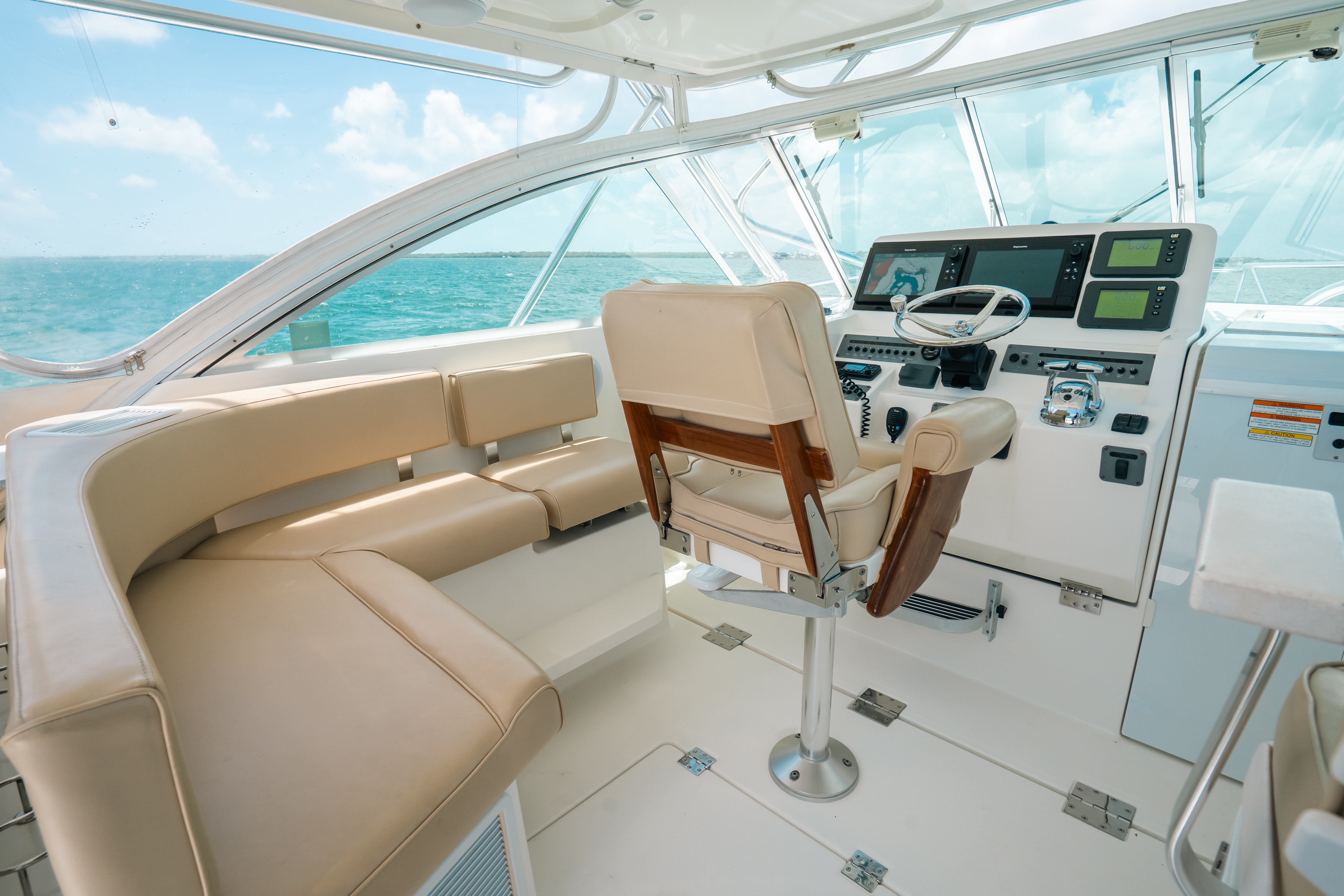 A classic design, the Rampage 38 Express cabin can accommodate up to four with a double berth forward and a convertible U-shaped dinette to port. Additional features include excellent cabin headroom, a separate stall shower in the head, power windshield center vent, hinged helm (for access to the wiring), tilt steering and cherry wood interior trim.