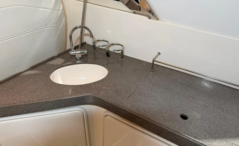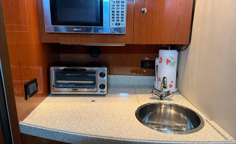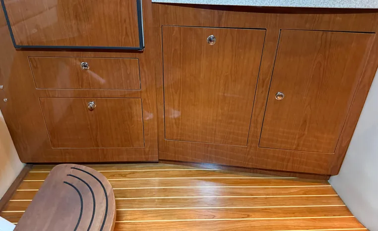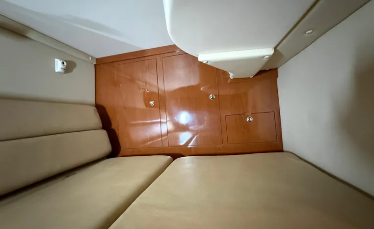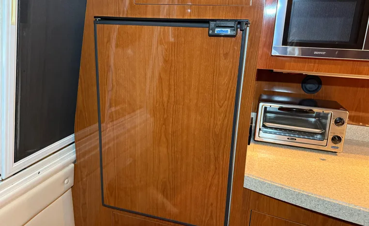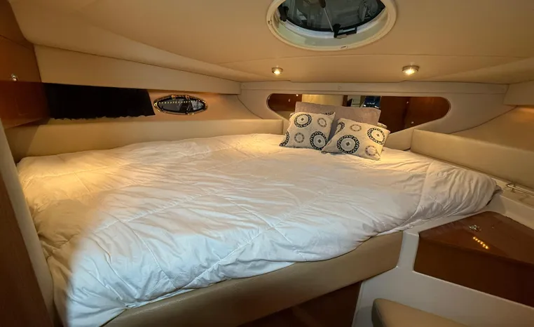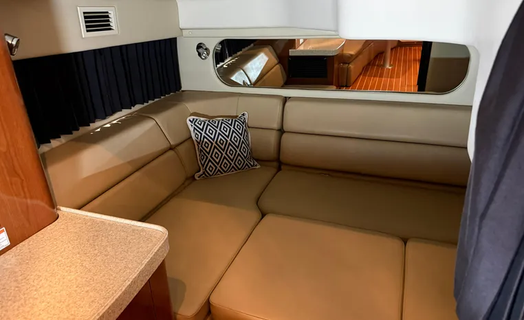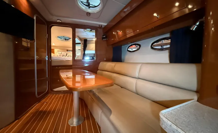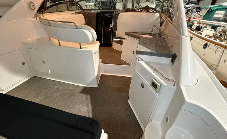 In a market crowded with midsize family cruisers, the Regal 3760 Commodore ranks near the top in luxury, performance, and quality. Aside from her stylish appearance the Commodore's spacious interior - a blend of high-gloss cherry joinery, Corion counters, and leather upholstery - offers a level of comfort and elegance found in the finest European sport yachts. An excellent performer, Volvo 420HP 8.1L gas I/Os cruise at 28 knots (mid 40 top).