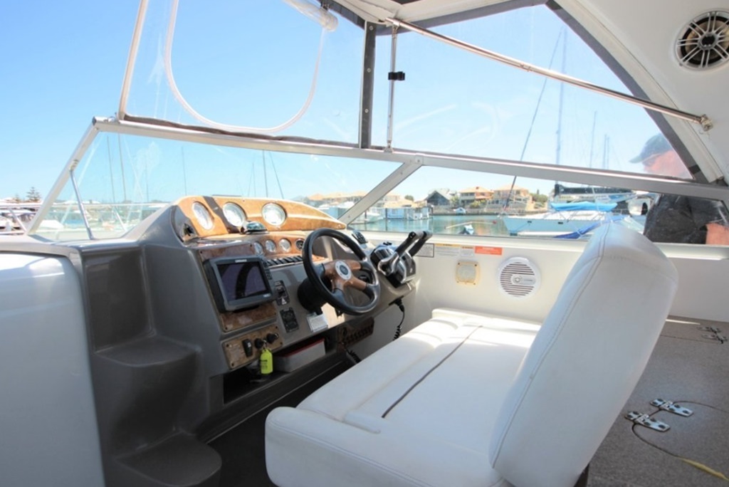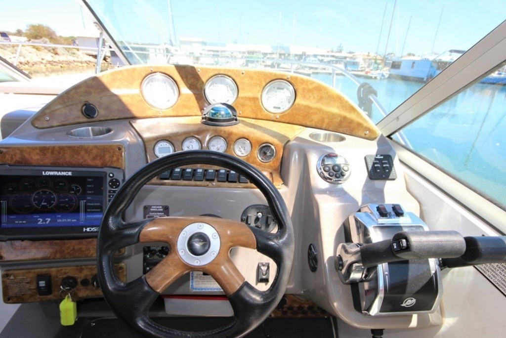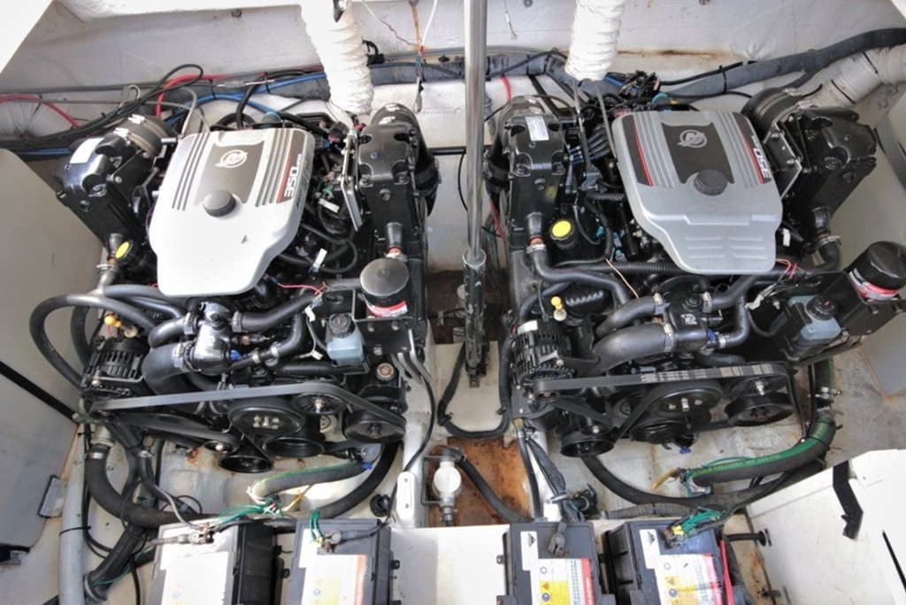 Powered by a MerCruiser 350 MAG V8 5.7L MPI (Multi-Point Injection), hydraulic-assisted steering, and featuring legs and transom plates, this boat combines performance and comfort.