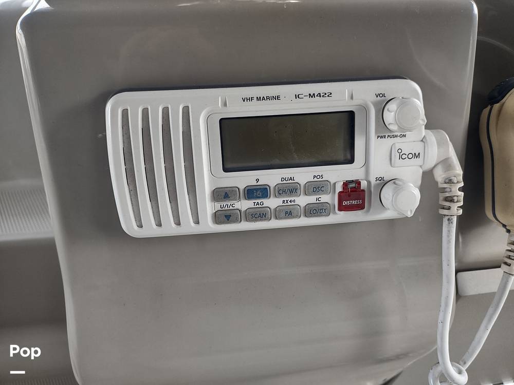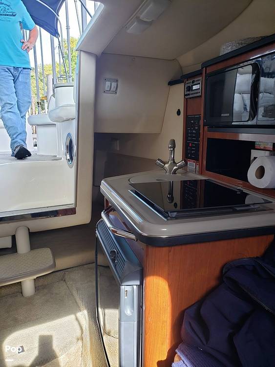 Inside the cabin, it has a wet shower and head with a porta-potty and a hot water heater, air conditioning, and heat, as well as a galley with a mini-fridge single burner stove and microwave. The boat also sleeps four with both a rear berth and a V-berth in the cabin.