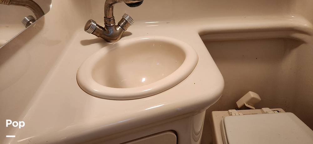 Below deck, the cabin offers sleeping accommodations for four with a V-berth and mid-cabin berth, a compact galley with a microwave, stove, and refrigerator, as well as a fully enclosed head with a shower.