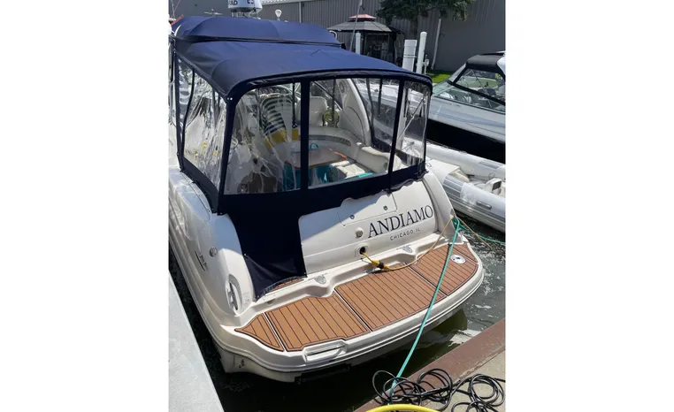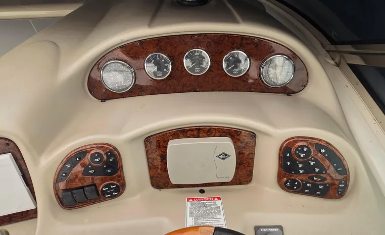 Impressive family express matches European sportboats for aggressive styling, luxury appointments. Spacious mid-cabin interior with cherry or maple cabinetry, solid-wood dining table, leather sofa sleeps six. Topside features include roomy single-level cockpit, transom storage locker, extended swim platform. Ergonomic helm layout has space for flush-mounting electronics. Electric hatch lifts to reveal engine compartment.