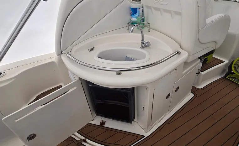 Features (Optional) Twin 8.1-litre 370-hp MerCruiser Horizon Gas Engines with only 700 original hours. Notable features include but are not limited to the following: Air-Conditioning & Heat, Head (Vacuflush) w/Vanity/Sink/Shower, Hardwood flooring in cabin, Electronics Package (VHF Marine Radio, GPS/Chartplotter, MerCrusier SmartCraft, etc.), Kohler Generator, Cockpit Wet Bar w/Sink/Refrigerator, Windlass Anchor, Optional Tubular Aluminum Framed Soft-Top w/Full Canvas Package (Cockpit Mooring Cover, Forward/Side/Aft Canvas), Premium Rockford Sound System with Subwoofer and Amp, SeaDek flooring in cockpit, and MUCH more!