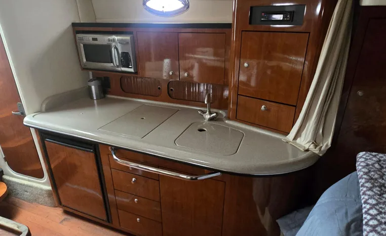 Features (Optional) Twin 8.1-litre 370-hp MerCruiser Horizon Gas Engines with only 700 original hours. Notable features include but are not limited to the following: Air-Conditioning & Heat, Head (Vacuflush) w/Vanity/Sink/Shower, Hardwood flooring in cabin, Electronics Package (VHF Marine Radio, GPS/Chartplotter, MerCrusier SmartCraft, etc.), Kohler Generator, Cockpit Wet Bar w/Sink/Refrigerator, Windlass Anchor, Optional Tubular Aluminum Framed Soft-Top w/Full Canvas Package (Cockpit Mooring Cover, Forward/Side/Aft Canvas), Premium Rockford Sound System with Subwoofer and Amp, SeaDek flooring in cockpit, and MUCH more!