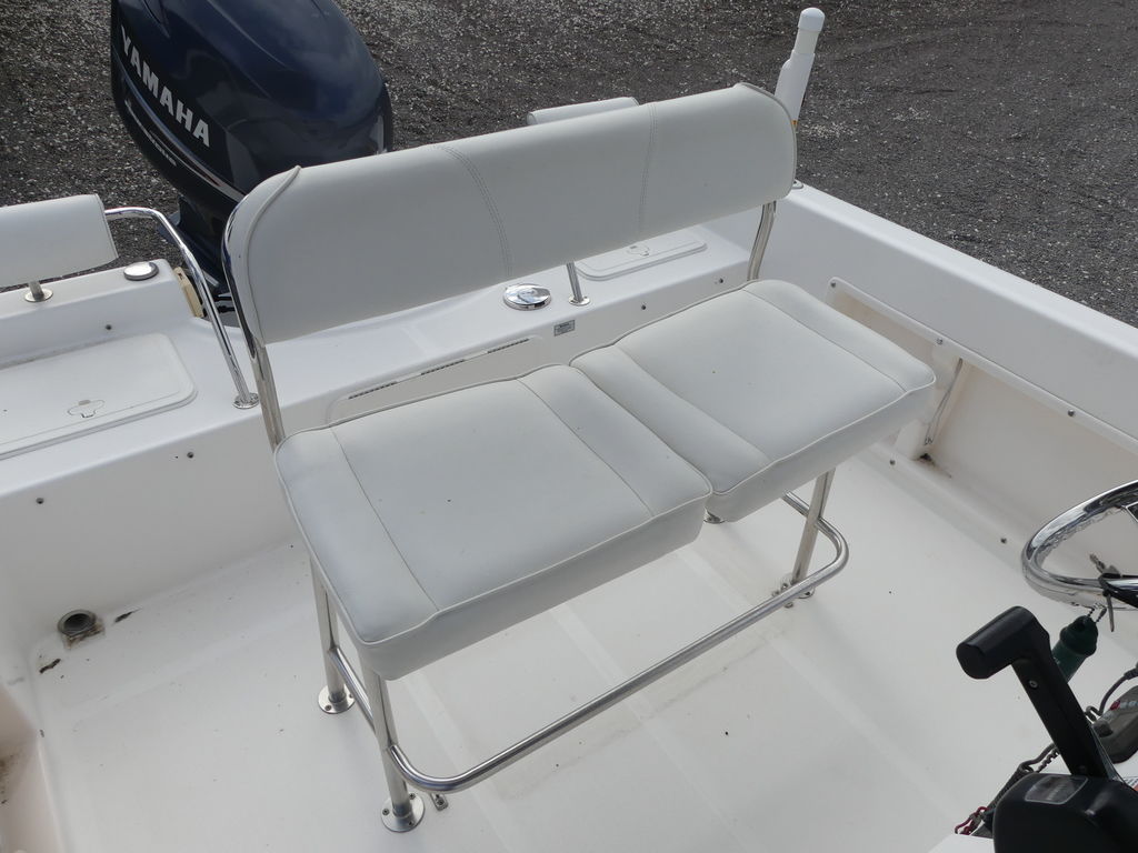Comfortable Seating: Includes a cushioned leaning post at the helm, a forward console seat with an integrated cooler, and twin aft seats that can be removed for more cockpit fishing room.