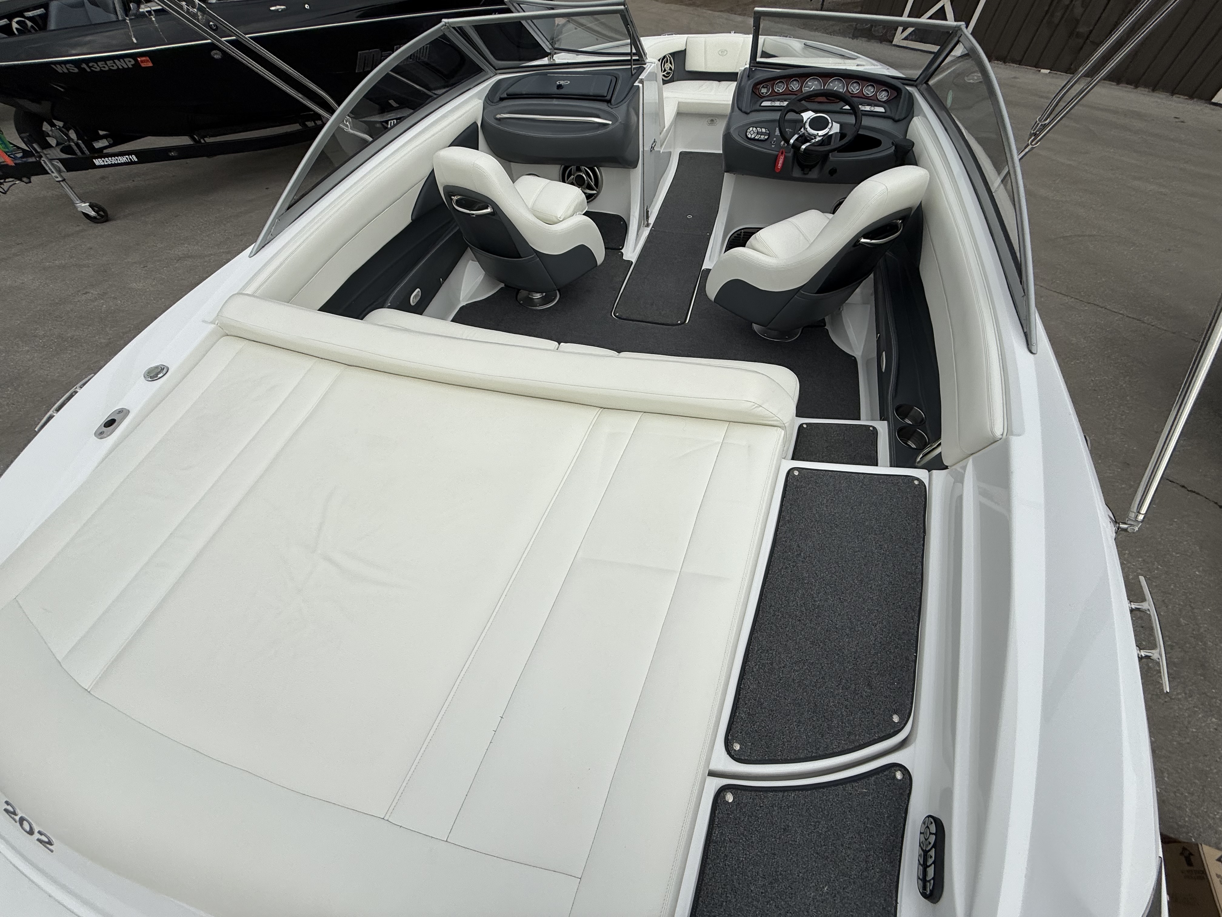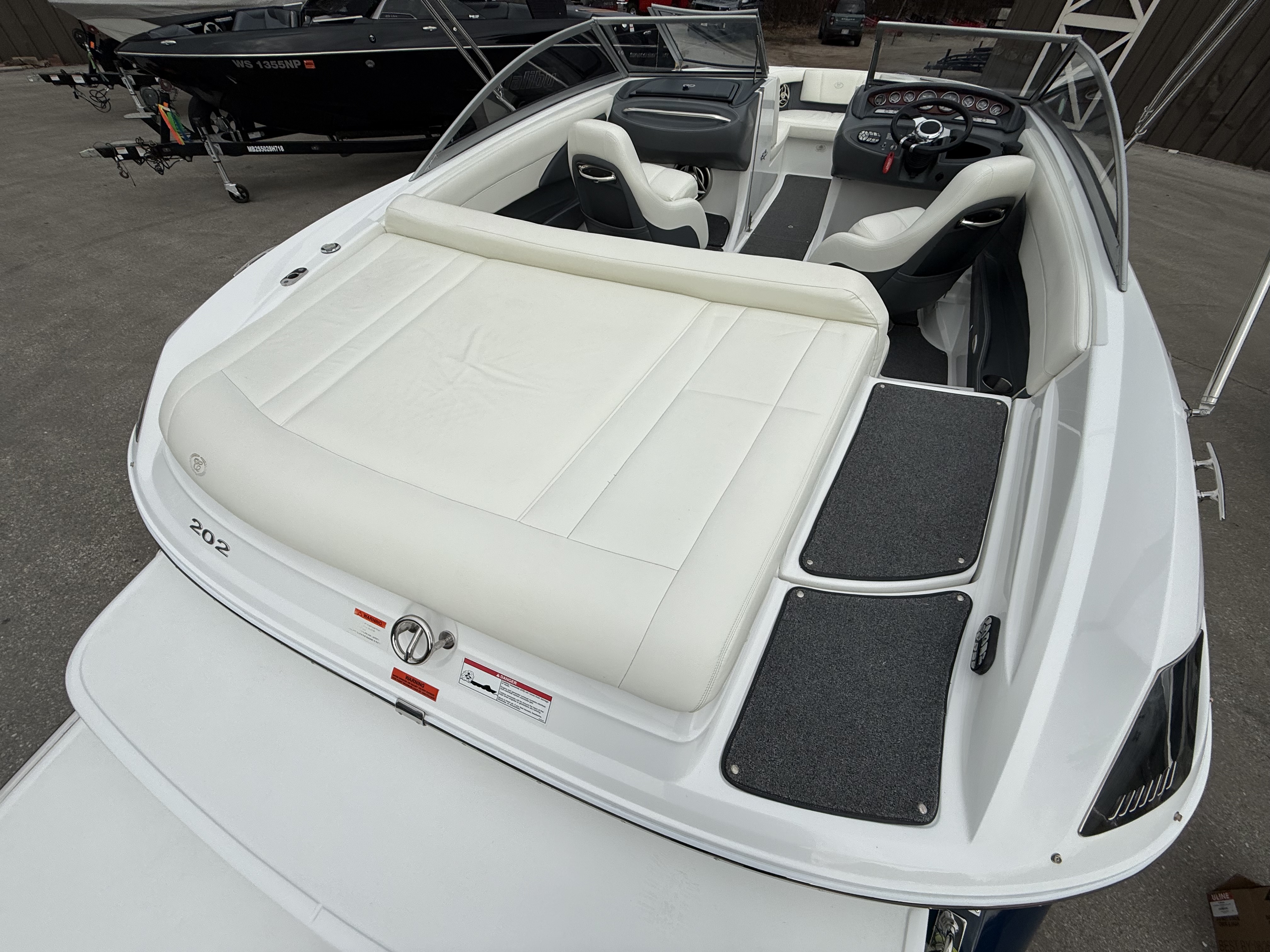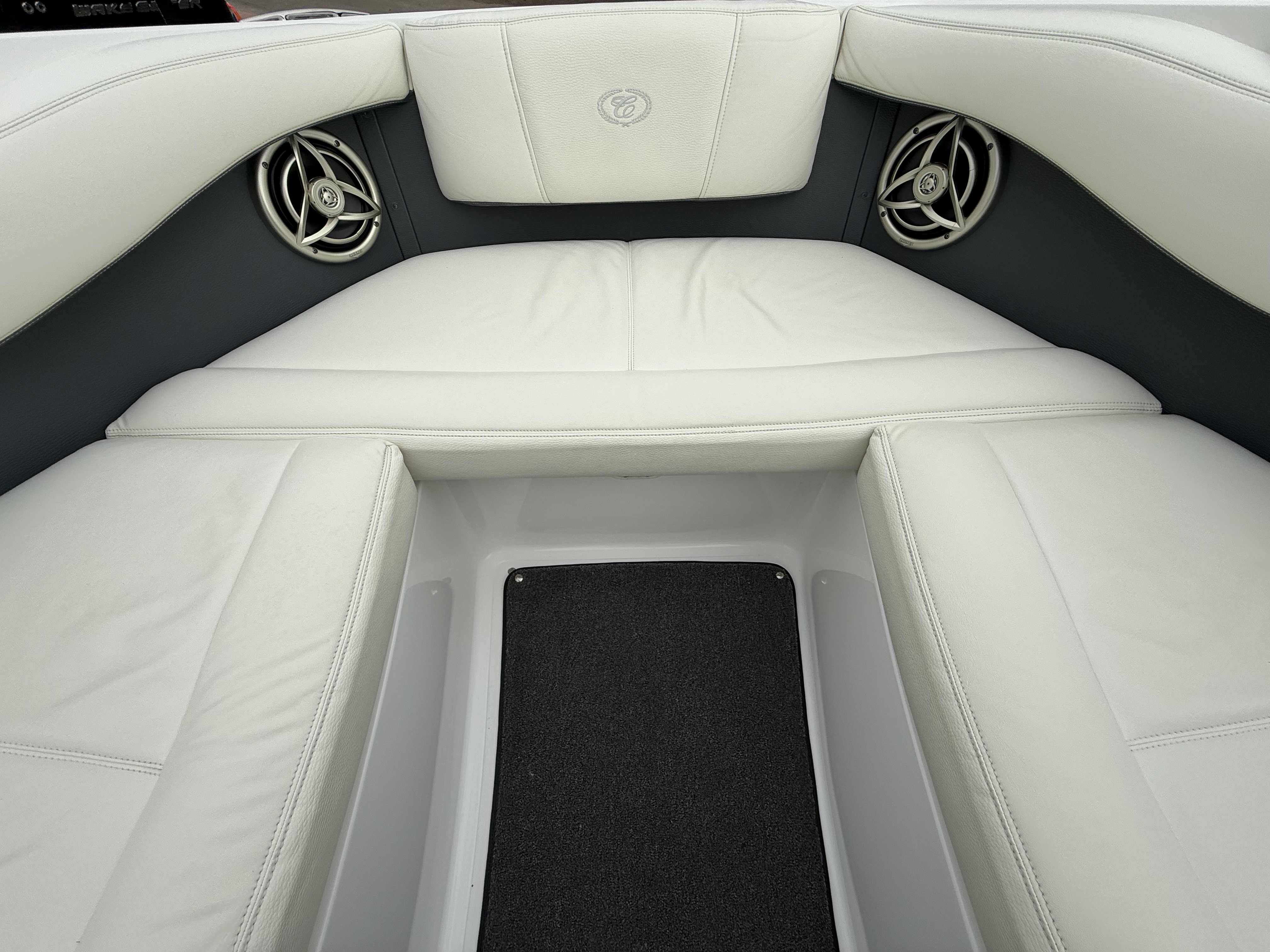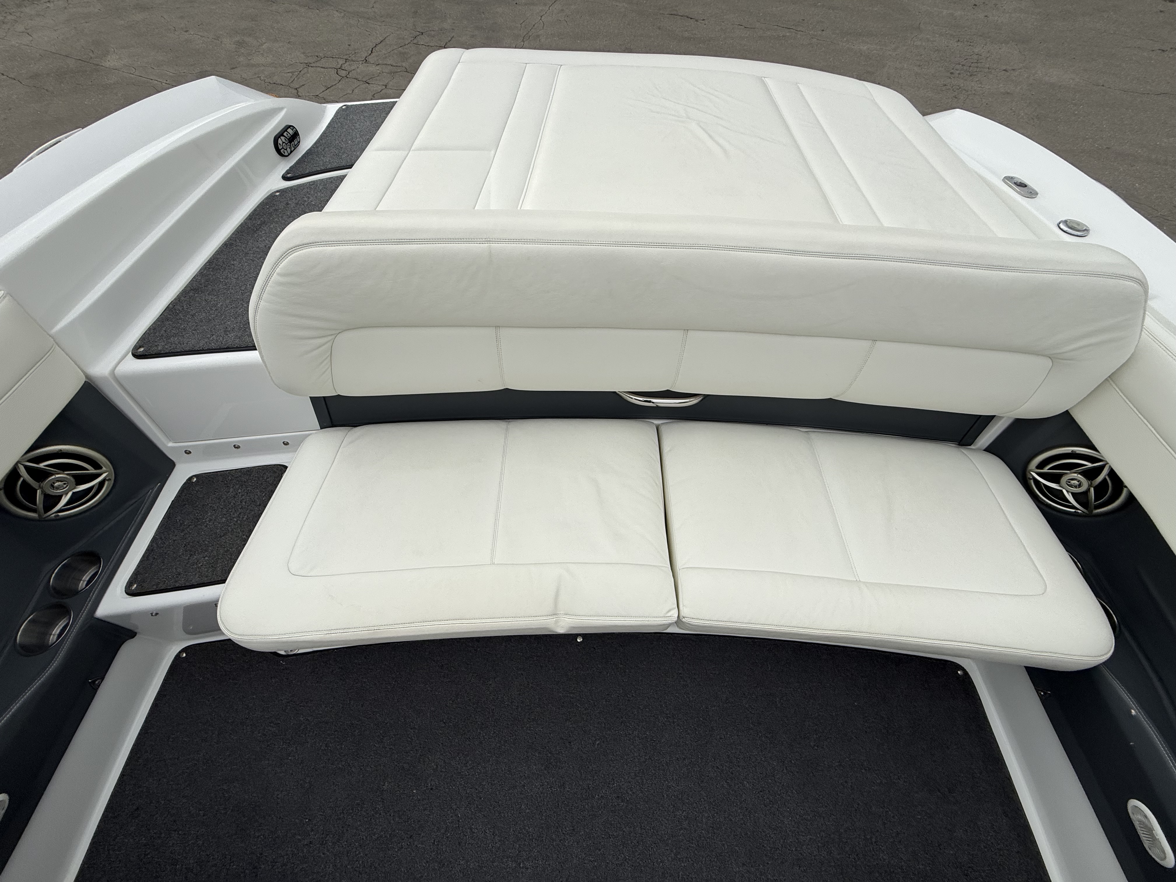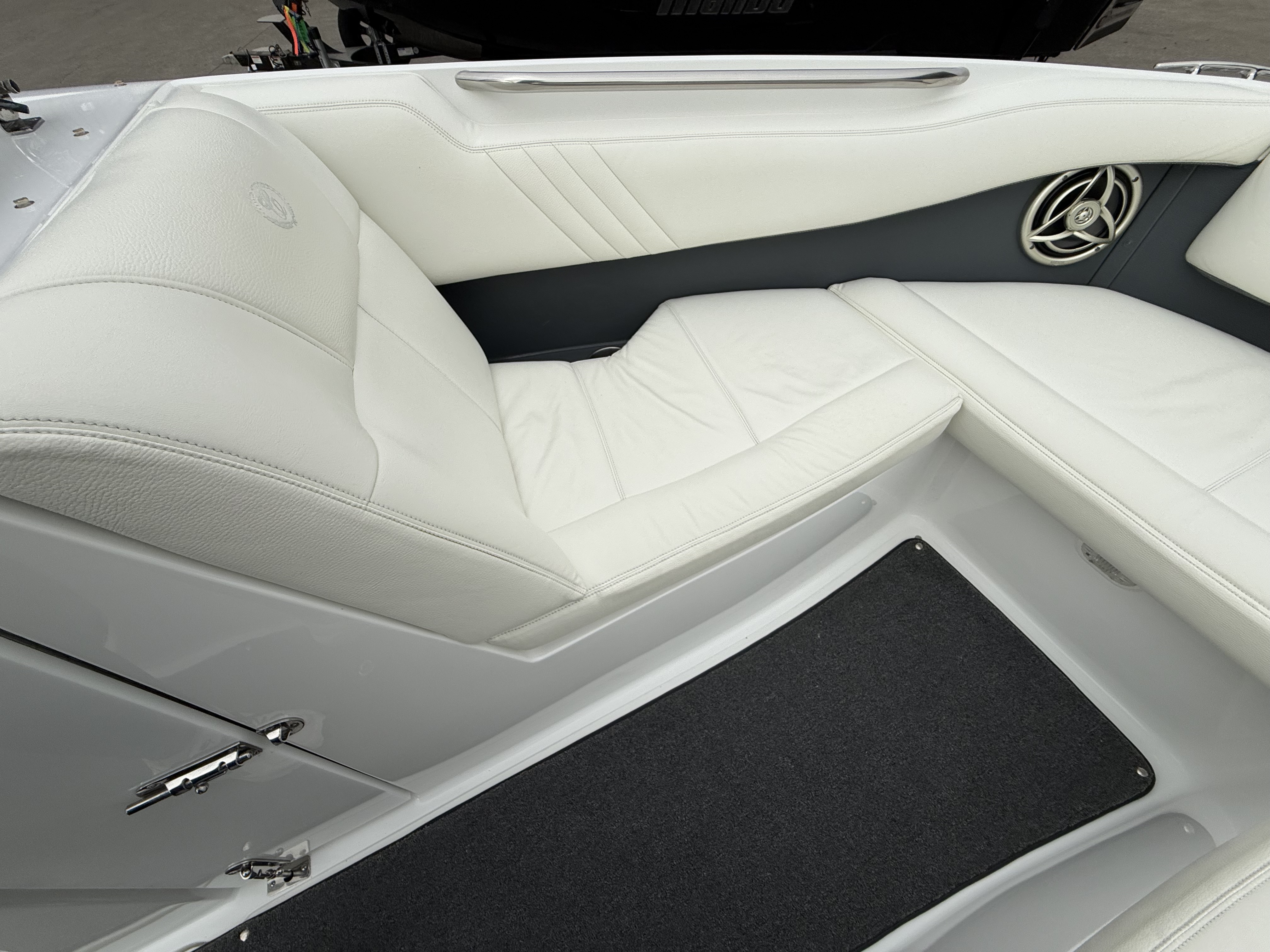 Inside, you’ll find thoughtful upgrades that enhance both comfort and style. Snap-in carpet softens the cockpit underfoot, while the walk-through filler cushion creates a full sun pad for lounging. The bow center cushion insert completes the forward seating area, making it ideal for relaxing at anchor or entertaining friends.