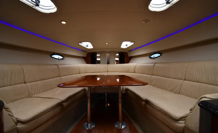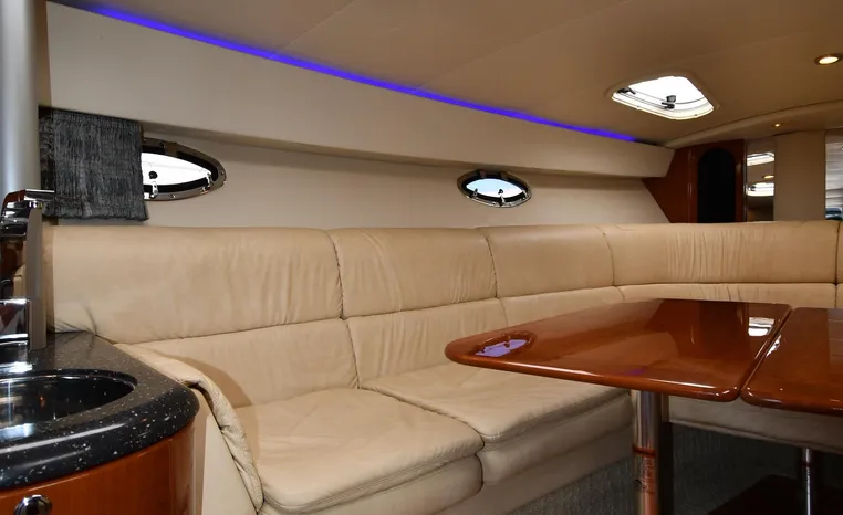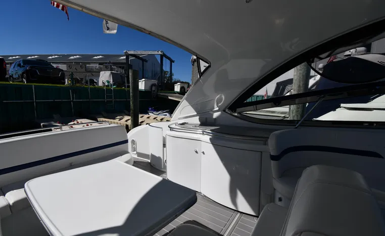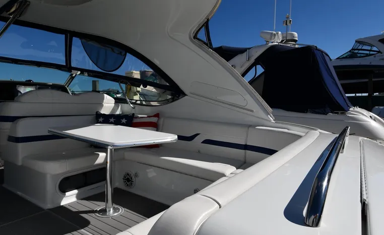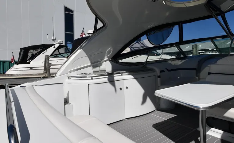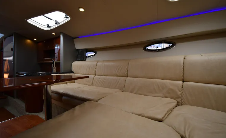 The Formula 400 Super Sport is an American-built entry into the high-performance luxury sportboat market dominated in recent years by a handful of pricey European imports. Long and narrow, the 400 is built on Formula’s “Fas3Tech” hull bottom—a double- stepped deep-V affair designed to reduce the water’s grip on the hull. The result, according to company engineers, is a faster and more stable boat that runs at near-optimal running angles without the need to constantly trim the drives. Beautifully styled, the Super Sport is a superb day boat with plenty of cockpit space and a wide- open interior. With the owner’s stateroom aft, a rich Ultraleather wraparound lounge forward and four overhead translucent hatches dominate the salon. On deck, the doublewide helm seat folds away for standup driving, and a walk-through windshield opens to a wide stretch of nonskid leading to the bow. Notable features include a recessed anchor storage compartment, a hinged storage locker at the transom, and good engine access.