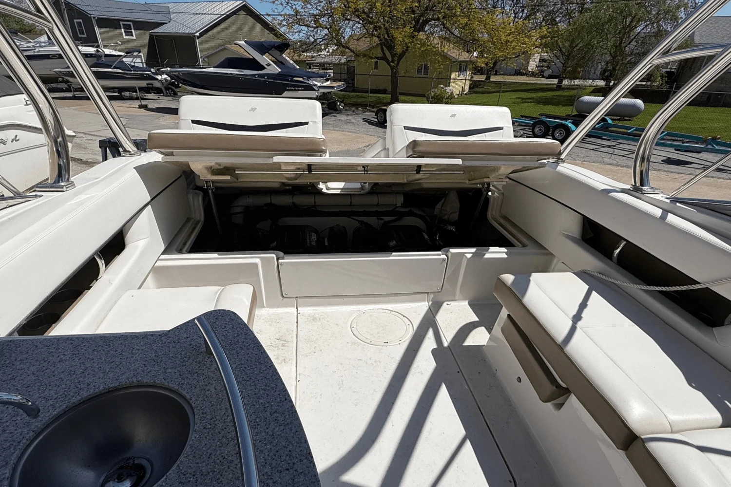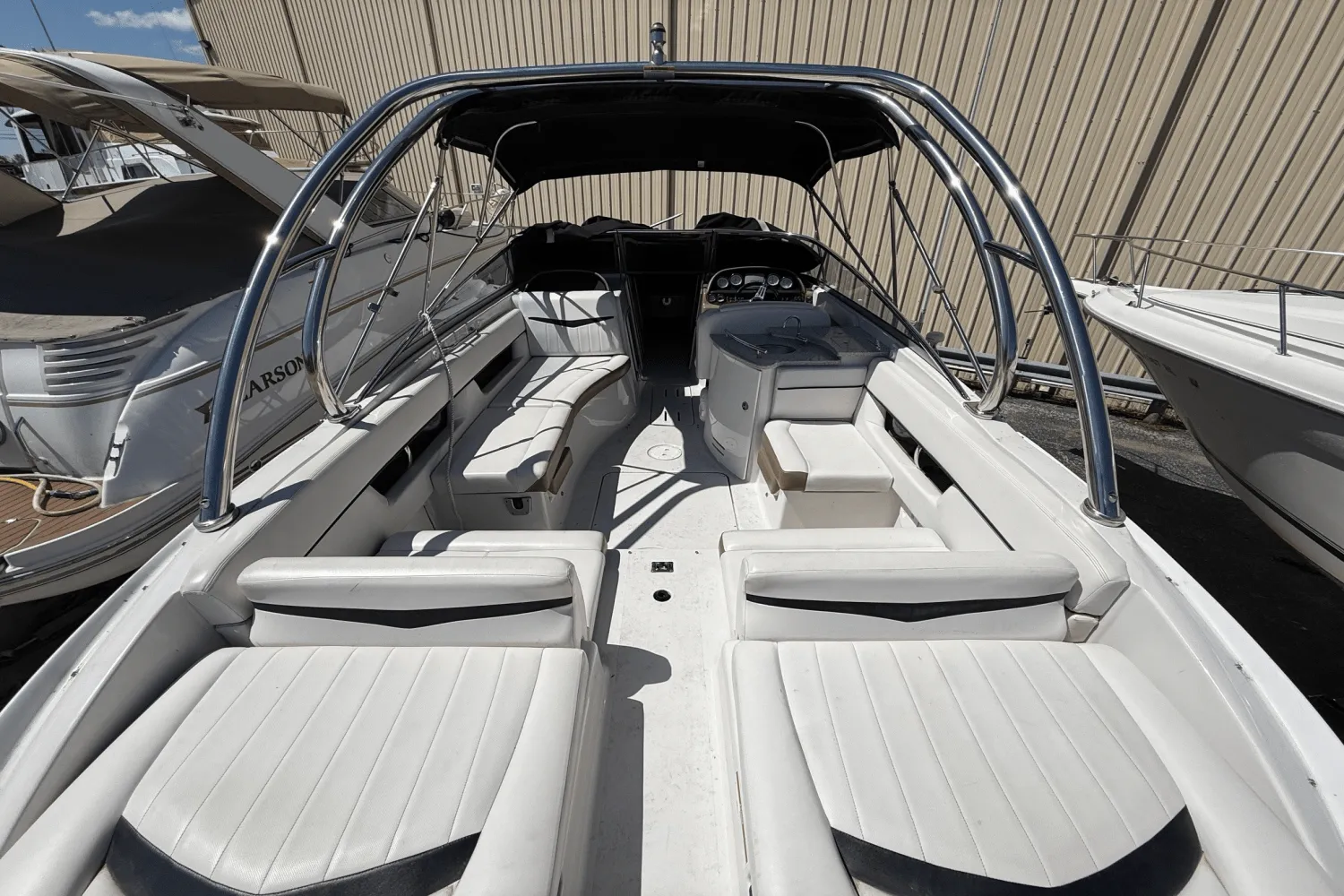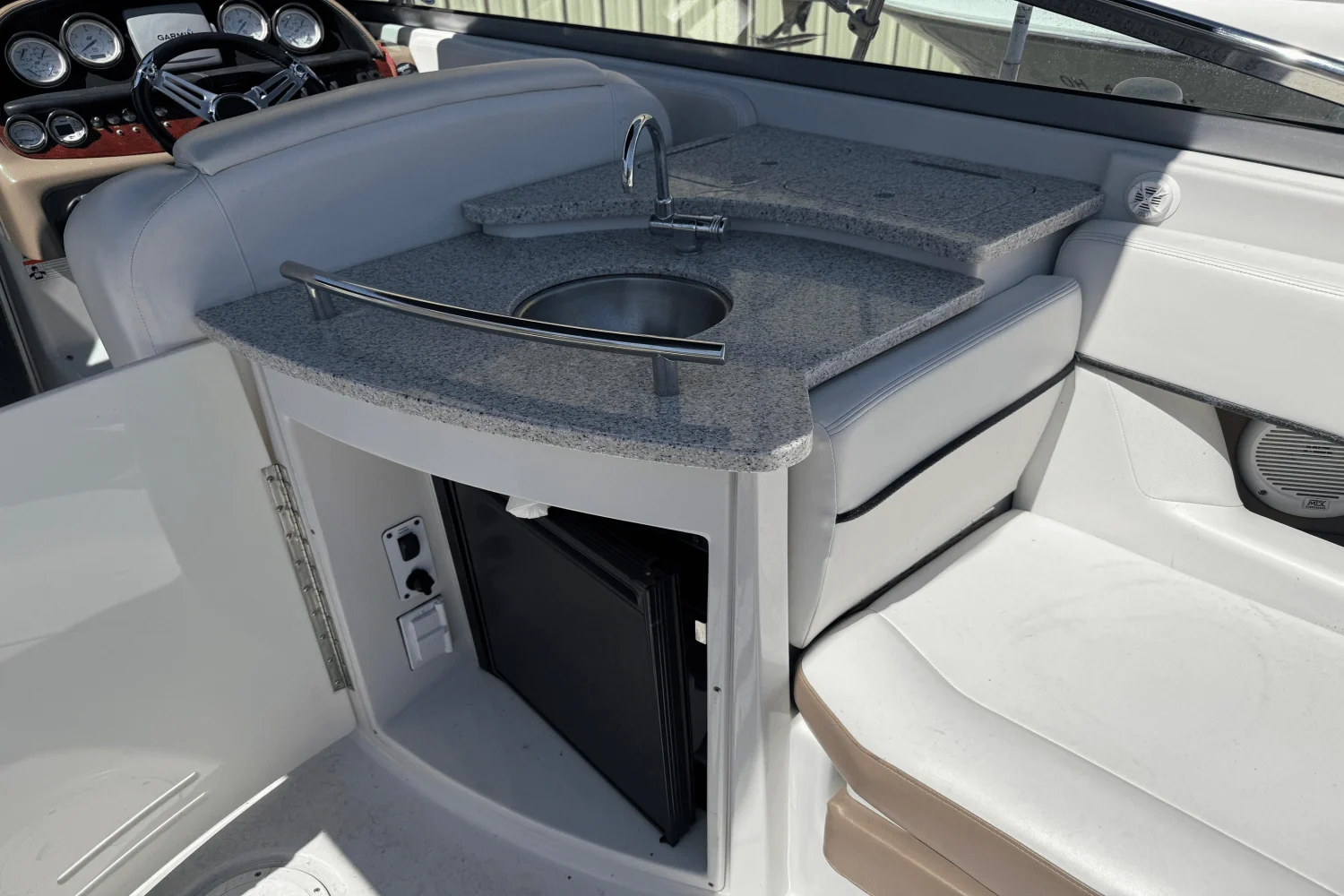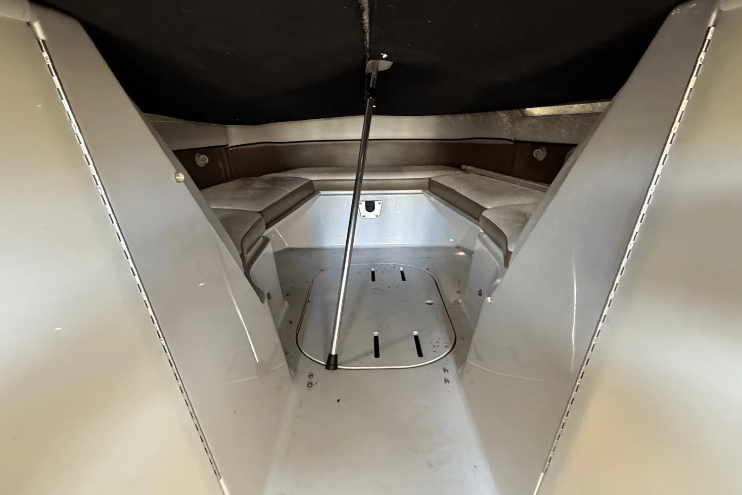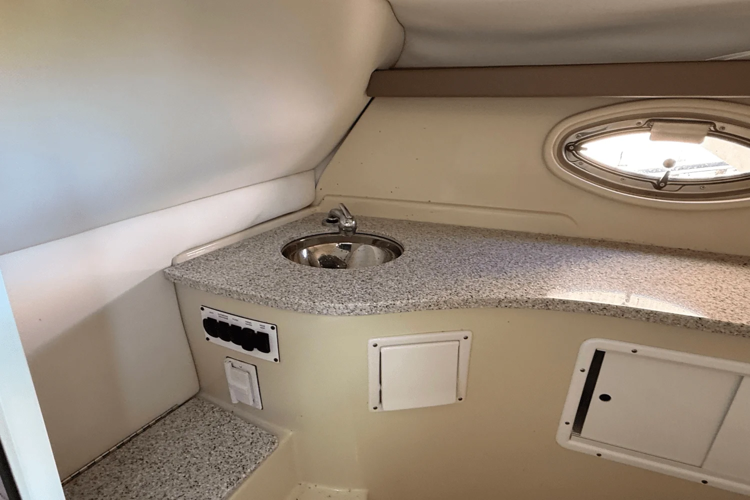 At 31 feet, the FourWinns 310 Horizonis built on a deep-V hull with cored hull sides and a solid fiberglass bottom, the Horizon's roomy cockpit offers lounge seating for eight. Twin aft sun pads convert into twin lounges, and the center transom walk thrucan be dosed off with a cushion and backrest. An enclosed head/change room is concealed within the starboard console, and asingle berth accessed from the port console extends aft under the cockpit lounge. Additional features include a cockpit wet bar with refrigerator and Conan counter, pop-up cleats, trim tabs, anchor locker, in-floor bow lockers, extended swim platform, flip cup helm seat, cockpit lights, bow filler cushions, and removable cockpit table. Options include a fiberglass radar arch {with built-in Bimini) and anchor windlass.