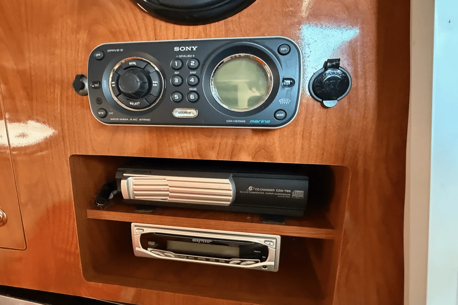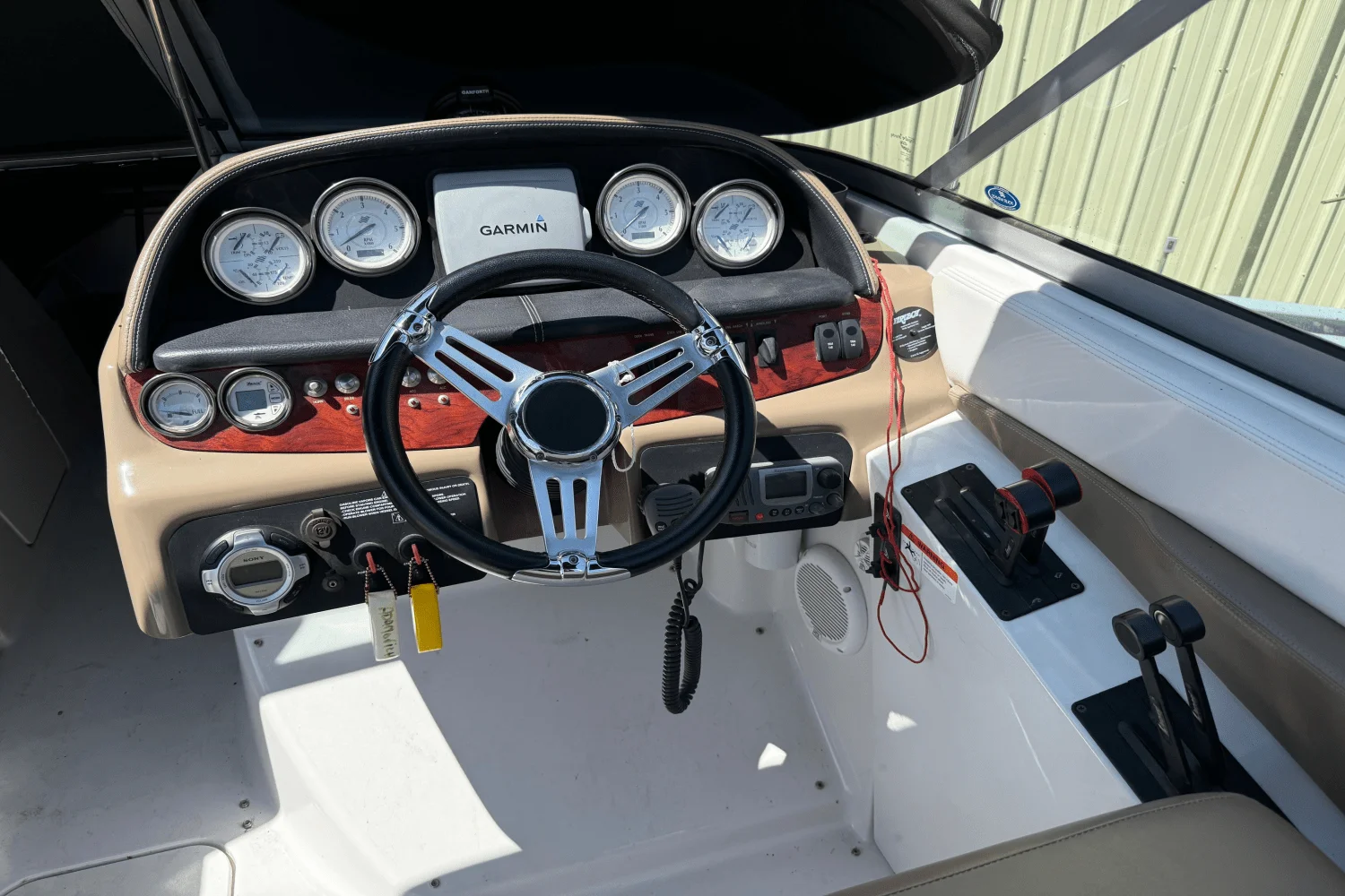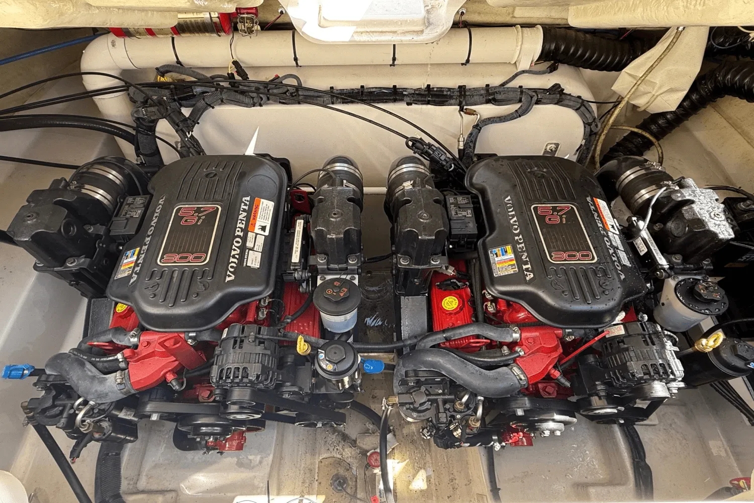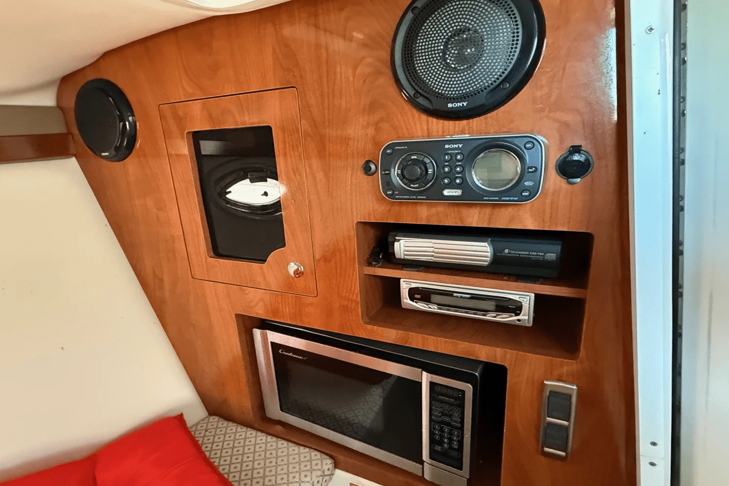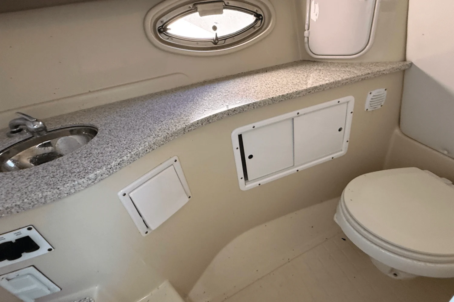 At 31 feet, the FourWinns 310 Horizonis built on a deep-V hull with cored hull sides and a solid fiberglass bottom, the Horizon's roomy cockpit offers lounge seating for eight. Twin aft sun pads convert into twin lounges, and the center transom walk thrucan be dosed off with a cushion and backrest. An enclosed head/change room is concealed within the starboard console, and asingle berth accessed from the port console extends aft under the cockpit lounge. Additional features include a cockpit wet bar with refrigerator and Conan counter, pop-up cleats, trim tabs, anchor locker, in-floor bow lockers, extended swim platform, flip cup helm seat, cockpit lights, bow filler cushions, and removable cockpit table. Options include a fiberglass radar arch {with built-in Bimini) and anchor windlass.