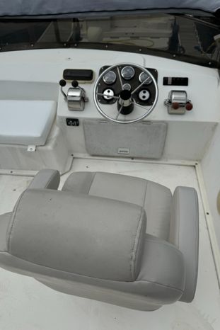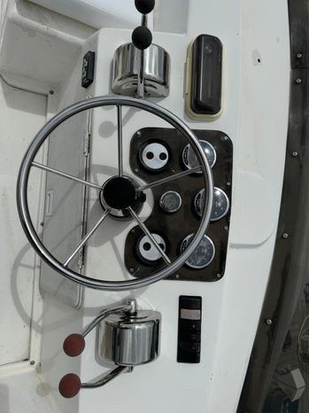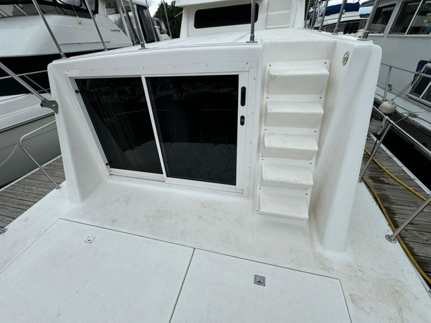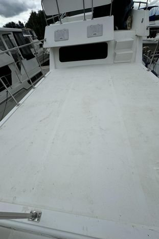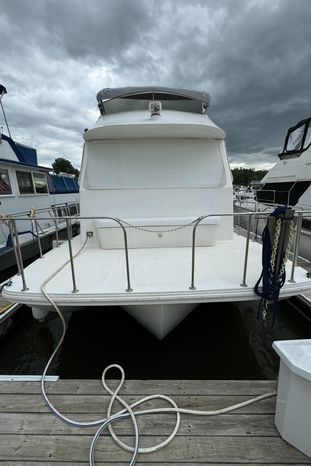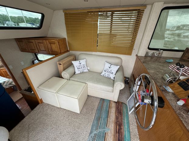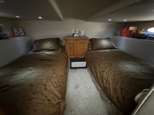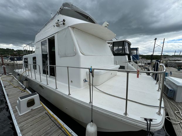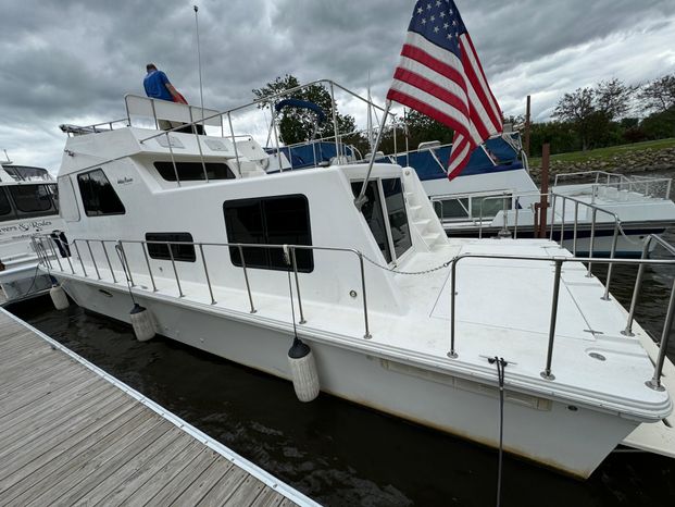 37' 2008 Holiday Mansion 37, Twin 220 HP, GM 305 CID 5.0 L, I/O stern drive, 415 approximate hours, raw water cooling, Westerbeke 8.0 KW generator, 244 approximate hours, Shore Power 12VAC electrical service, shore power cords, battery charger and inverter, Marine Air reverse cycle heating/air conditioning unit, sleeps six, master stateroom aft, island berth, electric head/vanity/shower/bath tub, salon, sofa sleeps two, beige carpet, double stainless steel sink, refrigerator/freezer, two burner electric stove, microwave oven, bimini top, remote spotlight, VHF marine radios, depth finder, one stereo with speakers, dual electric horn, foredeck bench seat, four fenders, swim platform with boarding ladder.