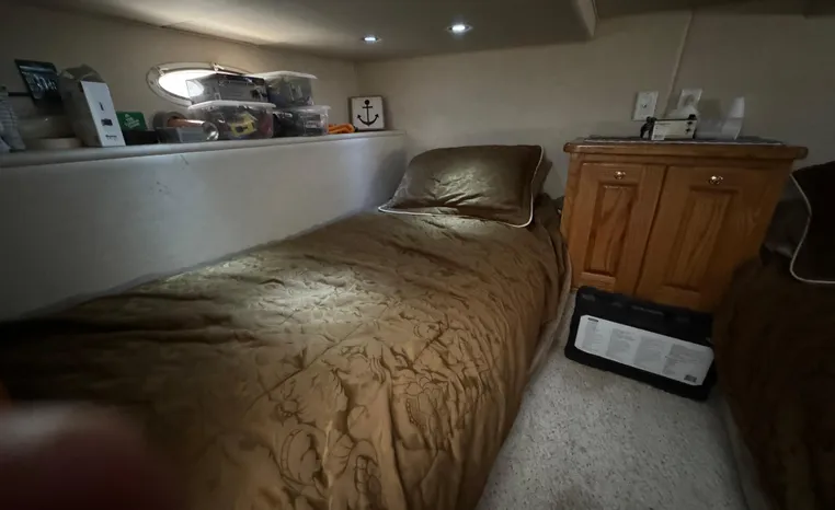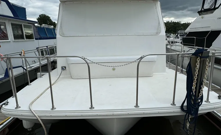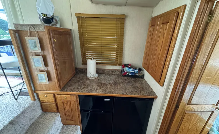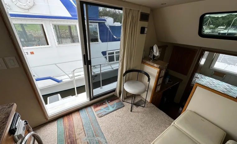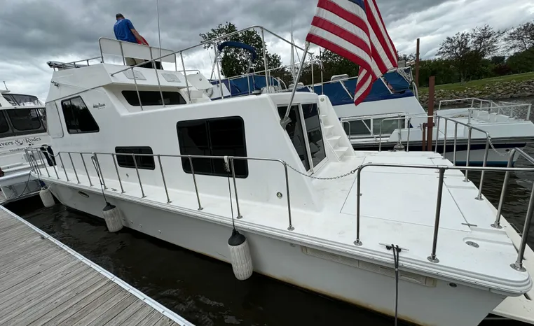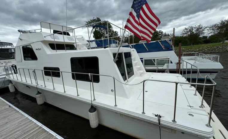 37' 2008 Holiday Mansion 37, Twin 220 HP, GM 305 CID 5.0 L, I/O stern drive, 415 approximate hours, raw water cooling, Westerbeke 8.0 KW generator, 244 approximate hours, Shore Power 12VAC electrical service, shore power cords, battery charger and inverter, Marine Air reverse cycle heating/air conditioning unit, sleeps six, master stateroom aft, island berth, electric head/vanity/shower/bath tub, salon, sofa sleeps two, beige carpet, double stainless steel sink, refrigerator/freezer, two burner electric stove, microwave oven, bimini top, remote spotlight, VHF marine radios, depth finder, one stereo with speakers, dual electric horn, foredeck bench seat, four fenders, swim platform with boarding ladder.