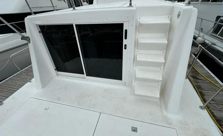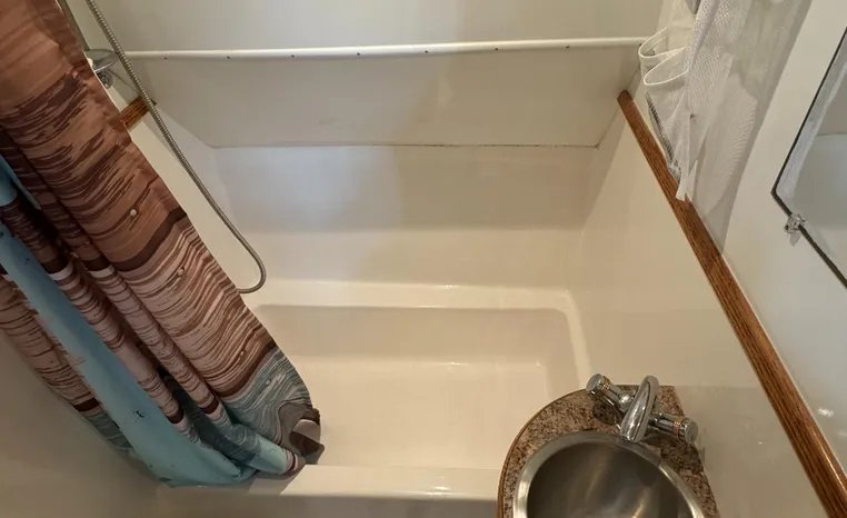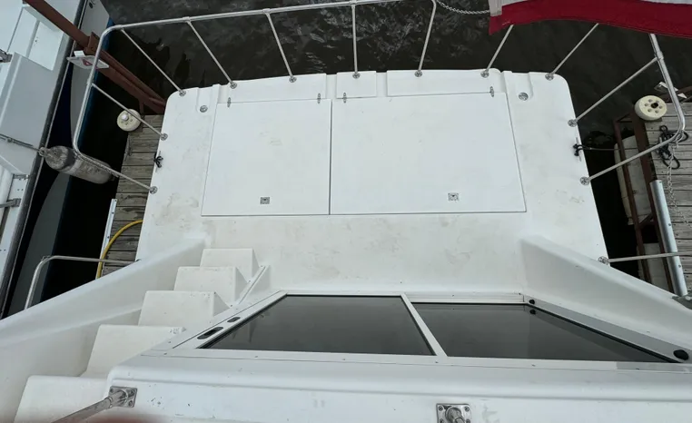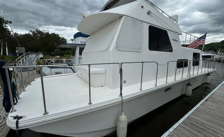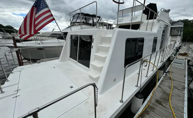 37' 2008 Holiday Mansion 37, Twin 220 HP, GM 305 CID 5.0 L, I/O stern drive, 415 approximate hours, raw water cooling, Westerbeke 8.0 KW generator, 244 approximate hours, Shore Power 12VAC electrical service, shore power cords, battery charger and inverter, Marine Air reverse cycle heating/air conditioning unit, sleeps six, master stateroom aft, island berth, electric head/vanity/shower/bath tub, salon, sofa sleeps two, beige carpet, double stainless steel sink, refrigerator/freezer, two burner electric stove, microwave oven, bimini top, remote spotlight, VHF marine radios, depth finder, one stereo with speakers, dual electric horn, foredeck bench seat, four fenders, swim platform with boarding ladder.