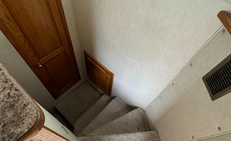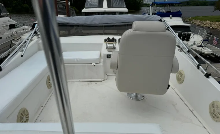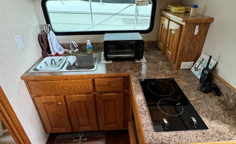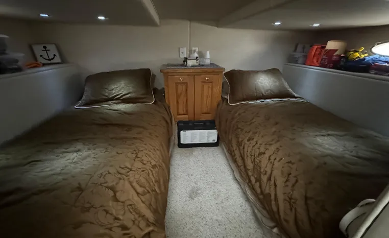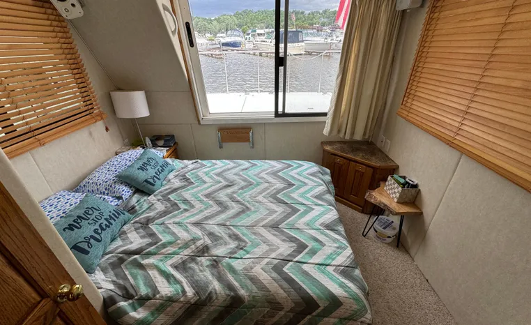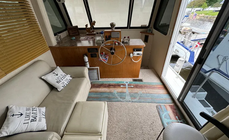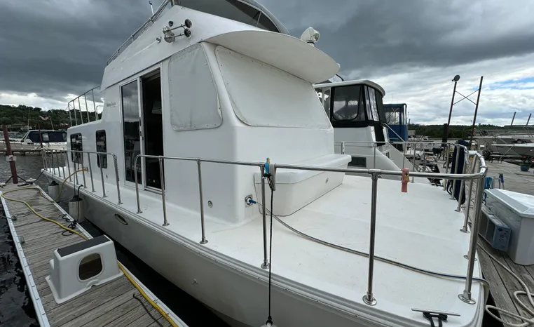 37' 2008 Holiday Mansion 37, Twin 220 HP, GM 305 CID 5.0 L, I/O stern drive, 415 approximate hours, raw water cooling, Westerbeke 8.0 KW generator, 244 approximate hours, Shore Power 12VAC electrical service, shore power cords, battery charger and inverter, Marine Air reverse cycle heating/air conditioning unit, sleeps six, master stateroom aft, island berth, electric head/vanity/shower/bath tub, salon, sofa sleeps two, beige carpet, double stainless steel sink, refrigerator/freezer, two burner electric stove, microwave oven, bimini top, remote spotlight, VHF marine radios, depth finder, one stereo with speakers, dual electric horn, foredeck bench seat, four fenders, swim platform with boarding ladder.