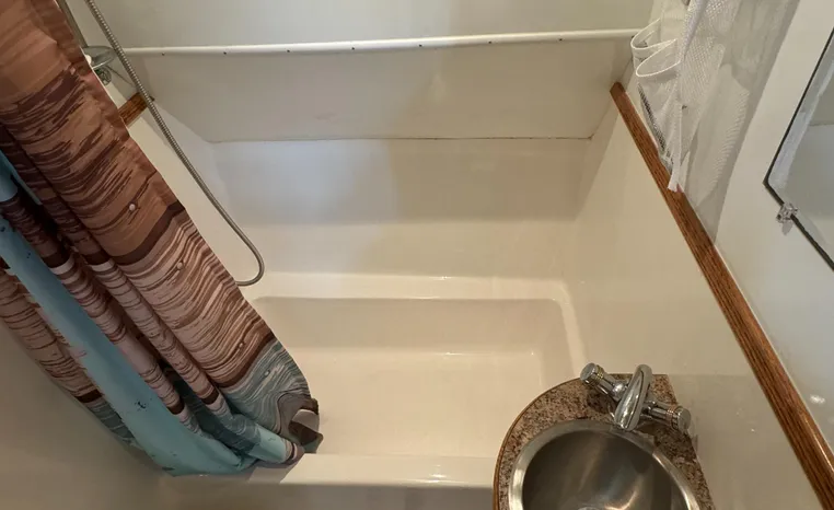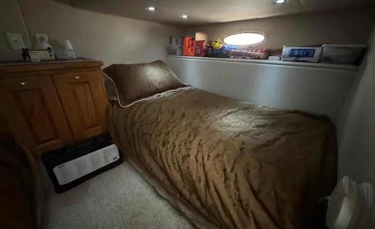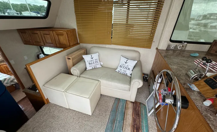 37' 2008 Holiday Mansion 37, Twin 220 HP, GM 305 CID 5.0 L, I/O stern drive, 415 approximate hours, raw water cooling, Westerbeke 8.0 KW generator, 244 approximate hours, Shore Power 12VAC electrical service, shore power cords, battery charger and inverter, Marine Air reverse cycle heating/air conditioning unit, sleeps six, master stateroom aft, island berth, electric head/vanity/shower/bath tub, salon, sofa sleeps two, beige carpet, double stainless steel sink, refrigerator/freezer, two burner electric stove, microwave oven, bimini top, remote spotlight, VHF marine radios, depth finder, one stereo with speakers, dual electric horn, foredeck bench seat, four fenders, swim platform with boarding ladder.