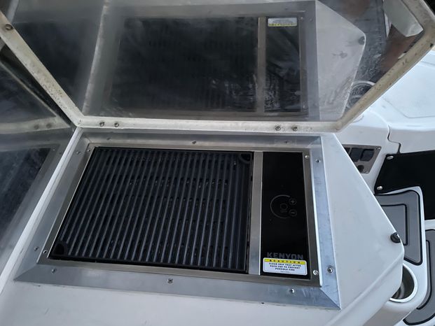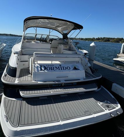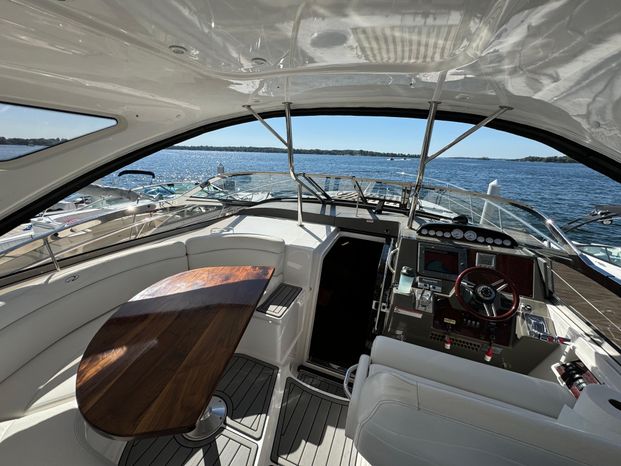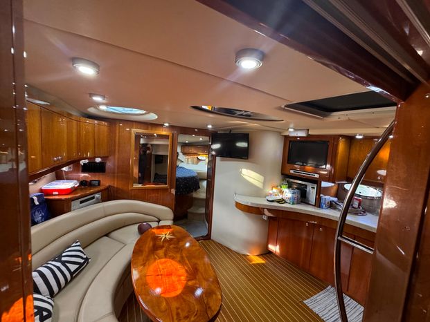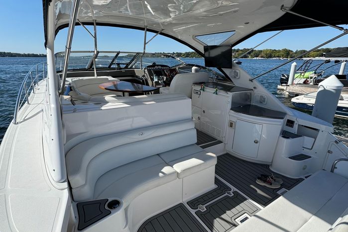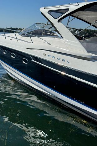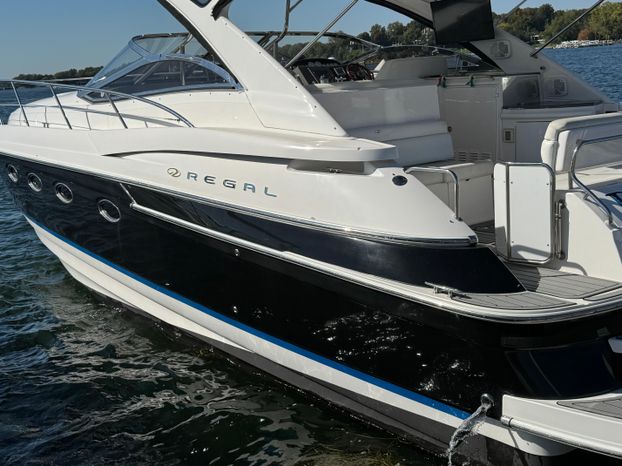 Quality fit and finish abound in this Regal Vessel. She is clean and polished throughout. As you enter the 4460 from her broad swim platform with telescoping stainless steel swim ladder, hot and cold transom shower, and stereo remote you are surrounded by quality and comfort in a 14 foot beam. The roomy lower cockpit has fore and aft, face- to-face seating and plenty of storage. Step up to the mid cockpit where the panoramic swept seating and convertible table face the dual wide helm seat and Corian wet bar housing a stove, refrigerator and ice maker. A safe bow access is accommodated via the through windshield access where a large sun pad chaise lounge welcomes family and guests. Her foredeck or helm operated windlass anchoring system sports easy access to the chain locker and wash-down.