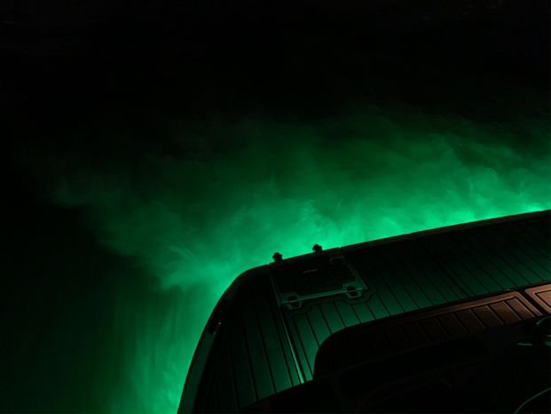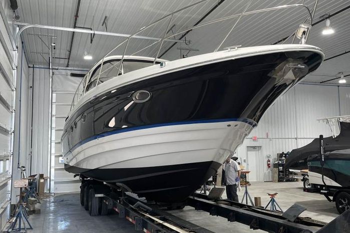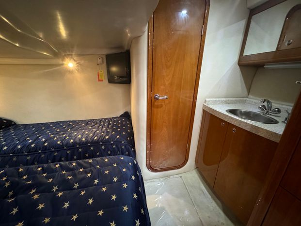Heading below through her sliding companionway door, you are in awe of the beautifully polished and glowing Cherry Wood décor and cabinetry. To port, her 7 plus foot swept lounge and dinette seating converts to a settee by lowering the solid Cherry table. The galley to starboard is sensibly laid out with all the amenities and storage galore. Forward is the Master suite with private head and large separate stall shower. The queen custom mattress is as comfortable as it gets. Large hanging locker and storage drawers abound. Separate AC controls and flat screen TV. Mid ship is a large solid Cherry pocket door leading to the mid cabin. The twin bunks convert to a queen and the large vanity mirror has loads of storage. To port, is the vanity and separate enclosed head and shower for guests' comfort and privacy.