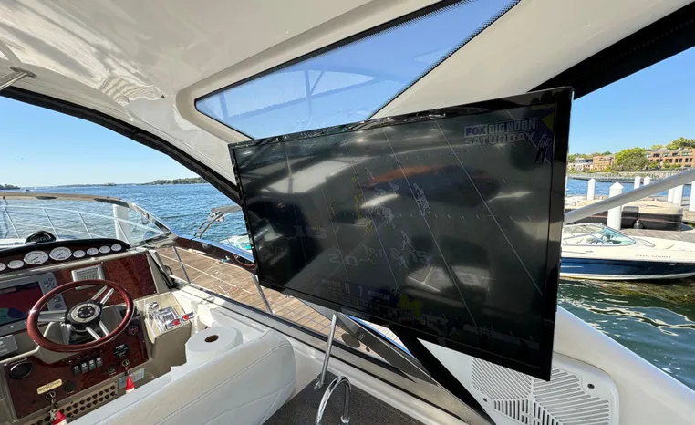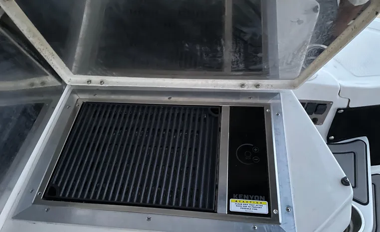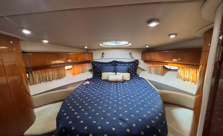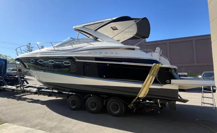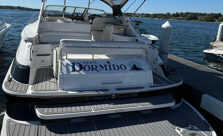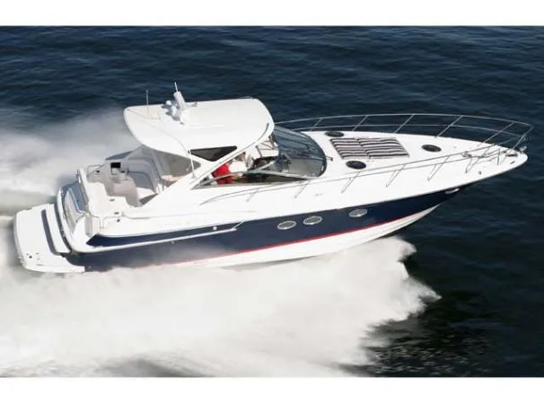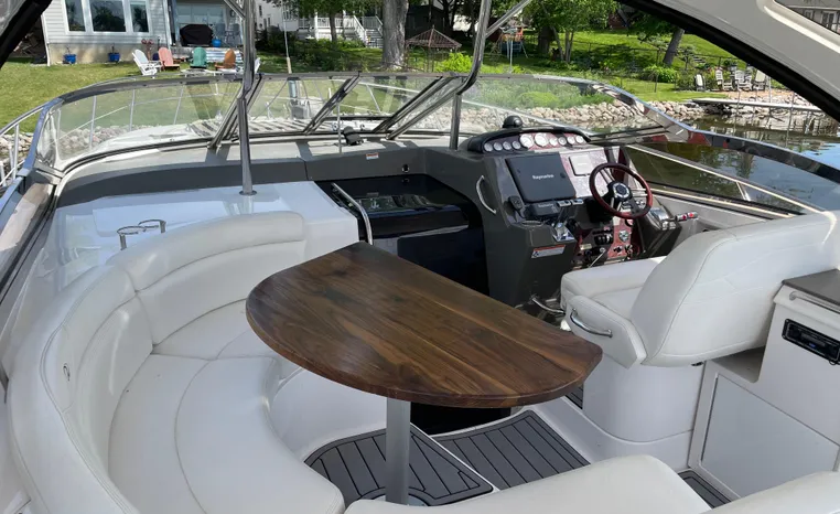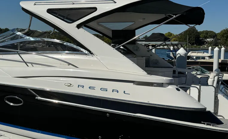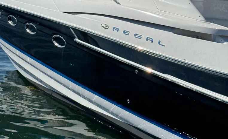 Quality fit and finish abound in this Regal Vessel. She is clean and polished throughout. As you enter the 4460 from her broad swim platform with telescoping stainless steel swim ladder, hot and cold transom shower, and stereo remote you are surrounded by quality and comfort in a 14 foot beam. The roomy lower cockpit has fore and aft, face- to-face seating and plenty of storage. Step up to the mid cockpit where the panoramic swept seating and convertible table face the dual wide helm seat and Corian wet bar housing a stove, refrigerator and ice maker. A safe bow access is accommodated via the through windshield access where a large sun pad chaise lounge welcomes family and guests. Her foredeck or helm operated windlass anchoring system sports easy access to the chain locker and wash-down.