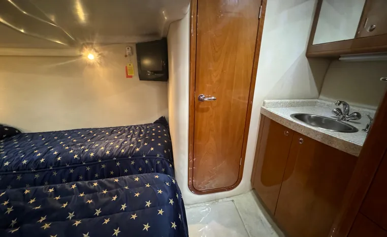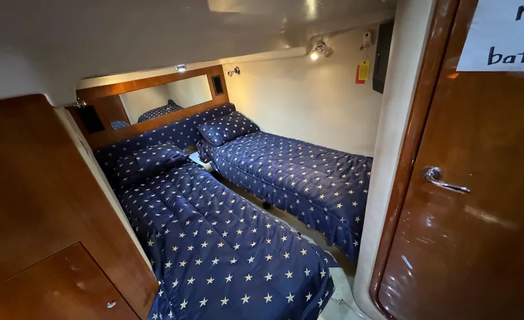 Heading below through her sliding companionway door, you are in awe of the beautifully polished and glowing Cherry Wood décor and cabinetry. To port, her 7 plus foot swept lounge and dinette seating converts to a settee by lowering the solid Cherry table. The galley to starboard is sensibly laid out with all the amenities and storage galore. Forward is the Master suite with private head and large separate stall shower. The queen custom mattress is as comfortable as it gets. Large hanging locker and storage drawers abound. Separate AC controls and flat screen TV. Mid ship is a large solid Cherry pocket door leading to the mid cabin. The twin bunks convert to a queen and the large vanity mirror has loads of storage. To port, is the vanity and separate enclosed head and shower for guests' comfort and privacy.