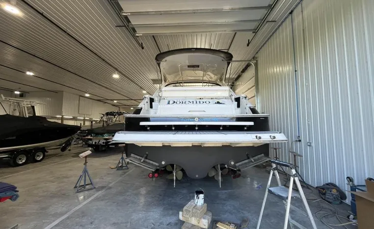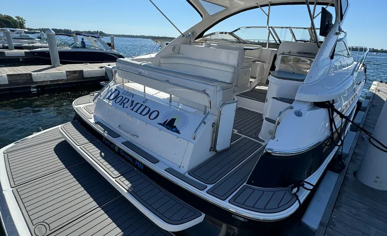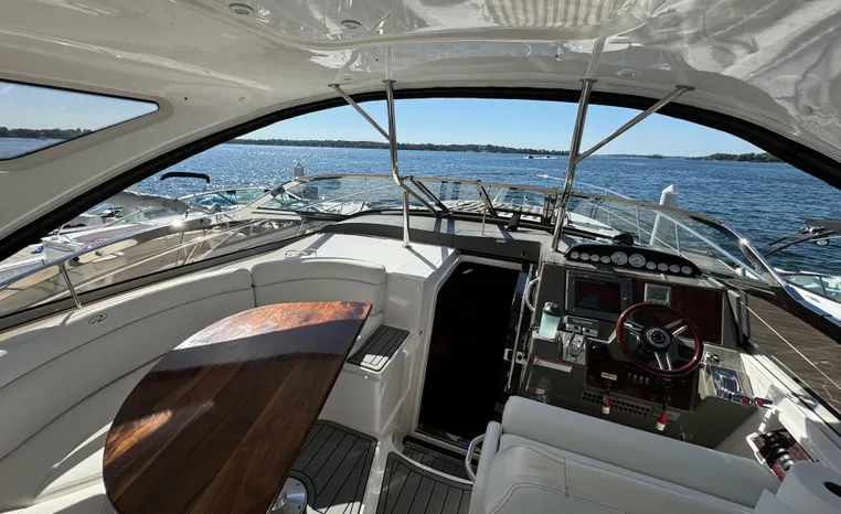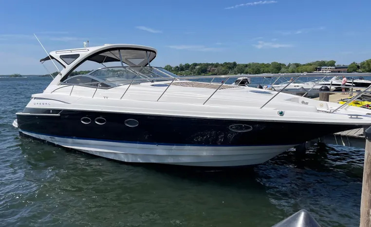 Quality fit and finish abound in this Regal Vessel. She is clean and polished throughout. As you enter the 4460 from her broad swim platform with telescoping stainless steel swim ladder, hot and cold transom shower, and stereo remote you are surrounded by quality and comfort in a 14 foot beam. The roomy lower cockpit has fore and aft, face- to-face seating and plenty of storage. Step up to the mid cockpit where the panoramic swept seating and convertible table face the dual wide helm seat and Corian wet bar housing a stove, refrigerator and ice maker. A safe bow access is accommodated via the through windshield access where a large sun pad chaise lounge welcomes family and guests. Her foredeck or helm operated windlass anchoring system sports easy access to the chain locker and wash-down.