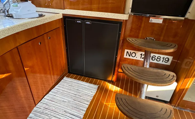 Heading below through her sliding companionway door, you are in awe of the beautifully polished and glowing Cherry Wood décor and cabinetry. To port, her 7 plus foot swept lounge and dinette seating converts to a settee by lowering the solid Cherry table. The galley to starboard is sensibly laid out with all the amenities and storage galore. Forward is the Master suite with private head and large separate stall shower. The queen custom mattress is as comfortable as it gets. Large hanging locker and storage drawers abound. Separate AC controls and flat screen TV. Mid ship is a large solid Cherry pocket door leading to the mid cabin. The twin bunks convert to a queen and the large vanity mirror has loads of storage. To port, is the vanity and separate enclosed head and shower for guests' comfort and privacy.
