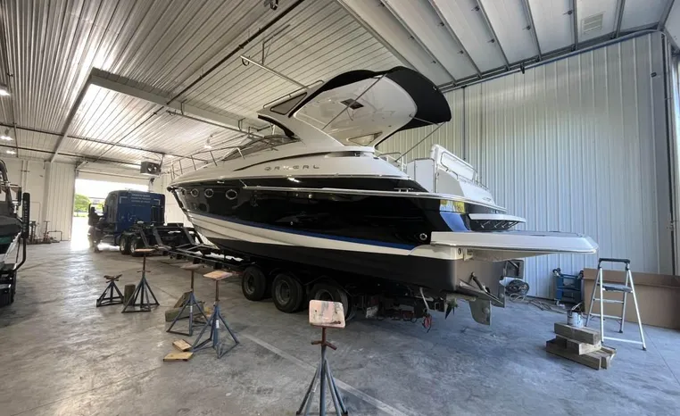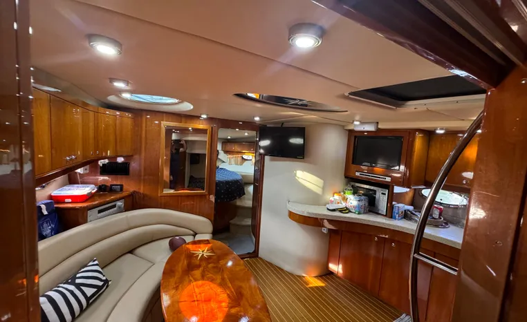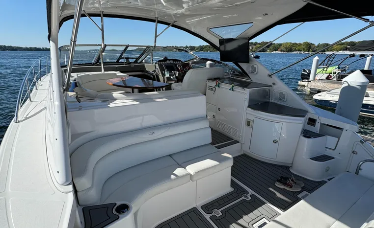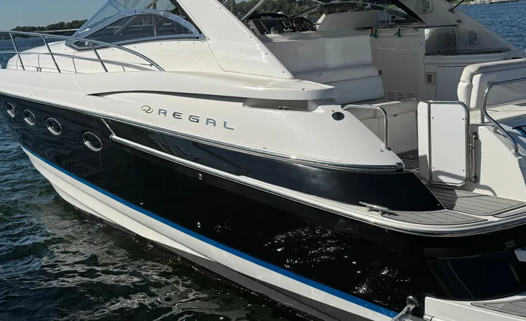 Quality fit and finish abound in this Regal Vessel. She is clean and polished throughout. As you enter the 4460 from her broad swim platform with telescoping stainless steel swim ladder, hot and cold transom shower, and stereo remote you are surrounded by quality and comfort in a 14 foot beam. The roomy lower cockpit has fore and aft, face- to-face seating and plenty of storage. Step up to the mid cockpit where the panoramic swept seating and convertible table face the dual wide helm seat and Corian wet bar housing a stove, refrigerator and ice maker. A safe bow access is accommodated via the through windshield access where a large sun pad chaise lounge welcomes family and guests. Her foredeck or helm operated windlass anchoring system sports easy access to the chain locker and wash-down.