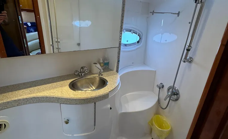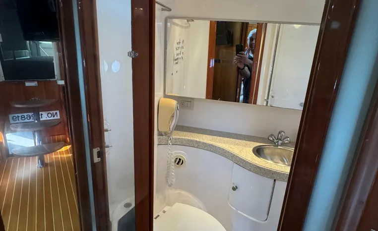 Heading below through her sliding companionway door, you are in awe of the beautifully polished and glowing Cherry Wood décor and cabinetry. To port, her 7 plus foot swept lounge and dinette seating converts to a settee by lowering the solid Cherry table. The galley to starboard is sensibly laid out with all the amenities and storage galore. Forward is the Master suite with private head and large separate stall shower. The queen custom mattress is as comfortable as it gets. Large hanging locker and storage drawers abound. Separate AC controls and flat screen TV. Mid ship is a large solid Cherry pocket door leading to the mid cabin. The twin bunks convert to a queen and the large vanity mirror has loads of storage. To port, is the vanity and separate enclosed head and shower for guests' comfort and privacy.