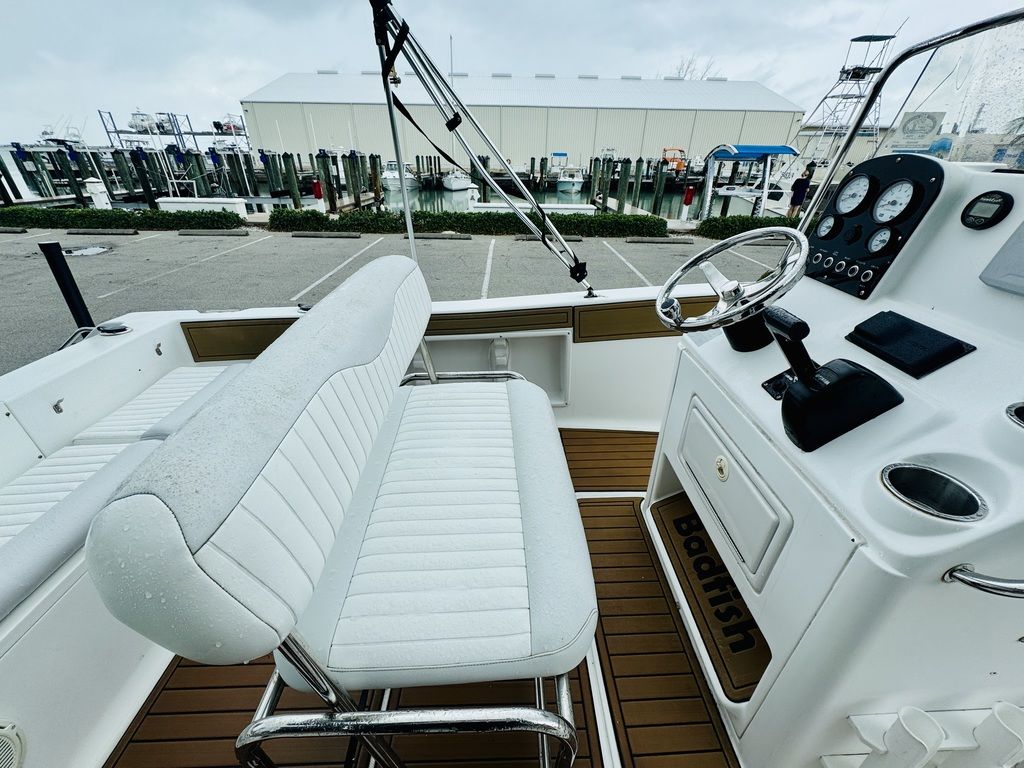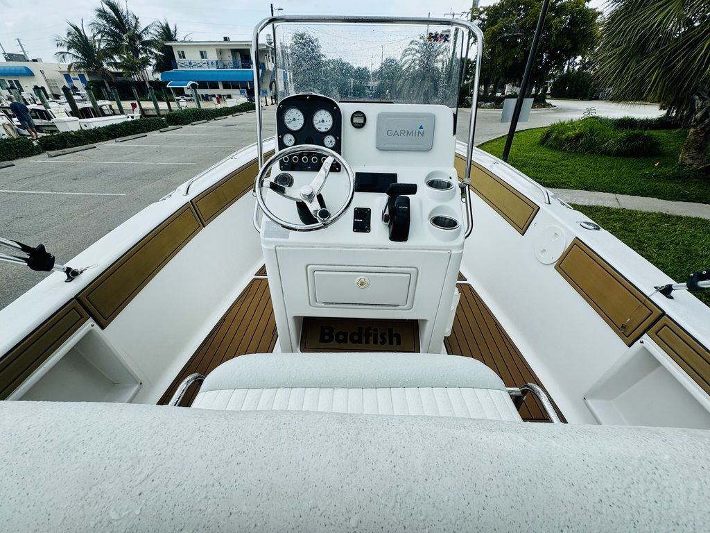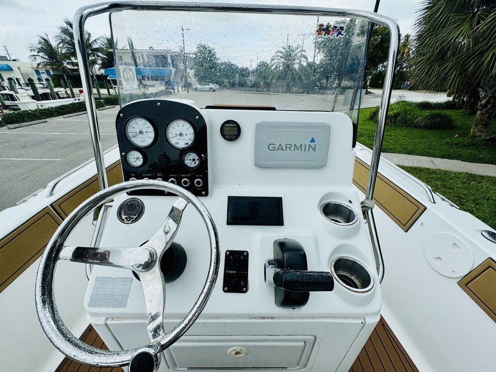 -Center console with windscreen, stainless grab rail, and compass.