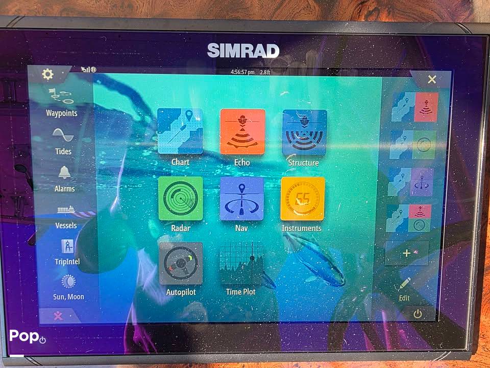 The boat is powered by efficient Mercury 350 Mag engines with Mercruiser outdrives. With only 730 hours of run-time, and equipped with a Simrad MFD and radar.