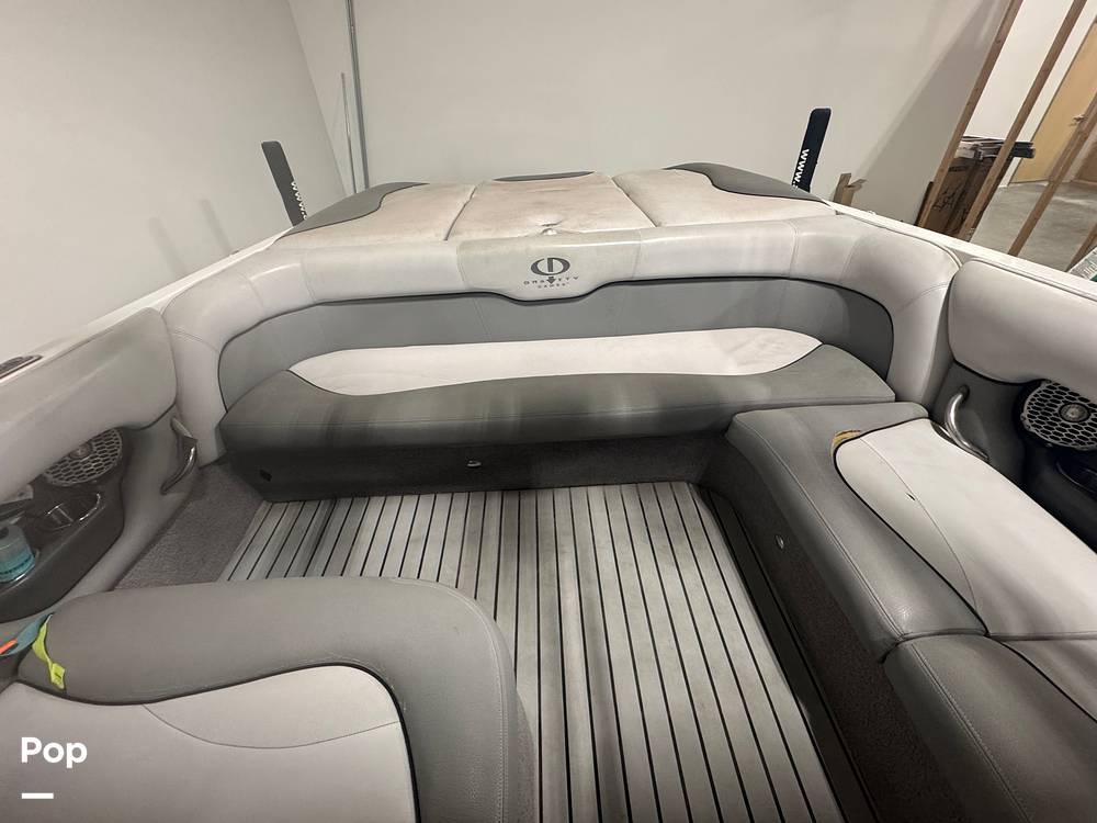 One of the most recognizable features of the Gravity Games Edition is its wakeboard tower--a sturdy aluminum structure rising above the cockpit. The tower typically includes board racks, tower speakers, and towing points positioned high above the water, allowing riders to achieve better lift and longer airtime. The graphics package, often featuring bold "Gravity Games" branding, gives the boat a distinctive, performance-oriented appearance.