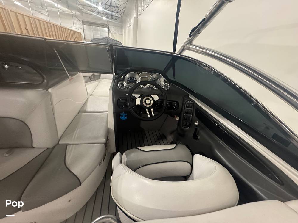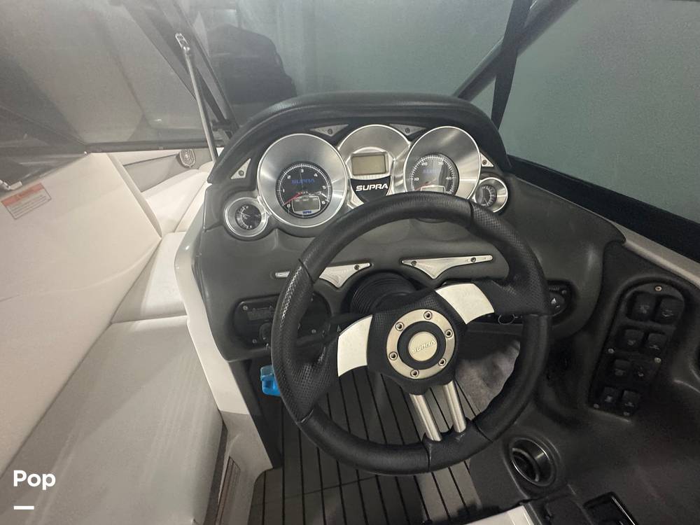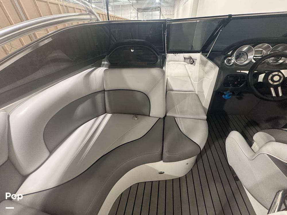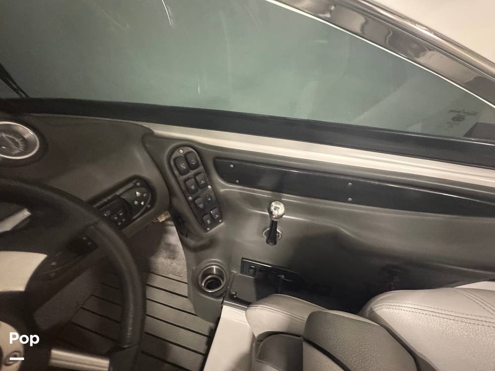The cockpit is designed with both riders and passengers in mind. Wraparound seating lines the interior, offering room for a large crew to relax between sets. Plush marine upholstery, integrated storage compartments, and a thoughtfully arranged helm create an environment that feels both functional and comfortable. The driver's station features a straightforward dashboard layout with analog gauges, easy-to-reach ballast controls, and a commanding view over the bow.