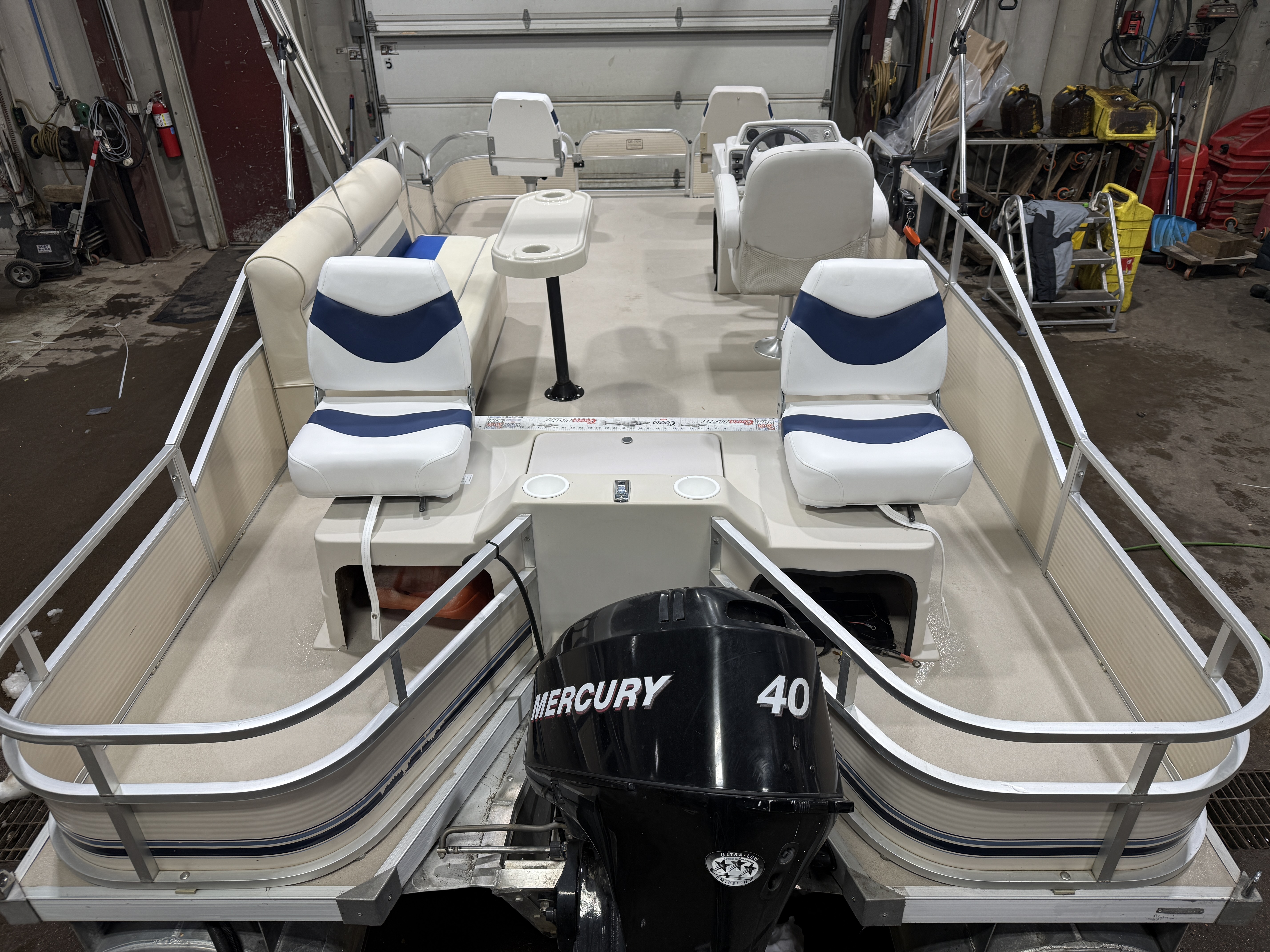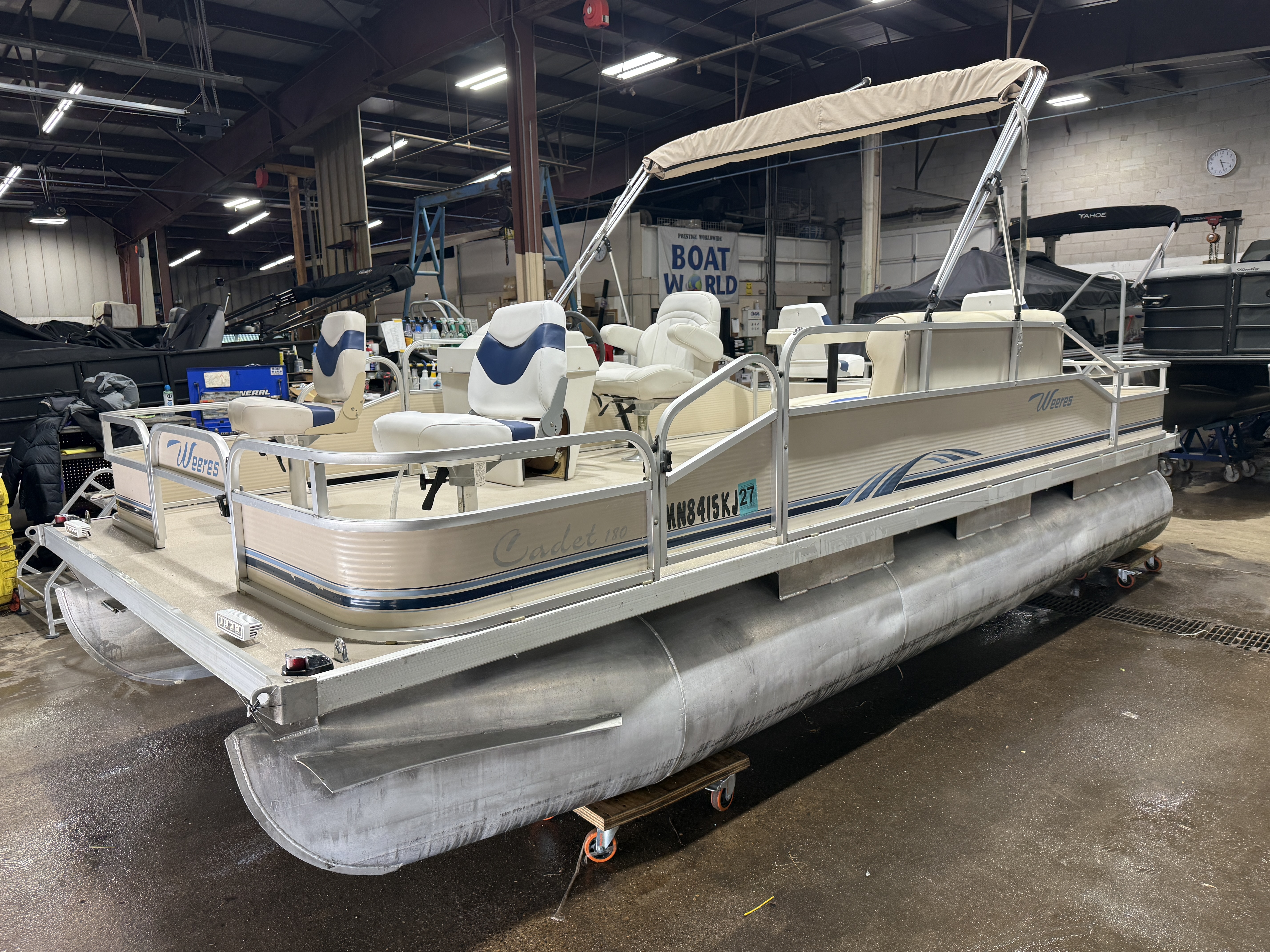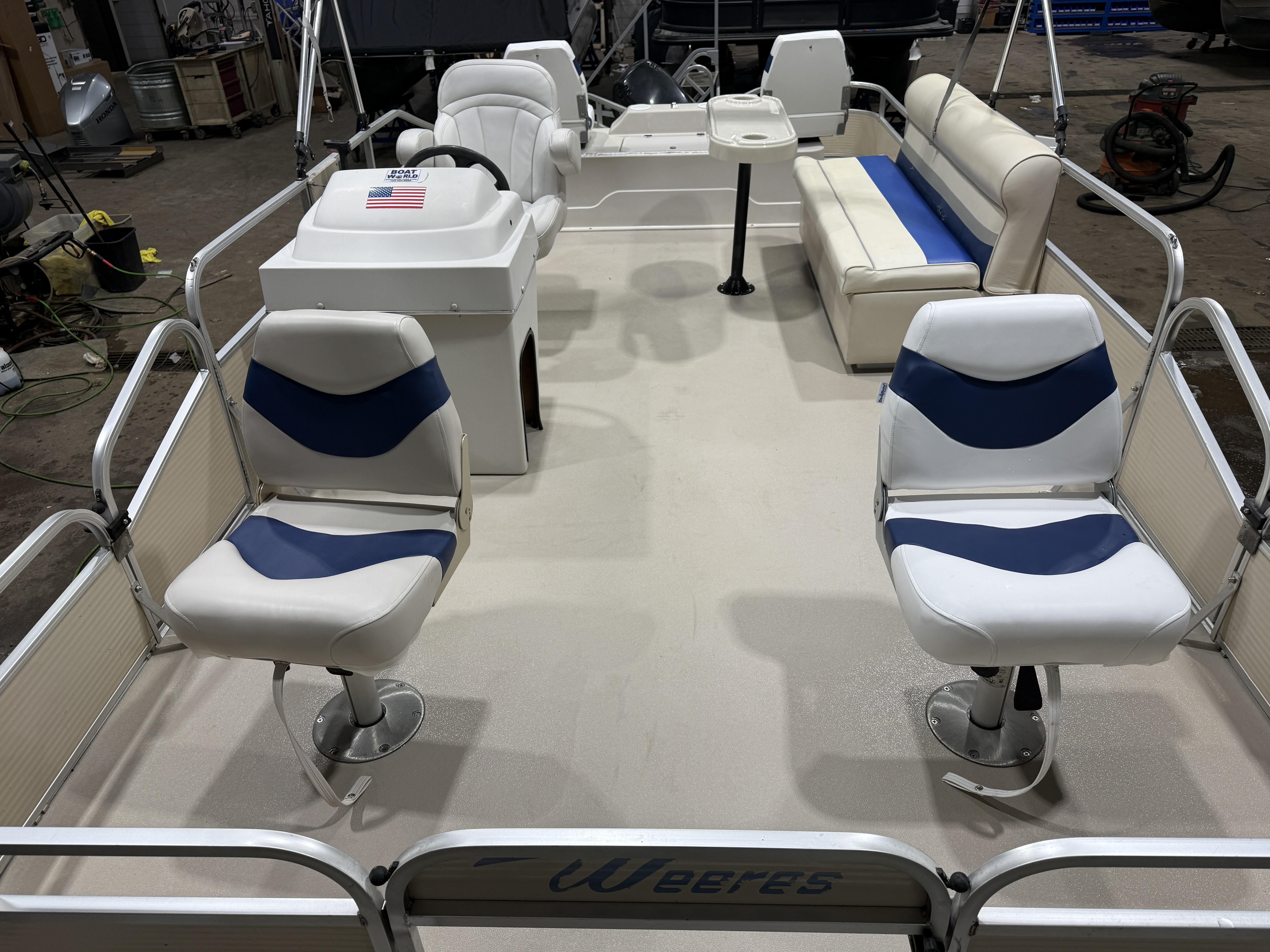 2008 Weeres 180 Cadet Quad Fish Pontoon & Mercury 40HP 4-Stroke EFI. This 18' Quad Fish Pontoon Has 2 Fishing Seats Up Front, Portside Bench Seating With Storage, Captain's Chair, Two Rear Fishing Seats, Rear Livewell, All Vinyl Floor, Front 1/2 Gate, Port & Starboard Side Entry Gates, Bimini Top, Helm Storage, Table, NAV Lights, Docking Lights, Gas Tank, New Starting Battery.