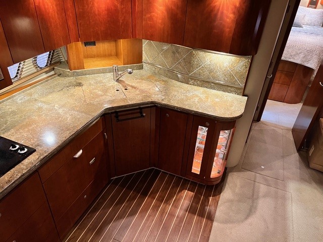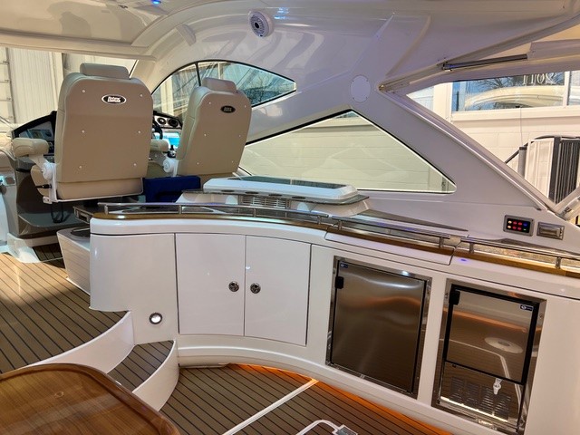 The cockpit is built for entertaining, featuring a fully equipped galley complete with a refrigerator, electric grill, and ice maker—perfect for seamless outdoor dining and social gatherings.