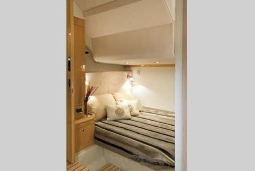 The V435's lines are low and sleek. The look is clean and modular. There's just enough edginess and detail to delight the eye. Check out the recessed circular deck hatches, which are centered within annular skylights. Take in the accent shadows created by the sharp edges of the integral radar arch. Gaze down the after edge of the top to the chromed engine intake vents. These look cool, and above the sheer, they protect your engine from spray. A favorite accent is Four Winns carried the broad, red painted bootstripe out and around the swim platform like the edge band of a custom table.