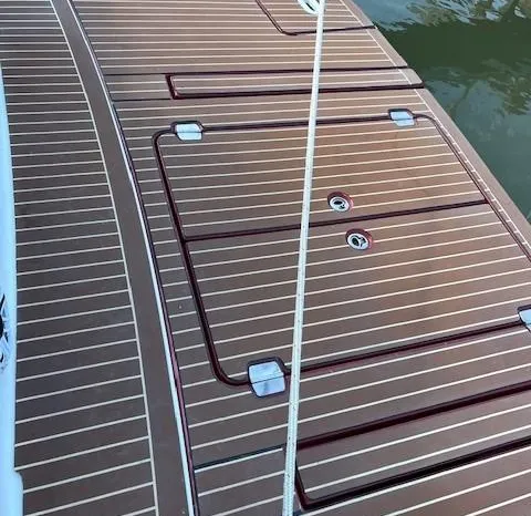Aft, the sheer remains straight, instead of diving in a droopy arc to the waterline. This keeps the hull-to-deck joint far above the waterline and less susceptible to leaks, especially if you accidentally bump a piling. It also provides more interior volume because the lower the sheer, the shorter the hull. Shorter hulls need taller decks to achieve adequate freeboard. For structural and molding reasons, tall decks angle inboard.