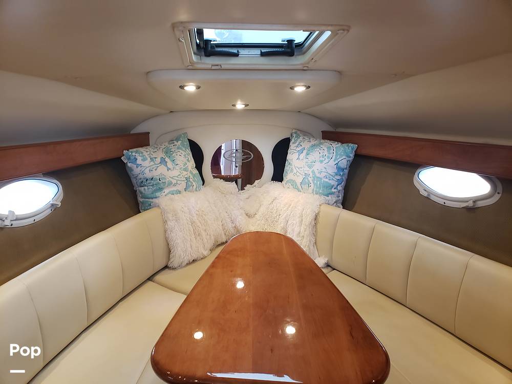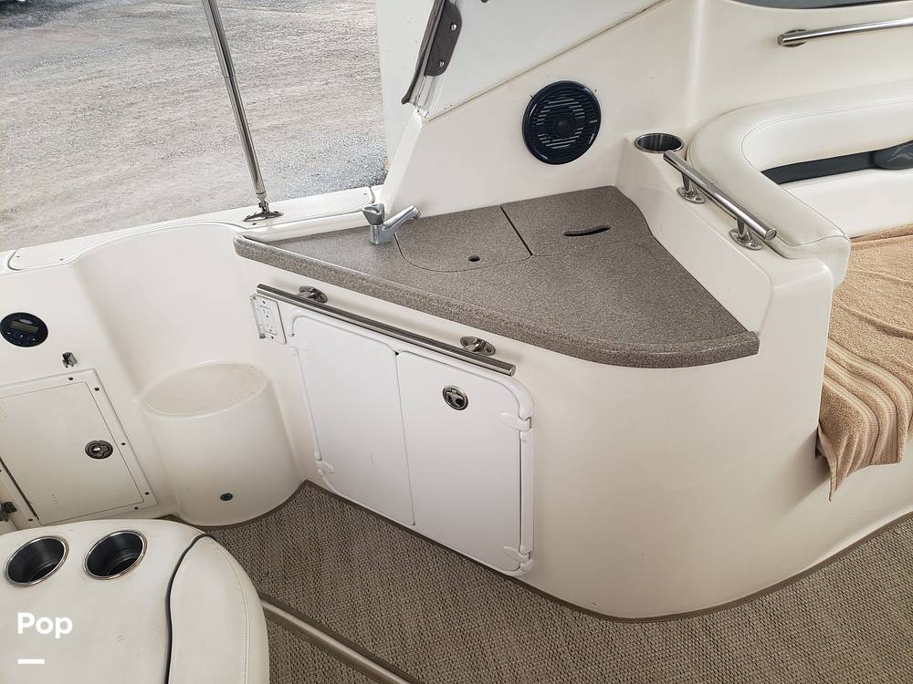 From the swim platform, which has a matt carpet, a storage garage, shore power, and a battery switch in the walk-through transom door, you enter a cockpit with side seating, transom seating, a wetbar with a sink, and under-cushion storage.