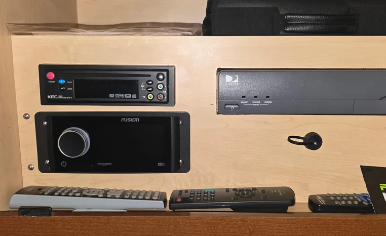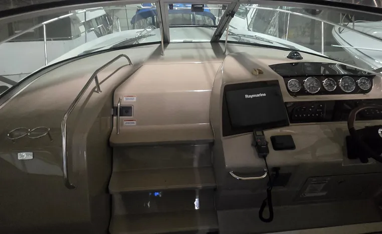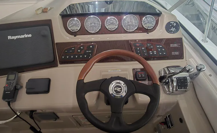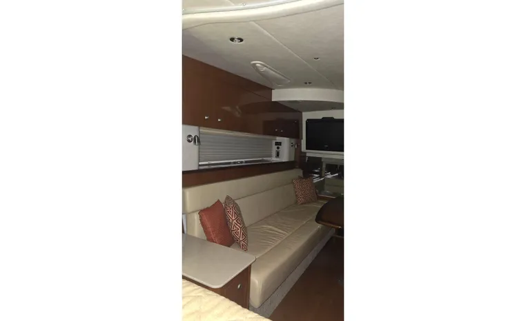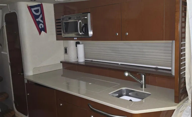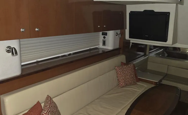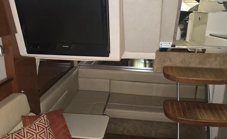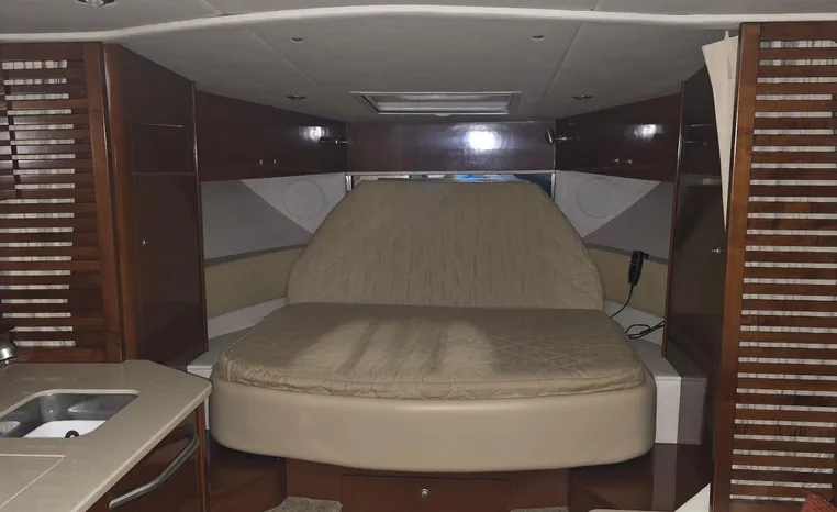 The 350 Sundancer. The generous dimensions of this express-style boat make it exceptionally qualified for cruising and entertaining, and an extensive list of sterndrives or inboards, gas or diesel, lets you choose your preferred power. A roomy interior with forward V-berth, big mid-stateroom and convertible salon sofa can sleep six in comfort. Plus there's a full galley and head, and a 26-inch flatscreen TV with remote DVD player.