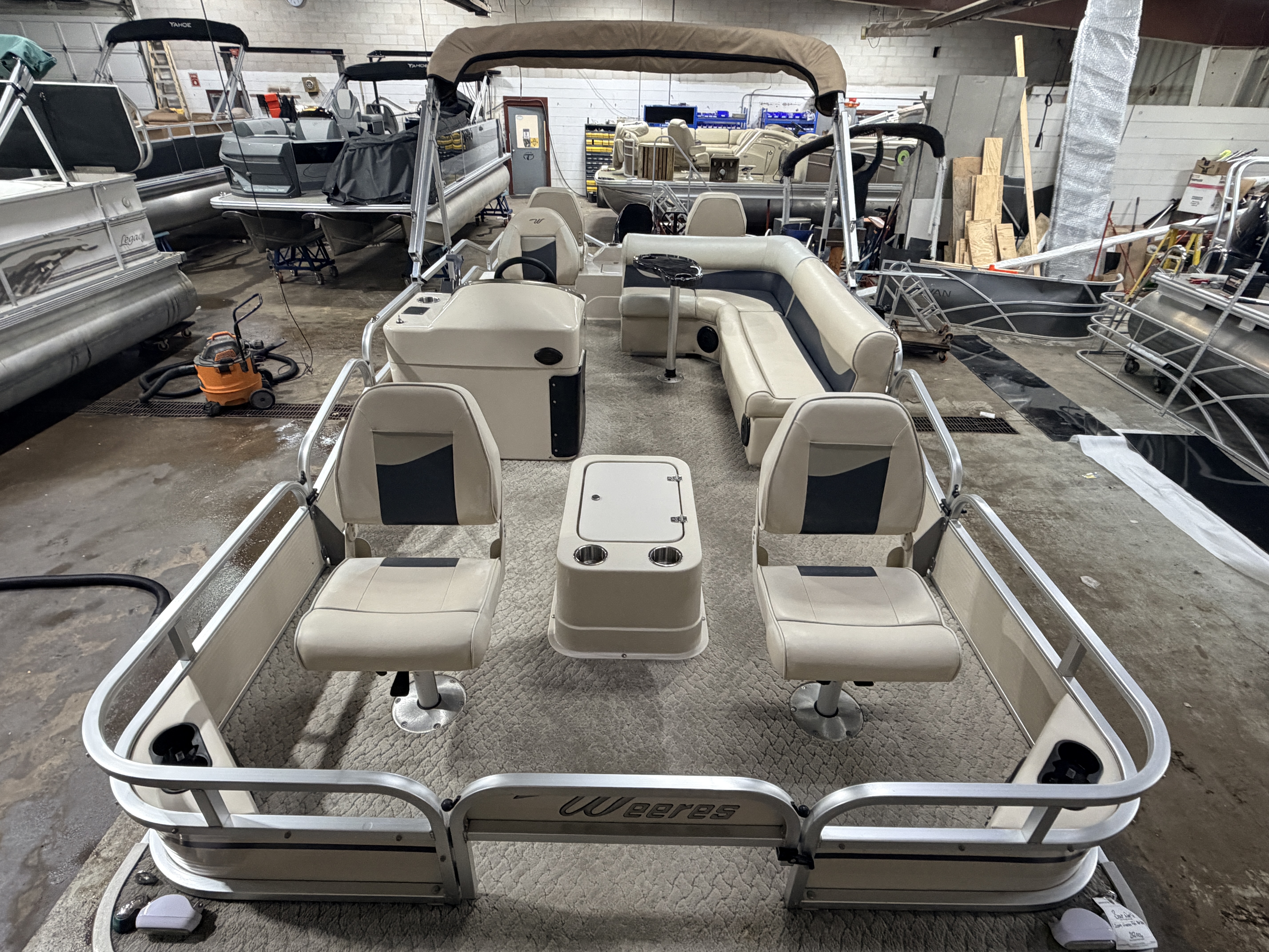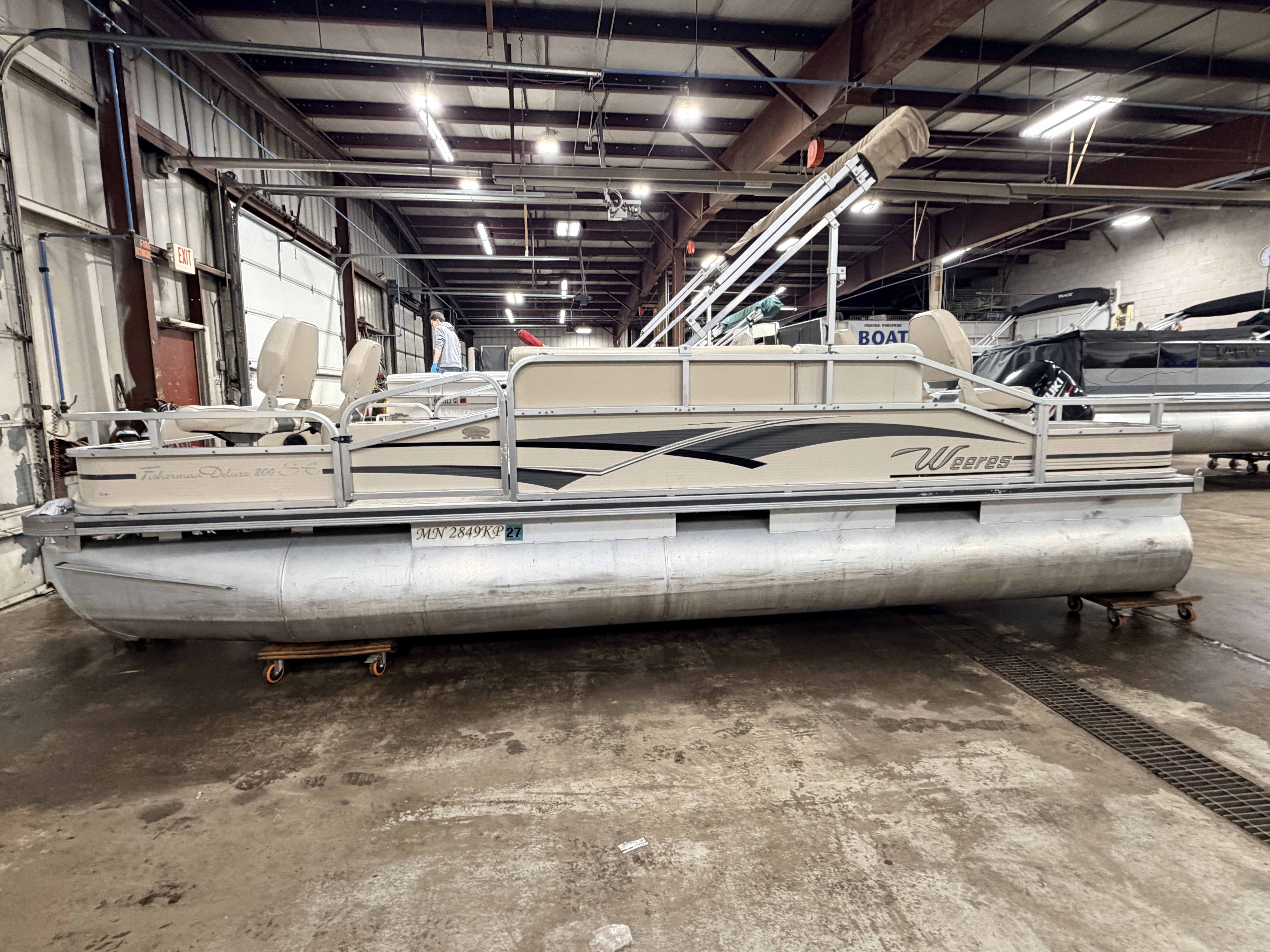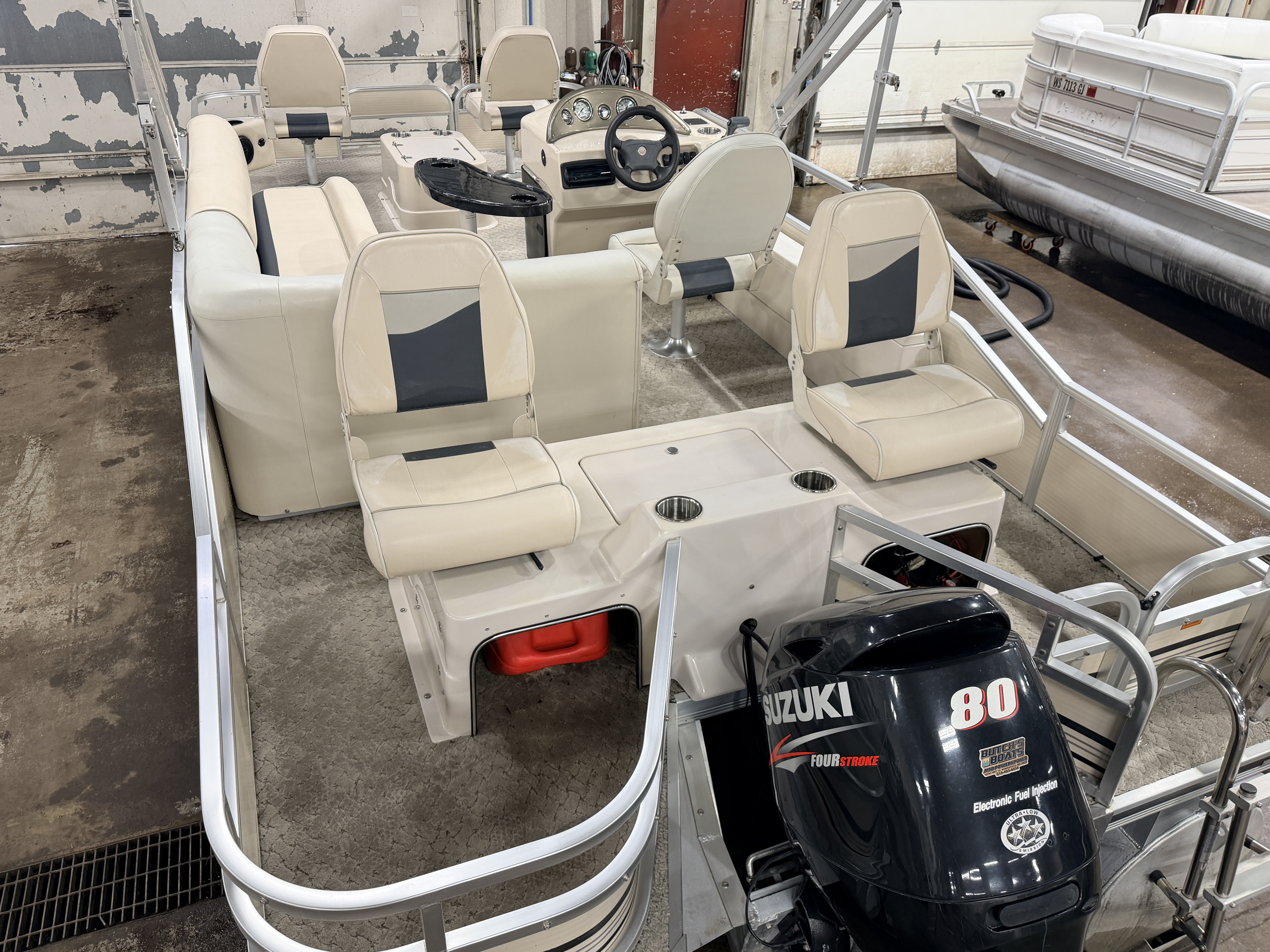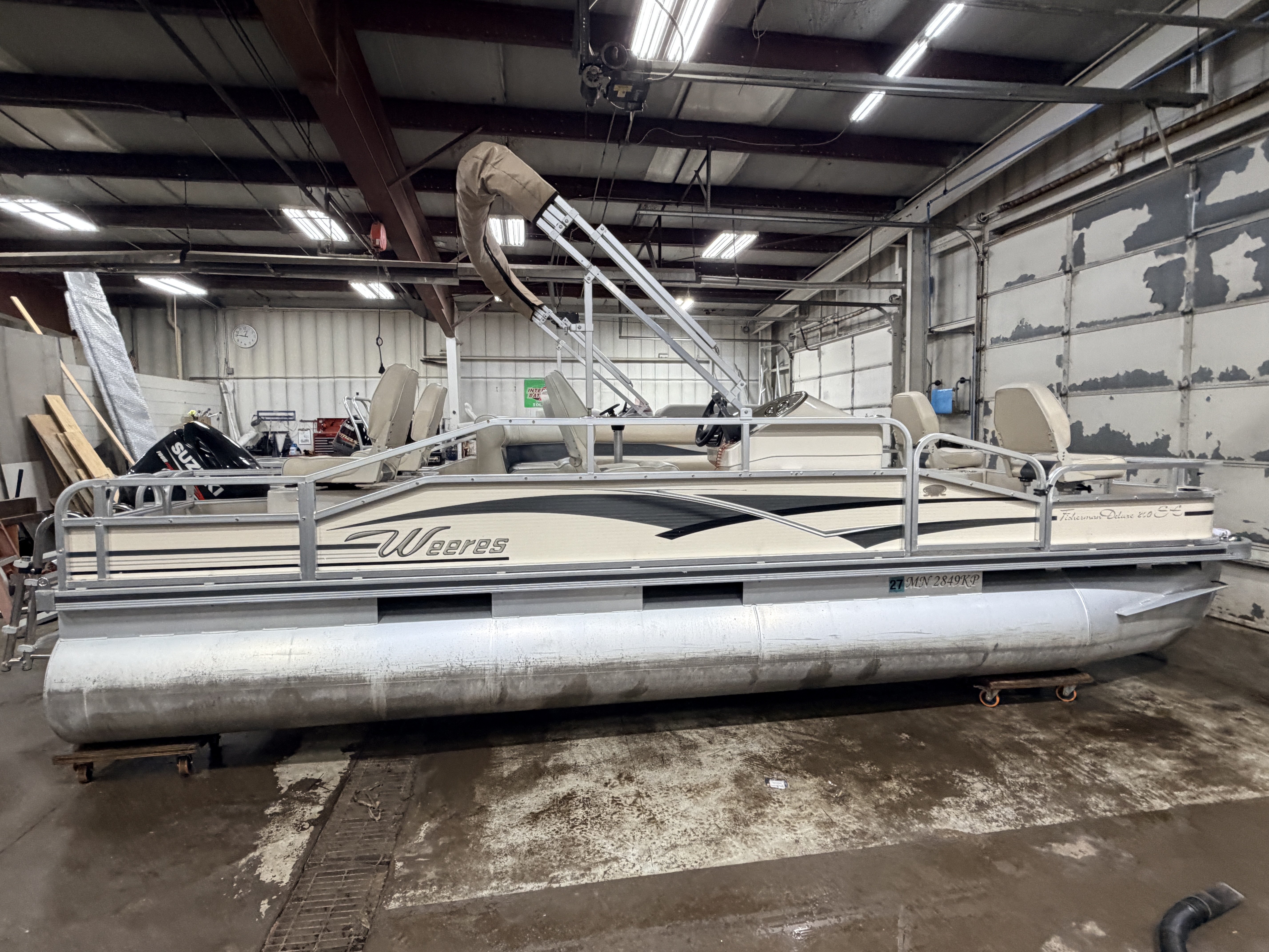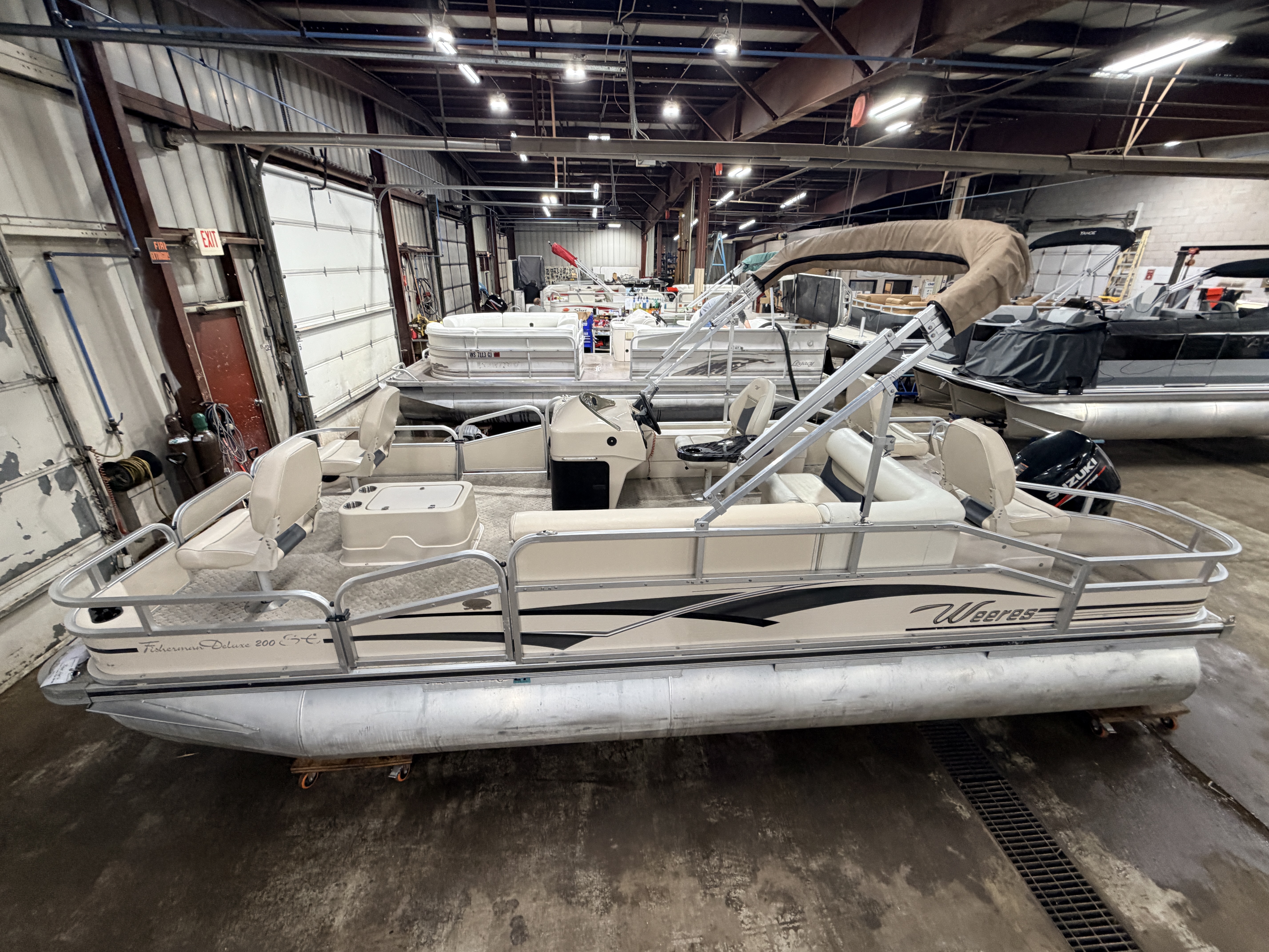 2009 Weeres Fisherman 200 Deluxe & 80HP Suzuki 4Stroke. Quad fish layout with 4 fishing seats, L-shaped couch, and captain's chair. Features 2 livewells, 4 entry gates, table, bimini top, courtesy light, Docking lights, Sony stereo, Speedometer, Tachometer, Volt and Trim gauges. This pontoon also features rod storage, rear facing docking lights and fold down swim ladder.