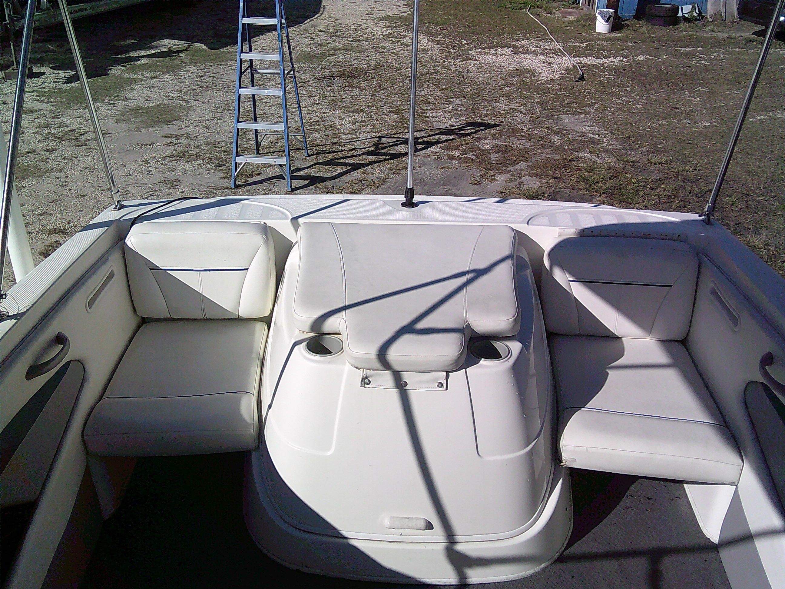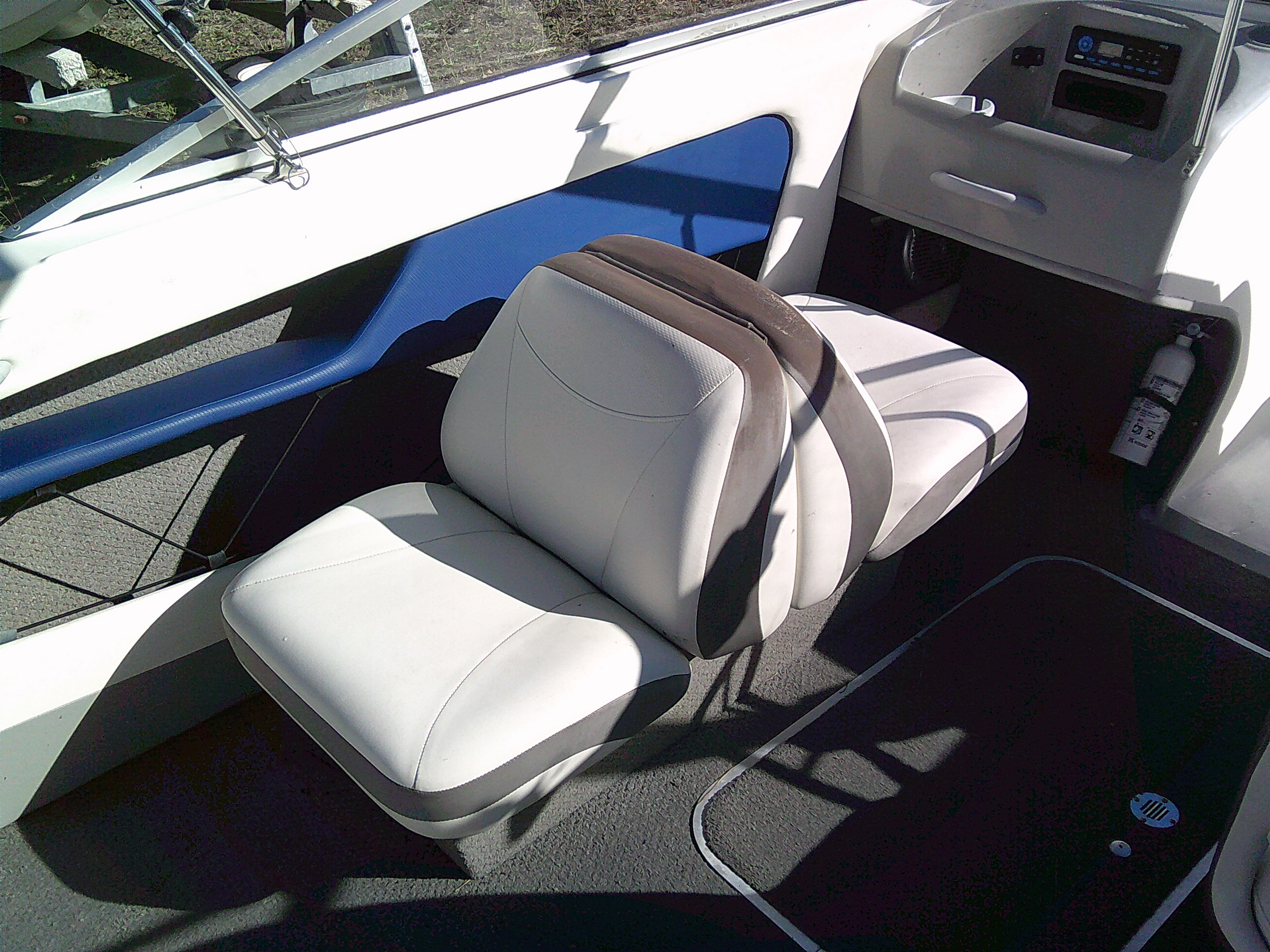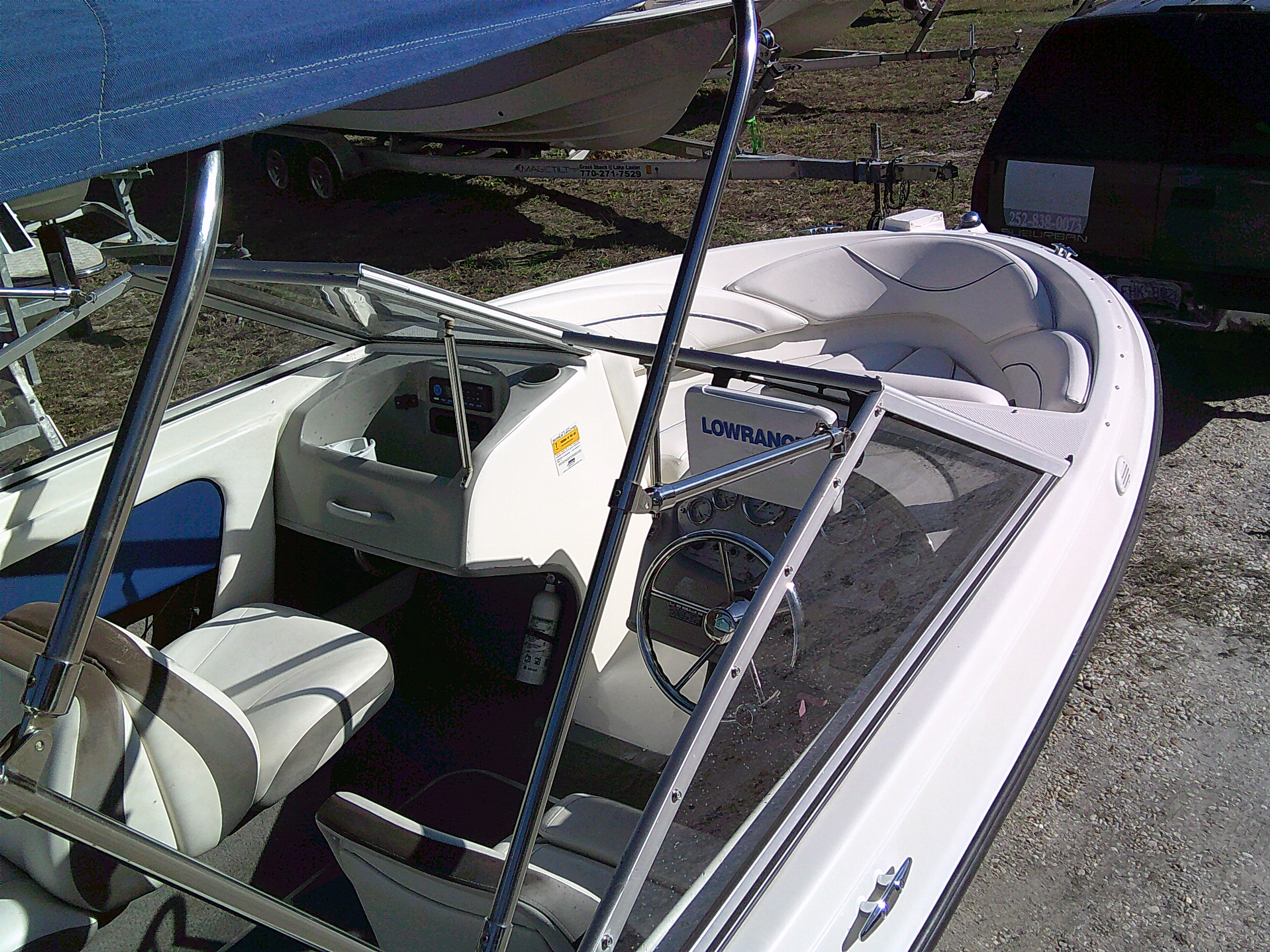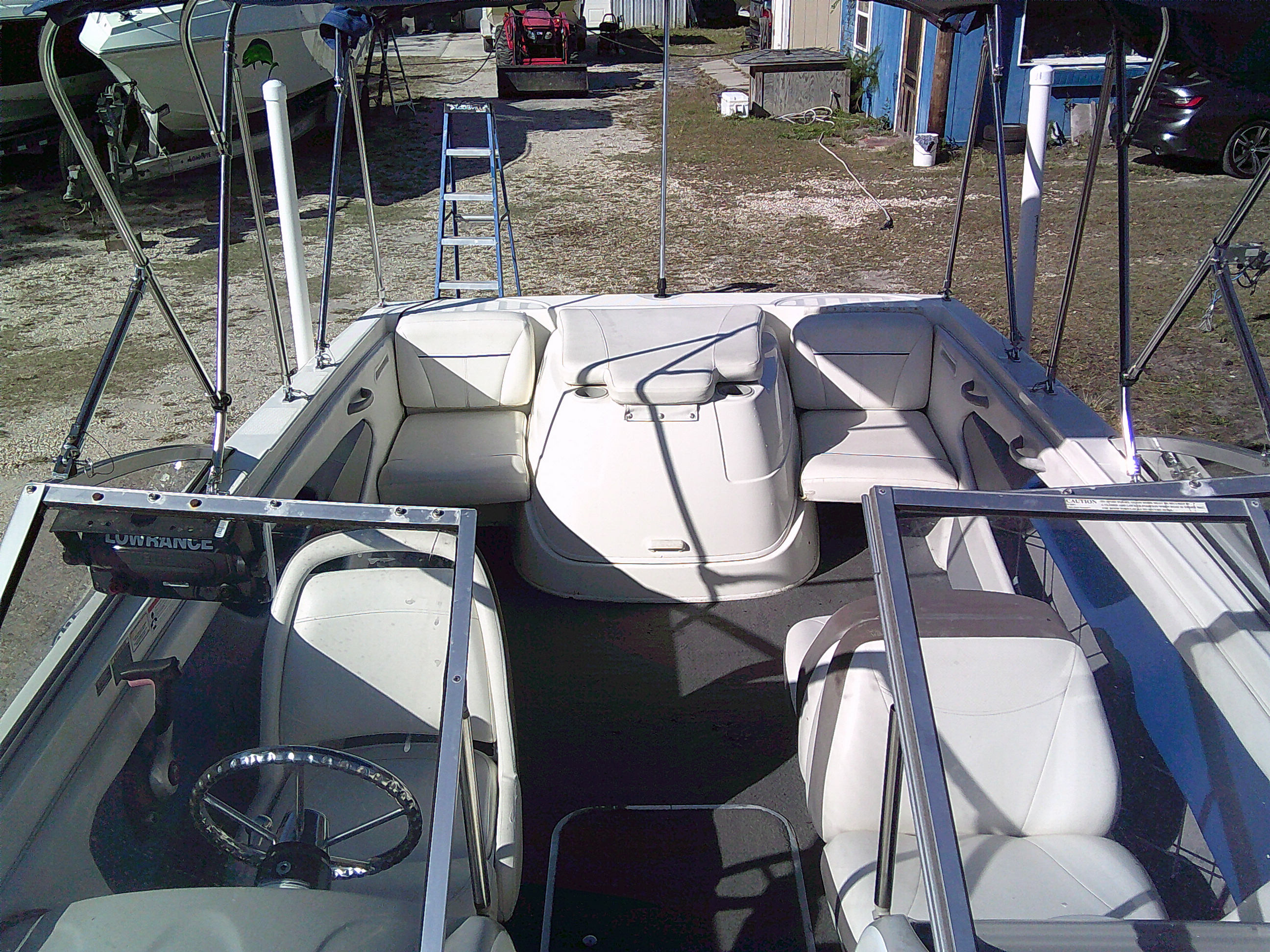 Vessel Info: Cushioned Forward Seating w/Back Rest, Storage and Cup Holders / Walk Through w/Folding Wind Screen / Helm Console w/ Gauges, Controls, Switch Panel, Hydraulic Steering / Cushioned Adjustable Helm Chair w/Folding Bolster / Passenger Console w/Storage and Passenger Cushioned Folding Seat / Large In Deck Storage Compartment / Under Gunner Storage / 2 Bimini Tops w/Forward Curtains / 2 Aft Cushioned Jump Seats w/Back Rest / Cushioned Engine Cover w/Cup Holders / Large Aft Swim Platform w/ Ski Bar and Swim Ladder