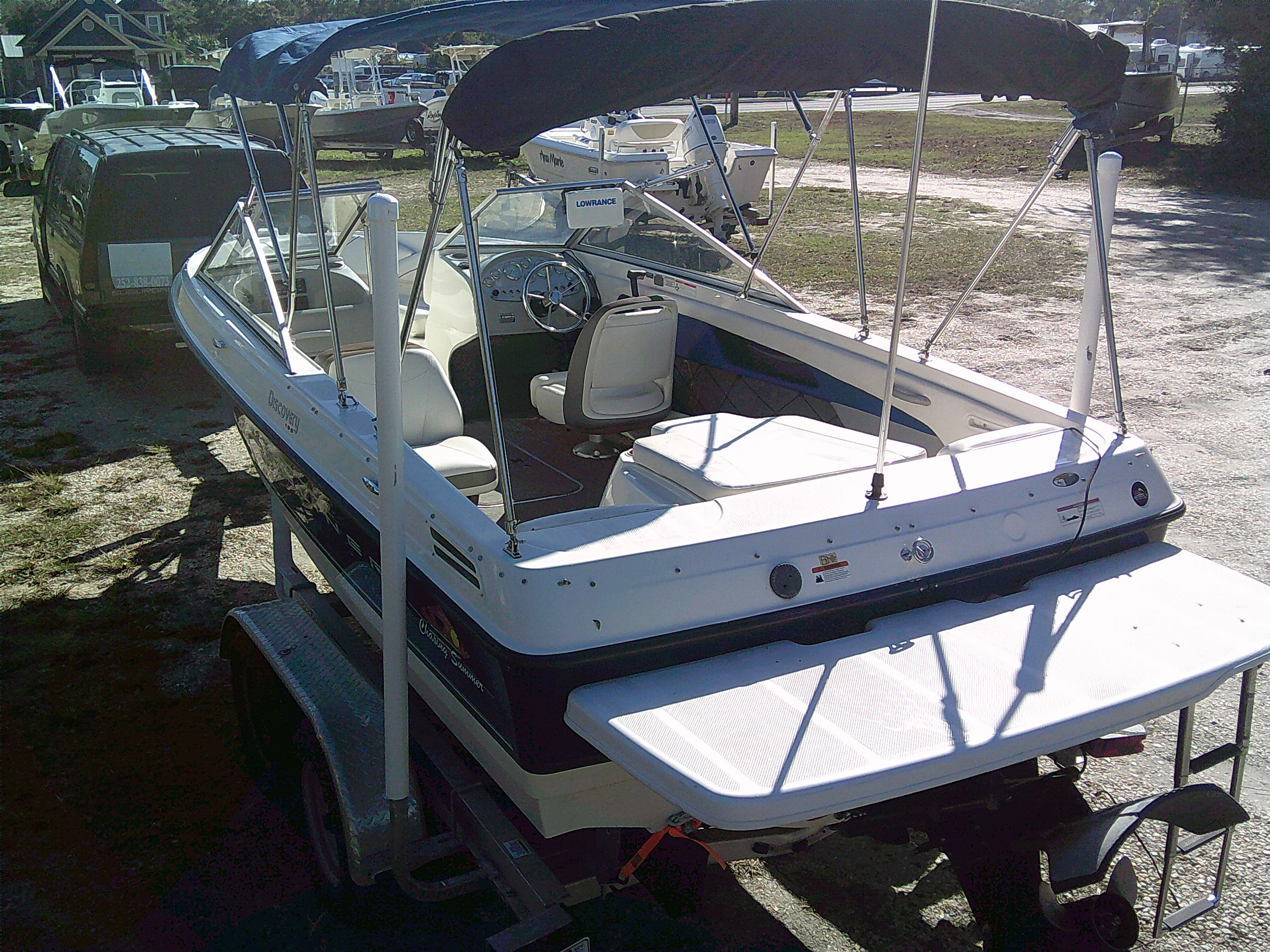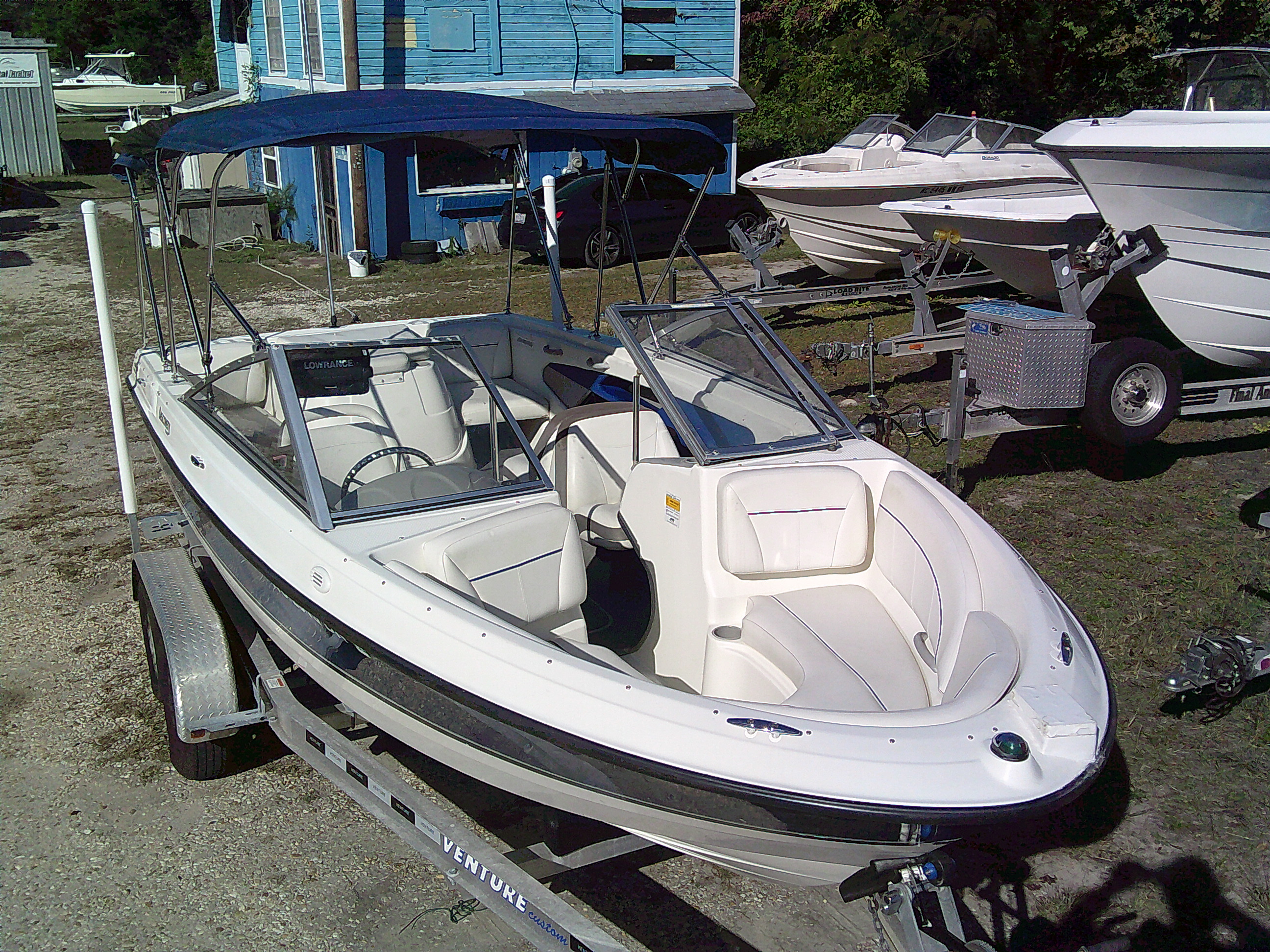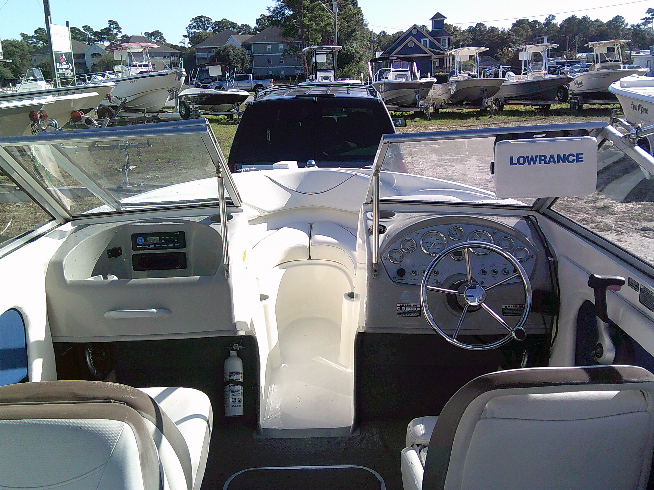 Vessel Info: Cushioned Forward Seating w/Back Rest, Storage and Cup Holders / Walk Through w/Folding Wind Screen / Helm Console w/ Gauges, Controls, Switch Panel, Hydraulic Steering / Cushioned Adjustable Helm Chair w/Folding Bolster / Passenger Console w/Storage and Passenger Cushioned Folding Seat / Large In Deck Storage Compartment / Under Gunner Storage / 2 Bimini Tops w/Forward Curtains / 2 Aft Cushioned Jump Seats w/Back Rest / Cushioned Engine Cover w/Cup Holders / Large Aft Swim Platform w/ Ski Bar and Swim Ladder