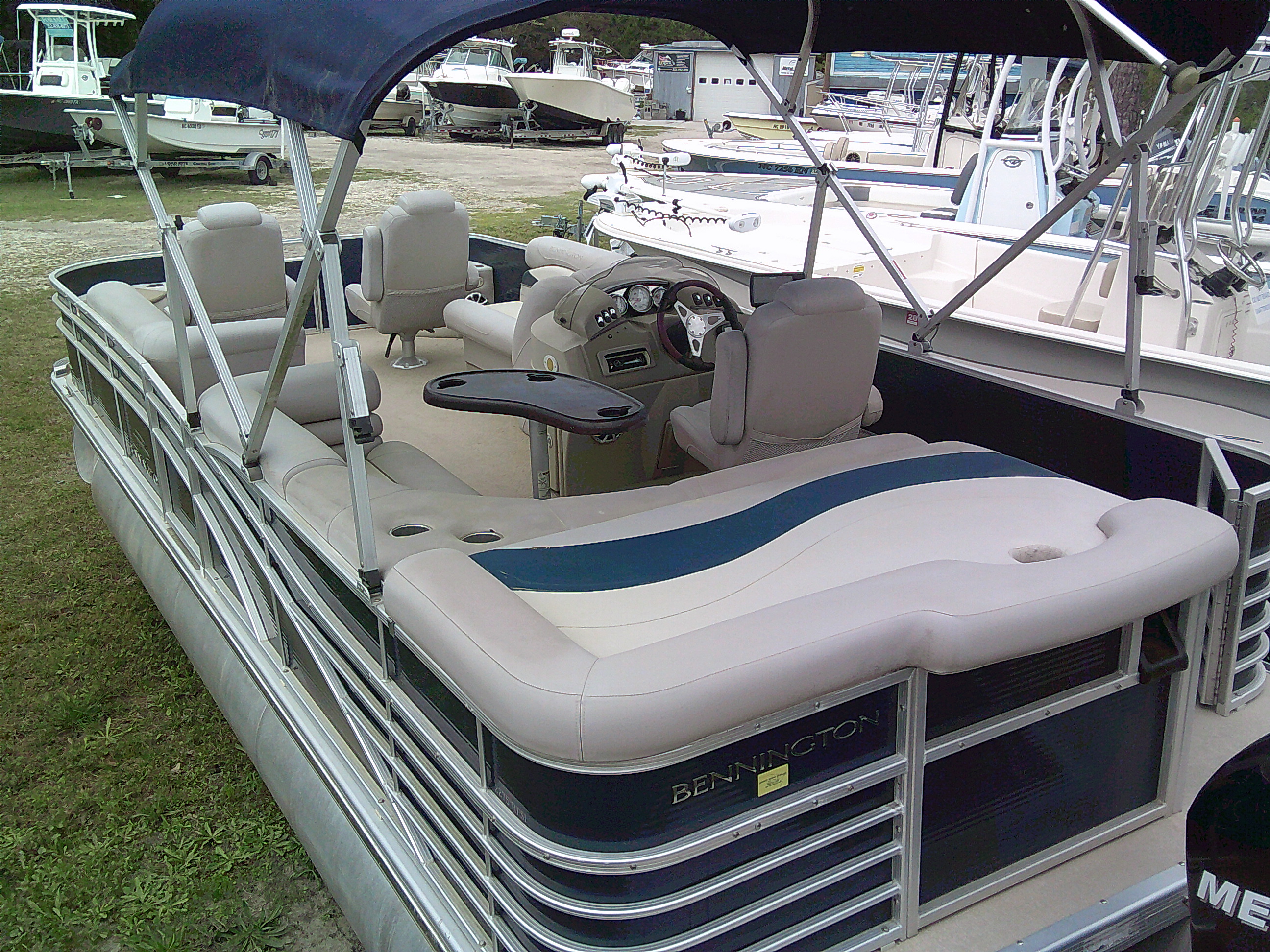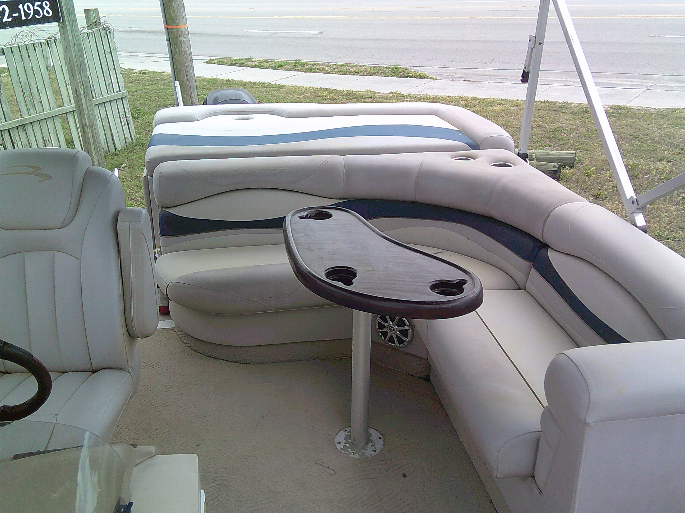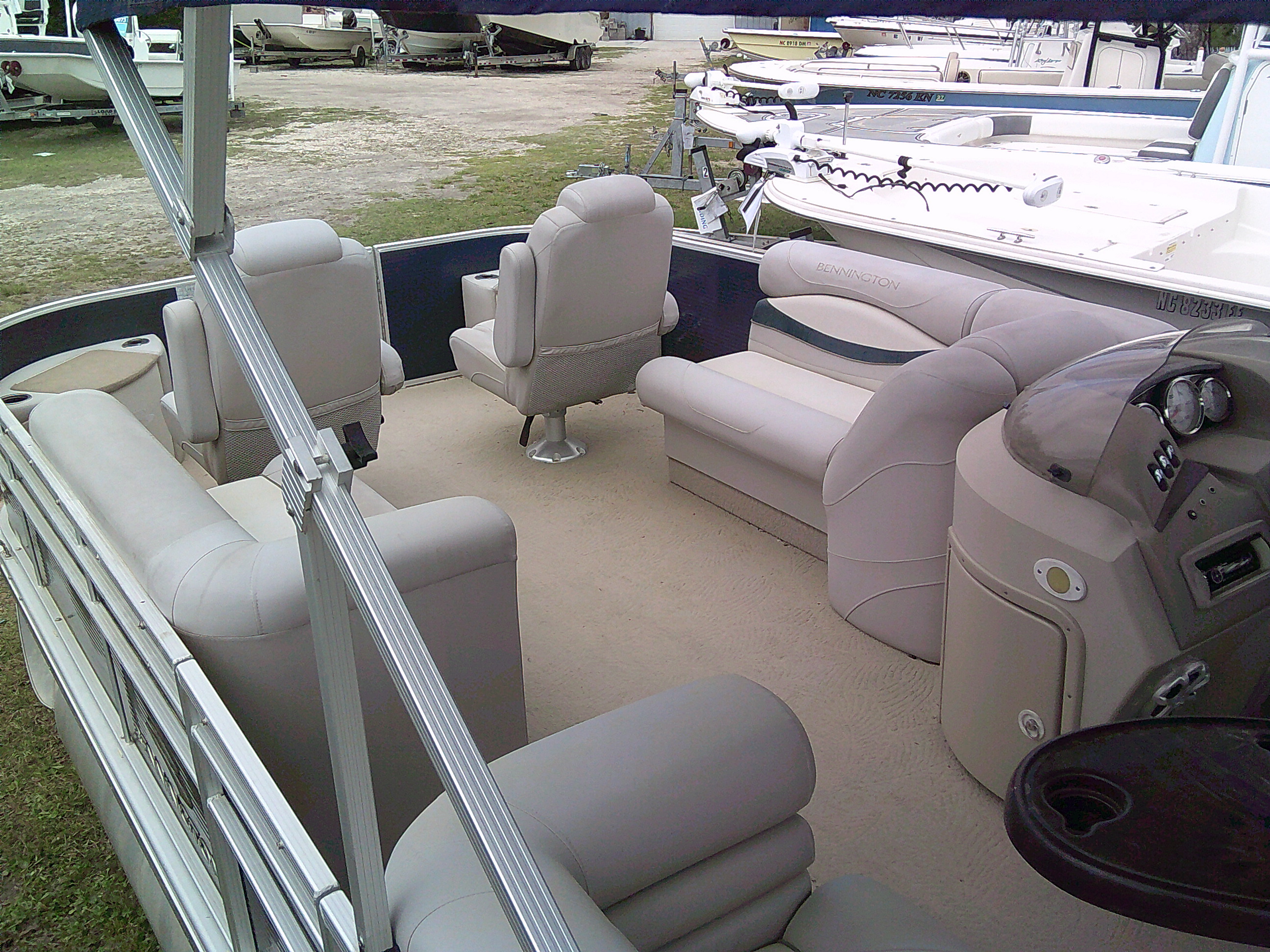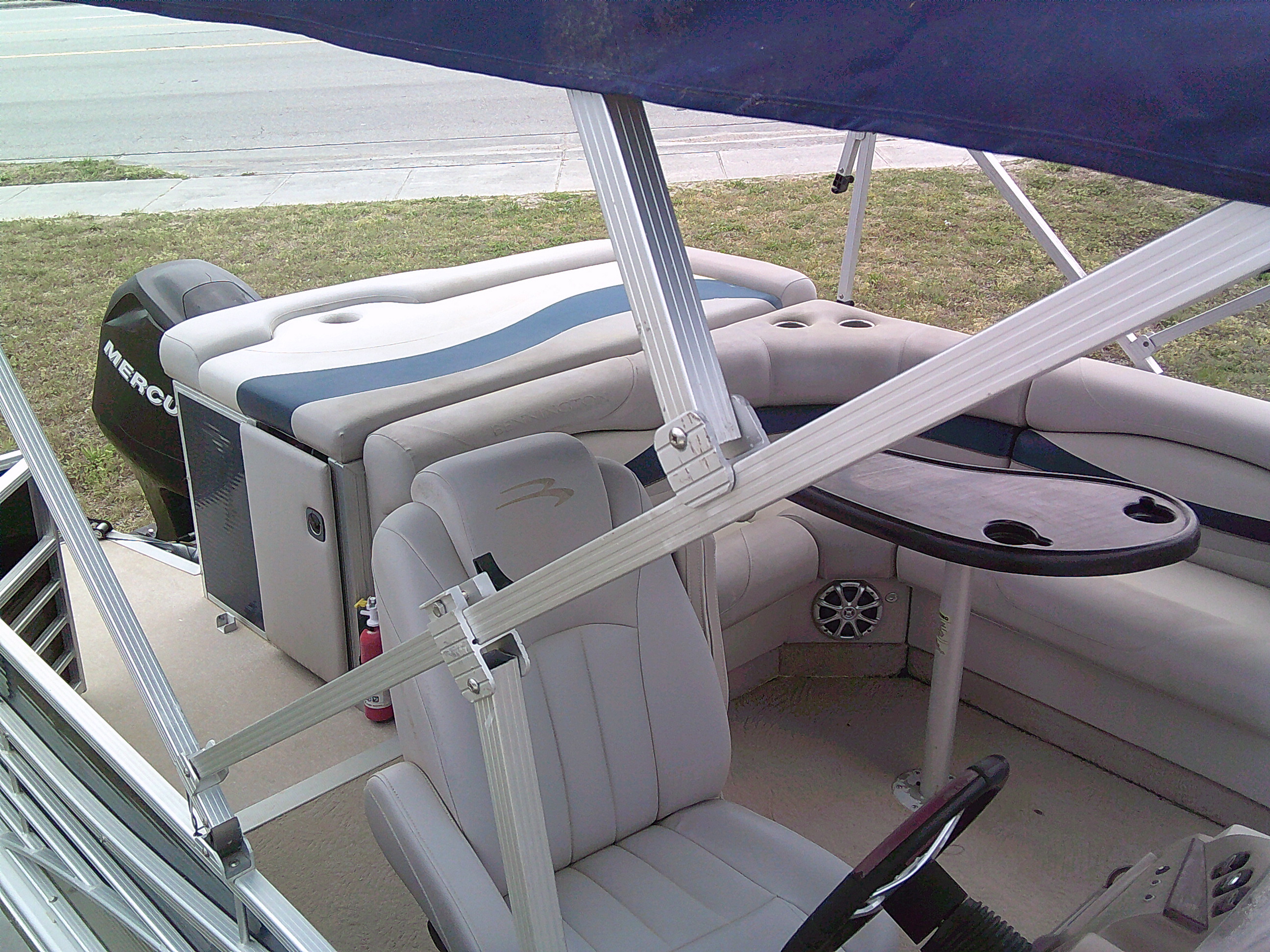Vessel Info: Forward Entry Gate / 2 Forward Storage Boxes w/Rod Holders, 2 Cup Holders, 2 Kicker Speakers / 2 Forward Cushioned Adjustable Chairs w/Folding Arm Rest / 2 Forward Cushioned Bench/Recliner Seats w/Back Rest, Storage / Port Side Entry Gate / Console w/Wind Screen, Tilt Helm, Gauges, Controls, Switch Panel, Storage, Cup Holders, Kicker Speaker / Cushioned Adjustable Captain Chair w/Folding Arm Rest / Large Bimini Top w/Boot / Cushioned Aft Wrap-A-Round Seating w/Back Rest, Storage, Live-Well / Removable Table w/Cup Holders / Large Cushioned Aft Storage Compartment w/Changing Station, Privacy Curtain and Enough Room for a Porta- Potty / Aft Entry Gate w/Swim Platform, Folding Ladder / Full Boat Cover
