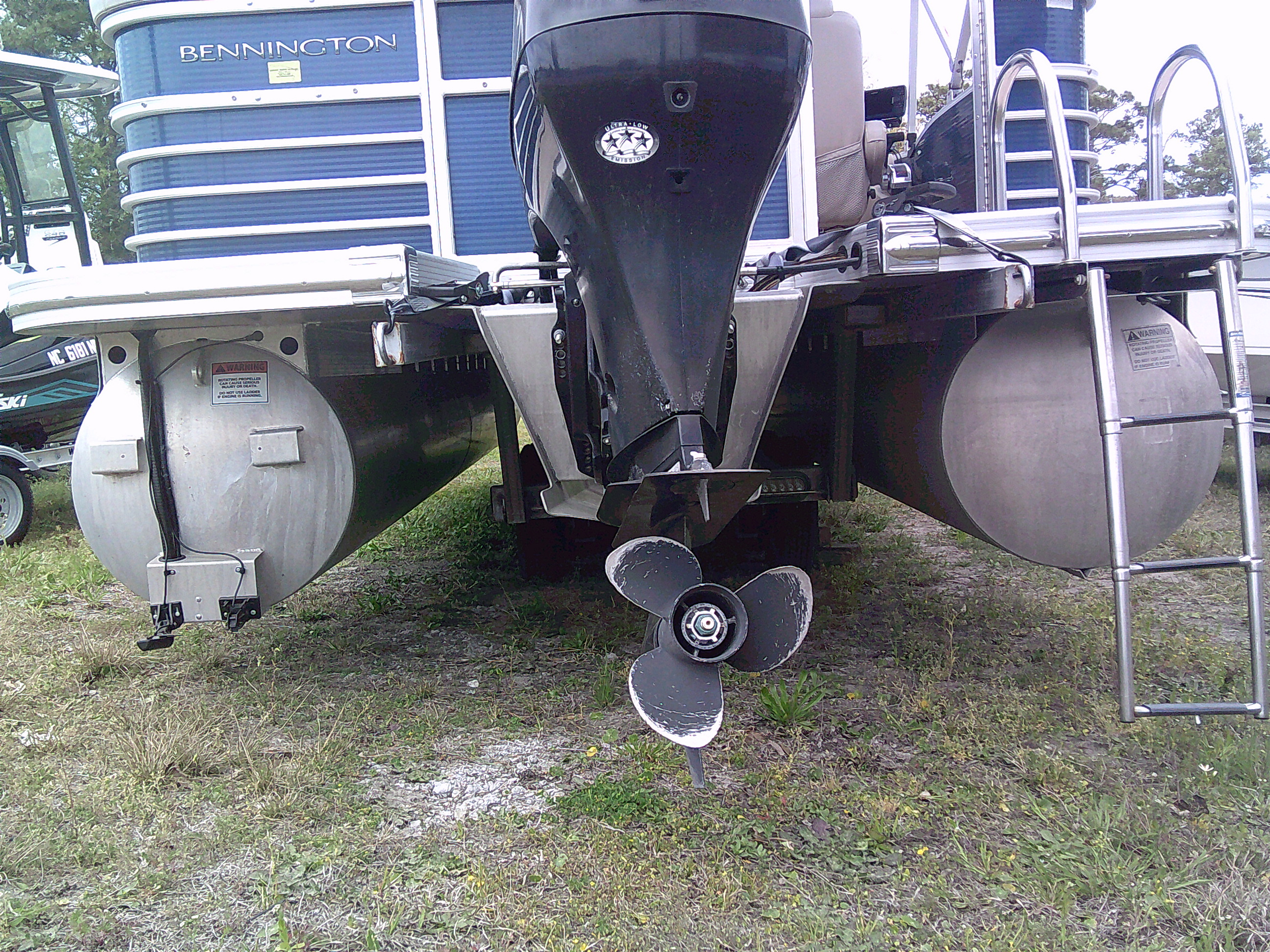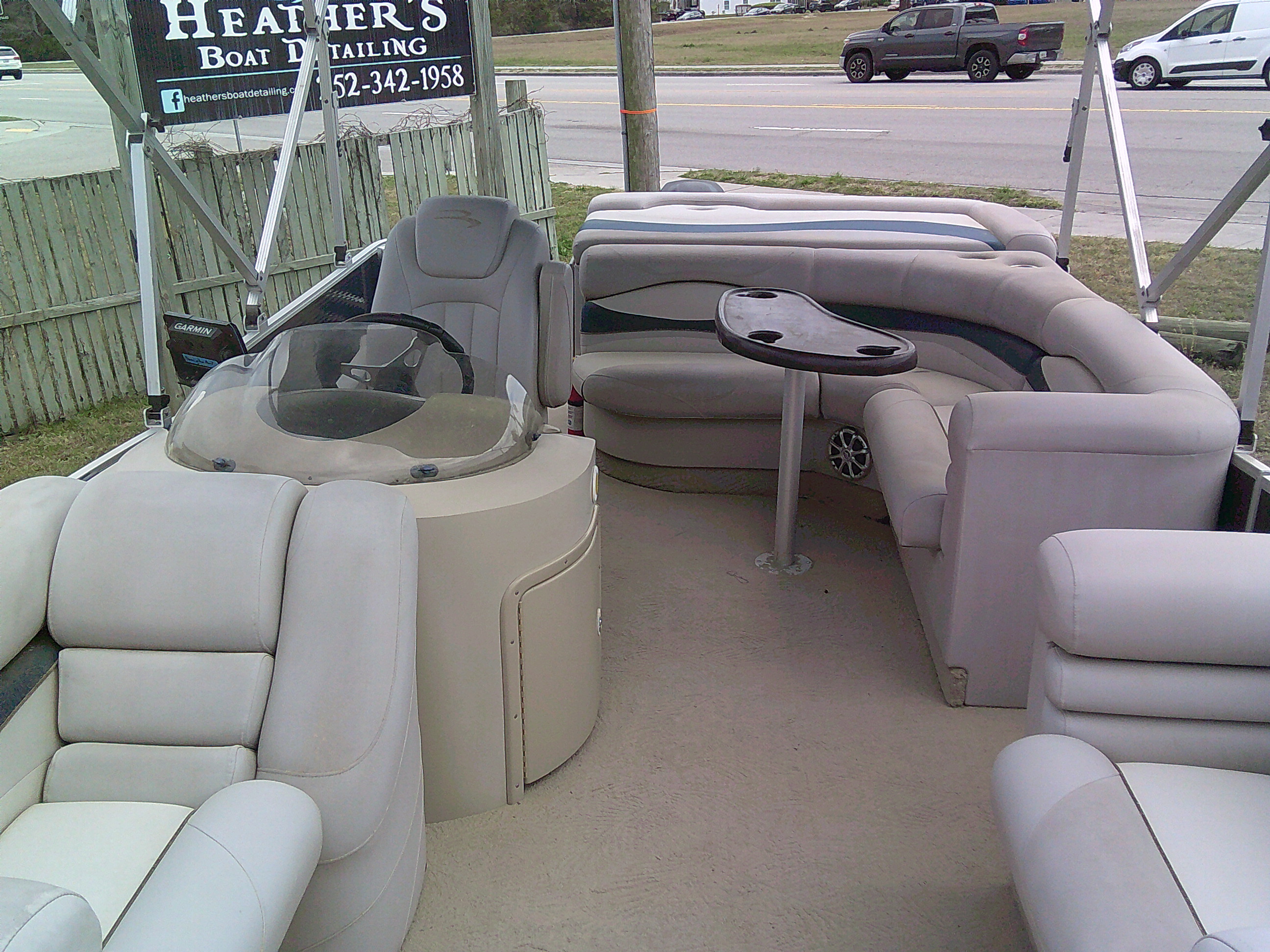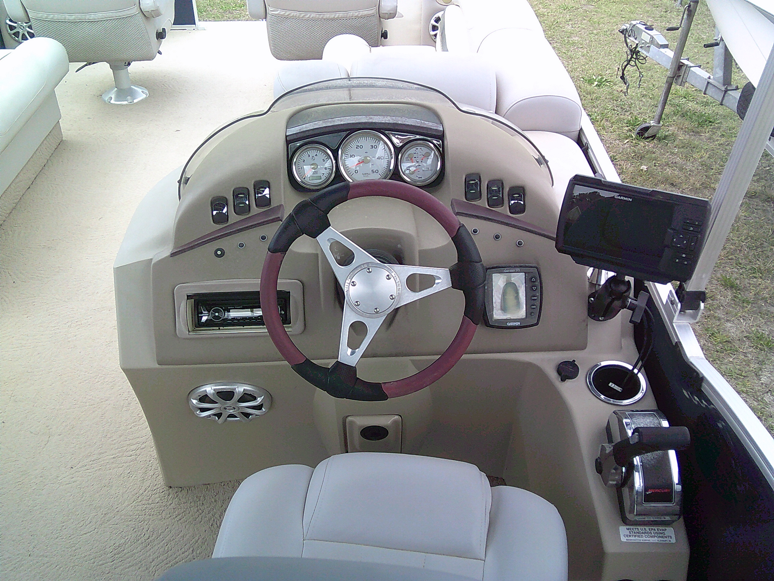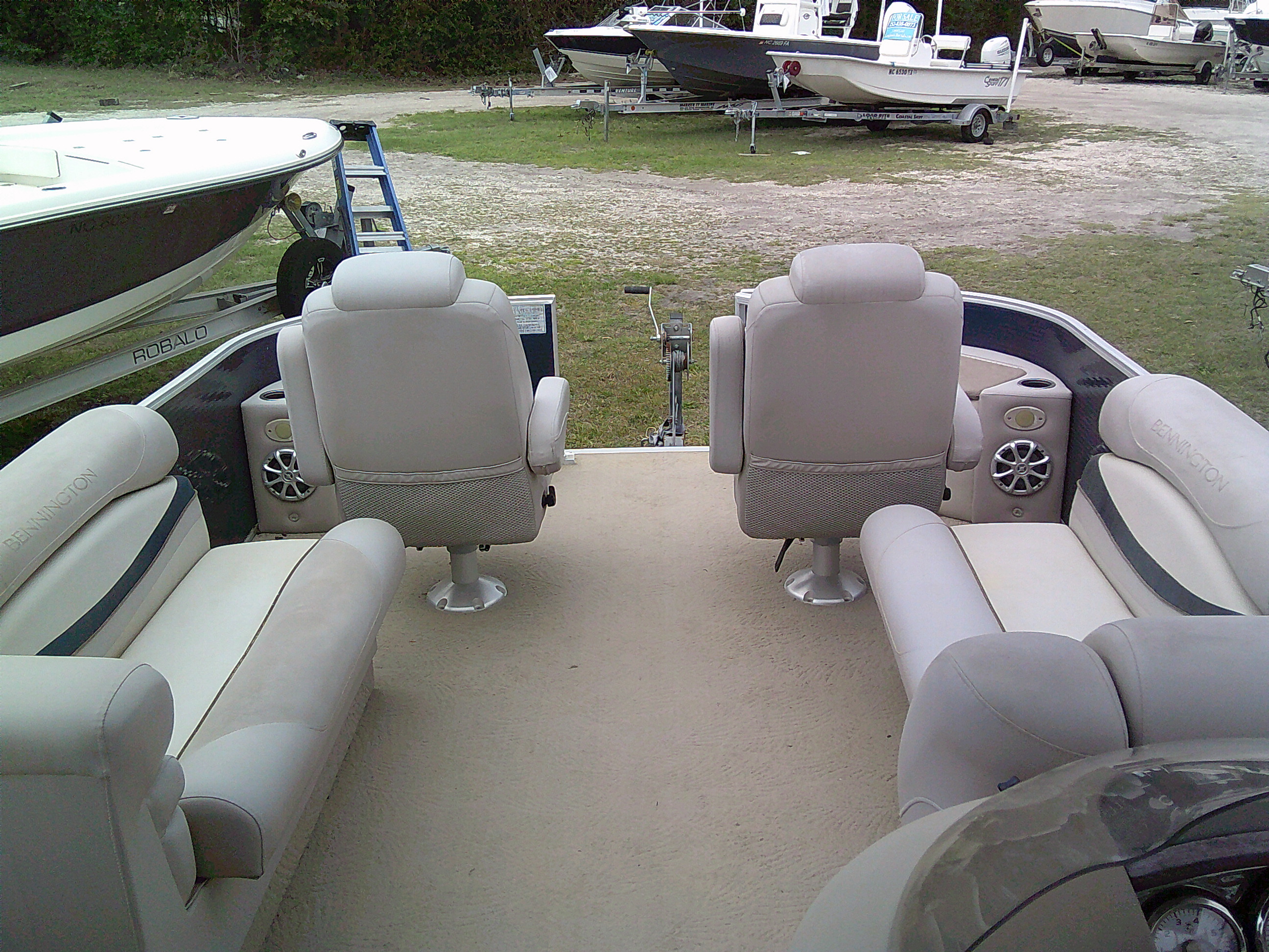 Vessel Info: Forward Entry Gate / 2 Forward Storage Boxes w/Rod Holders, 2 Cup Holders, 2 Kicker Speakers / 2 Forward Cushioned Adjustable Chairs w/Folding Arm Rest / 2 Forward Cushioned Bench/Recliner Seats w/Back Rest, Storage / Port Side Entry Gate / Console w/Wind Screen, Tilt Helm, Gauges, Controls, Switch Panel, Storage, Cup Holders, Kicker Speaker / Cushioned Adjustable Captain Chair w/Folding Arm Rest / Large Bimini Top w/Boot / Cushioned Aft Wrap-A-Round Seating w/Back Rest, Storage, Live-Well / Removable Table w/Cup Holders / Large Cushioned Aft Storage Compartment w/Changing Station, Privacy Curtain and Enough Room for a Porta- Potty / Aft Entry Gate w/Swim Platform, Folding Ladder / Full Boat Cover