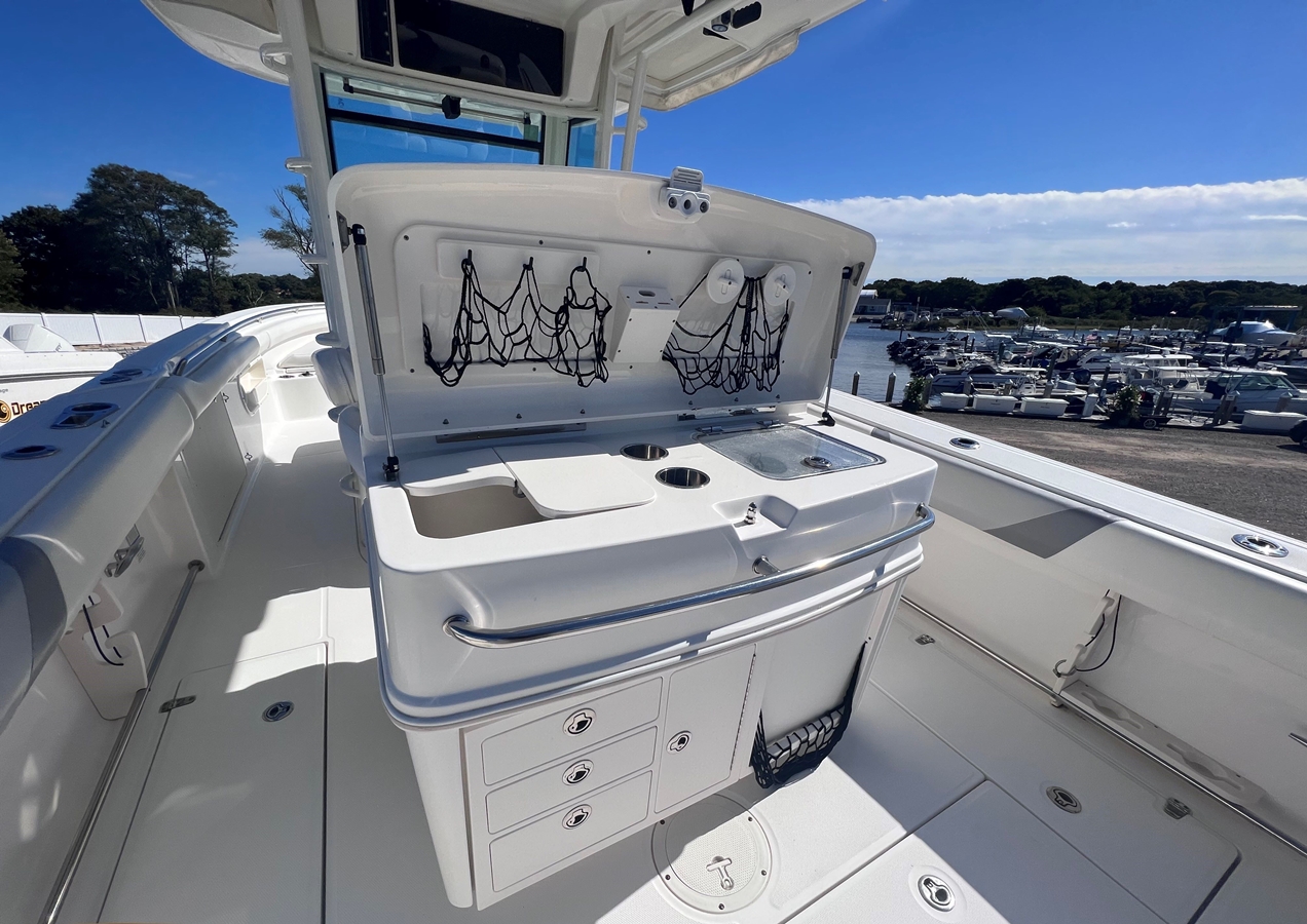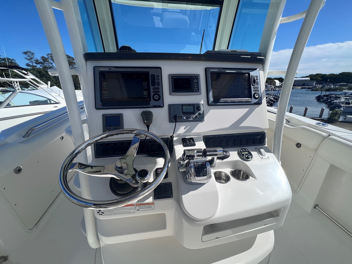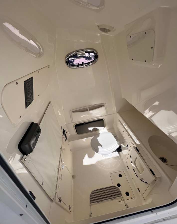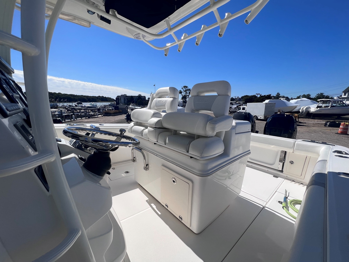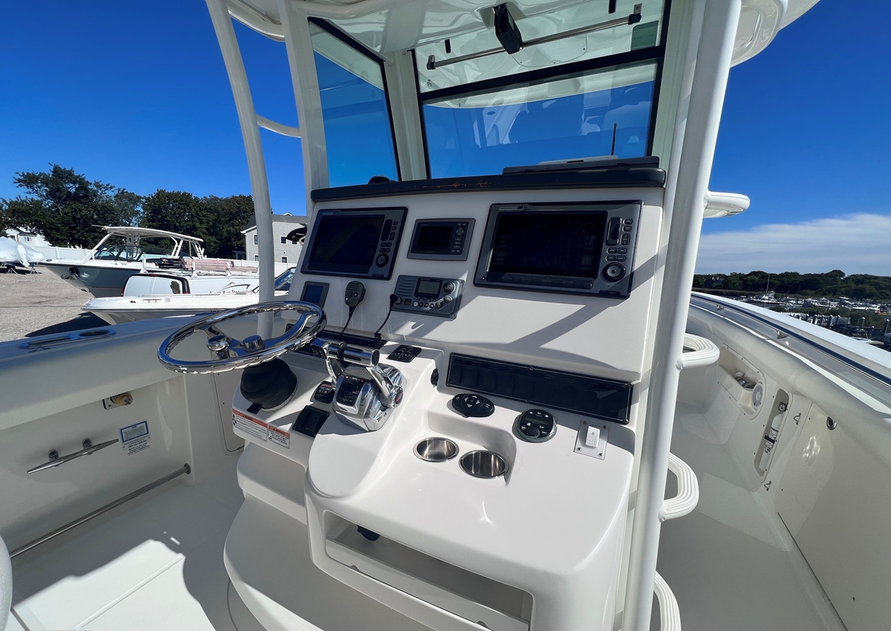 Options: White hull, heavy duty rub rail, electric trim tabs w/ indicator, covered telescoping swim ladder w/ SS grab rail, (3) transom mounted rod holders, transom door w/ SS latch, shorepower w/ battery charger & galvanic isolator, transom shower, port aft 20 gallon livewell, cockpit coaming bolsters, foldaway stern bench seat, (2) aftinsulated floor fishboxes w/ pumpout, SS toe rails w/ downrigger weight holders, (6) gunnel mounted rod holders, deluxe leaning post w/ livewell, prep station, freshwater sink, cutting board & aft storage net, helm & companion bolster style seats, hardtop w/ electronics box, lifejacket storage, (5) rod holders, & radial outriggers, 12V DC receptacle, cast SS steering wheel w/ knb, compass, tempered glass windshield w/ wiper, vacuflush toilet w/ ob discharge & dockside pumpout, fresh water shower in console, forward console seat w/ backrest, forward insulated in-floor fishbox w/ pumpout, forward deck seating w/ bolsters & (2) drink holders, anchor windlass w/ SS anchor & freshwater washdown, (3) lines, (2) fenders, fire extinguisher & throw cushion.